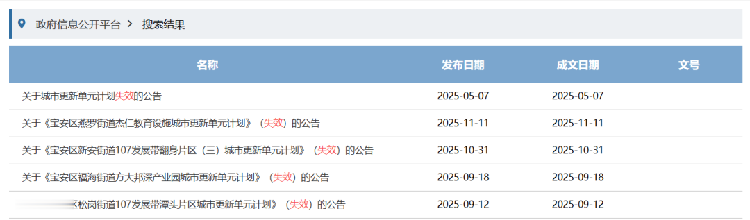 2025年9月至11月,宝安区就有4个城市更新项目计划接连失效,截至目前,宝安被除名项目达到16个,接近全市的一半。