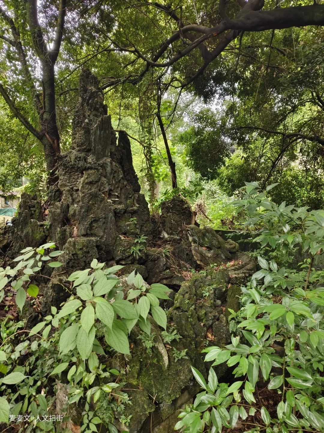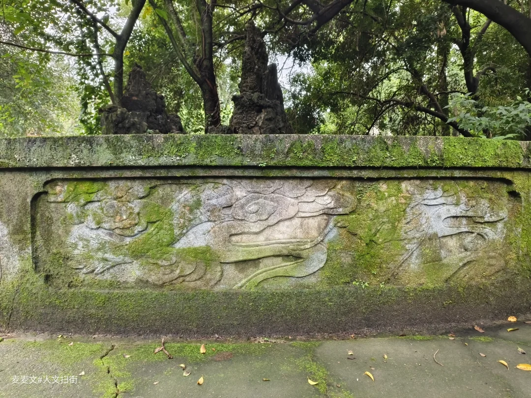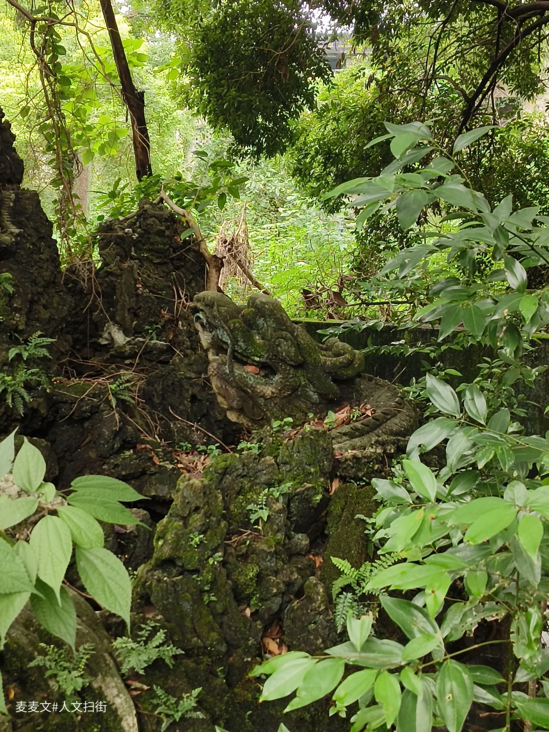 曾经威严的龙形雕塑,如今斑驳陆离,龙鳞长满青苔,眼神却依旧带着摄人的气势。假山上那座小小的寺庙,在草木簇拥下更显孤寂,仿佛在默默诉说着曾经的香火鼎盛。斑驳的石刻,文字图案模糊难辨,像是在守护着不为人知的秘密。
