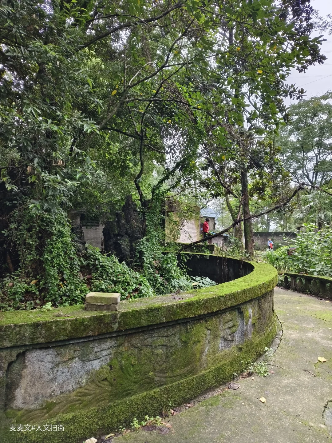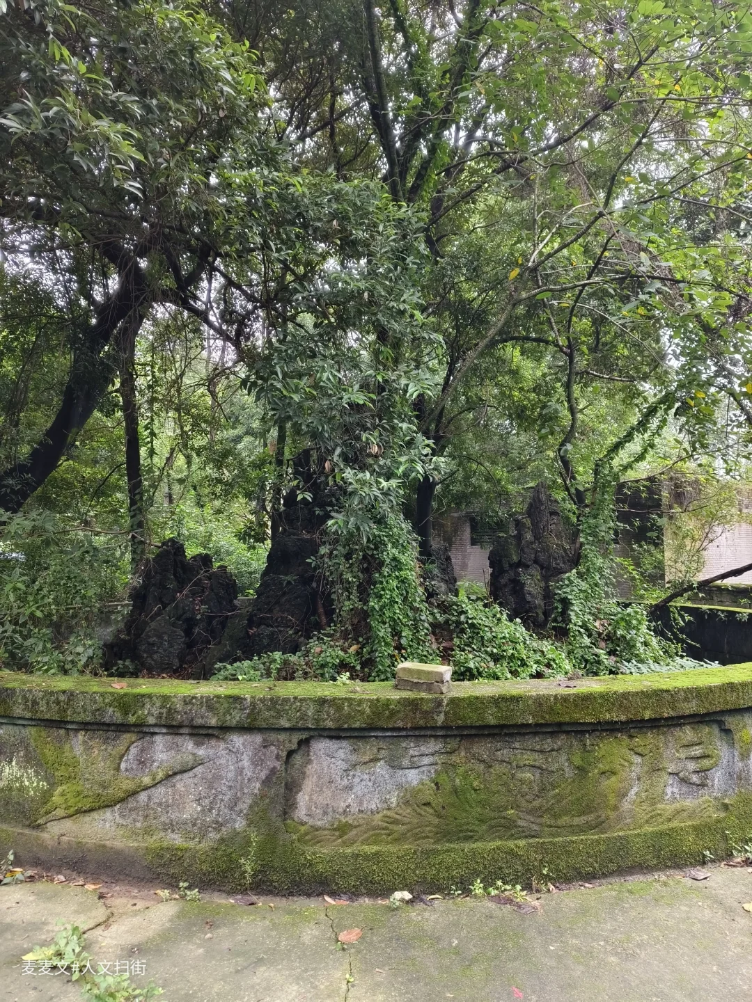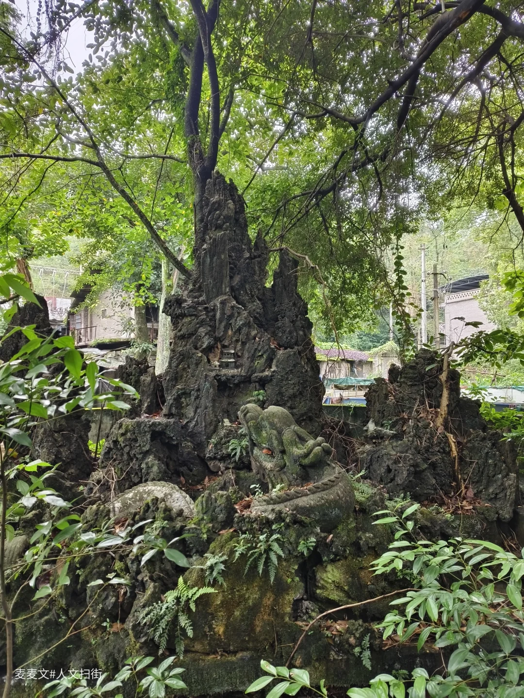 曾经威严的龙形雕塑,如今斑驳陆离,龙鳞长满青苔,眼神却依旧带着摄人的气势。假山上那座小小的寺庙,在草木簇拥下更显孤寂,仿佛在默默诉说着曾经的香火鼎盛。斑驳的石刻,文字图案模糊难辨,像是在守护着不为人知的秘密。
