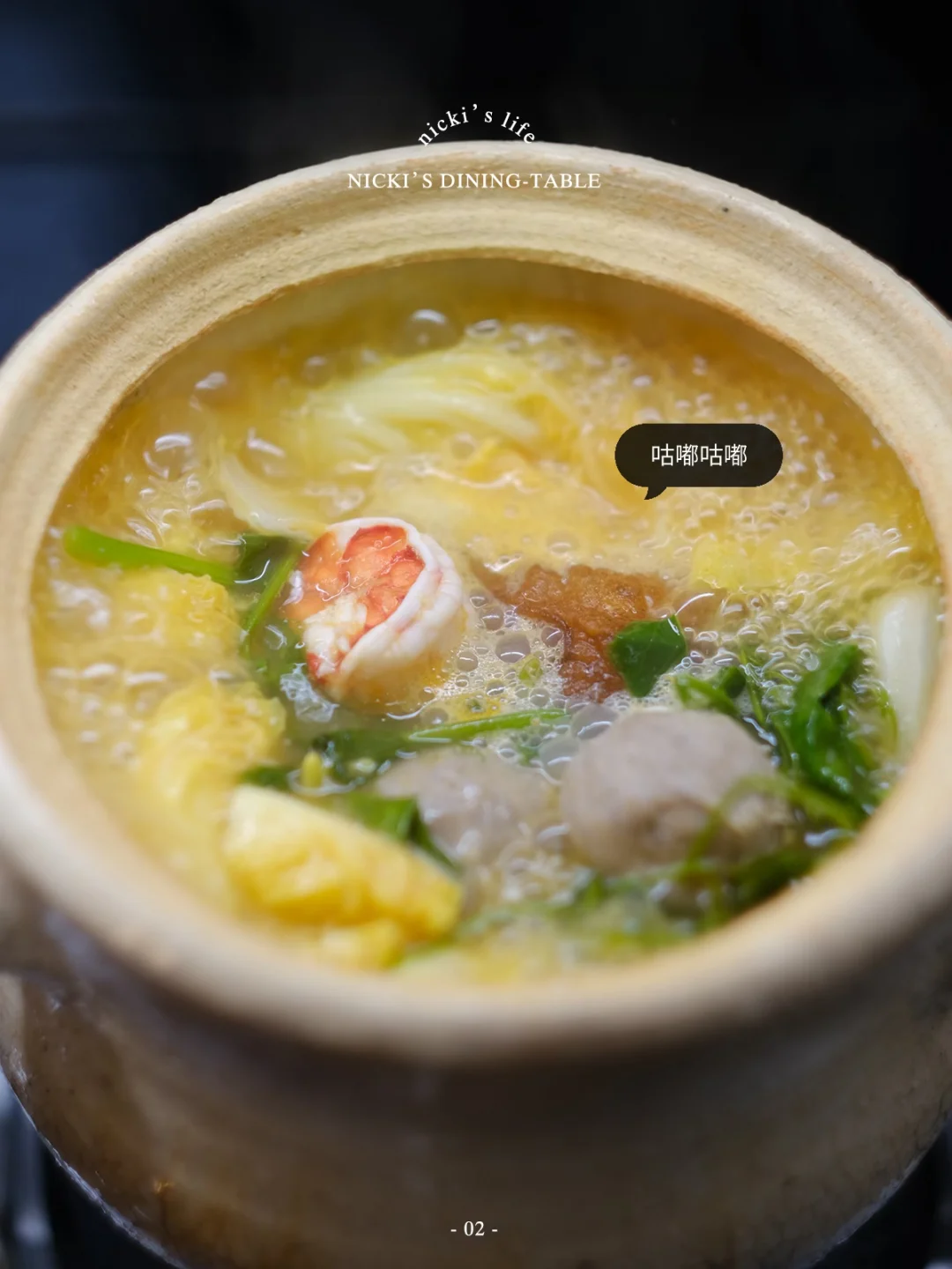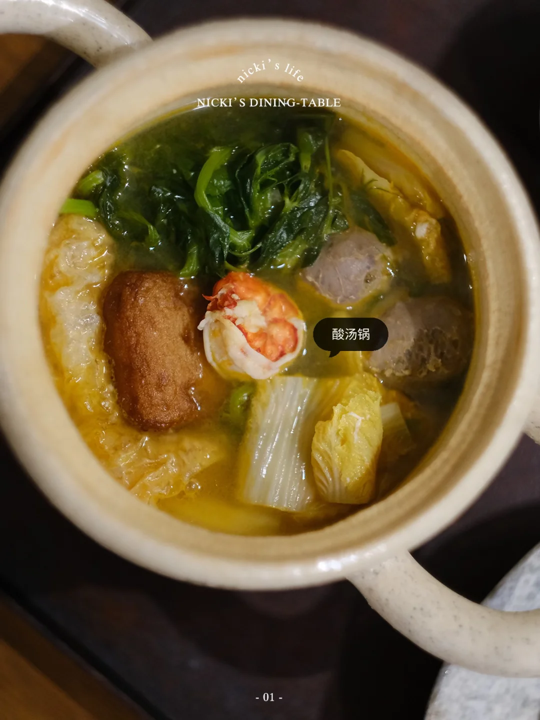 出差回来,着实被冷到。出发前还是衬衫,回来已是棉袄…天冷犯懒,做锅热汤,简单也暖和。 - 🔅今日c位菜单:酸汤虾锅🔅 •虾去壳,开背去虾线,锅中倒油炒虾头,炒至变色后加热水,煮10分钟左右,滤出虾汤。 •虾汤中加入酸汤料汁,煮开后放入虾饼、牛肉丸,煮3分钟左右,放入虾,撇去表面浮末,最后放入豌豆尖、娃娃菜,加少许盐调味。 🥗 菜单: -蘑菇番茄炒蛋 -酸汤虾锅