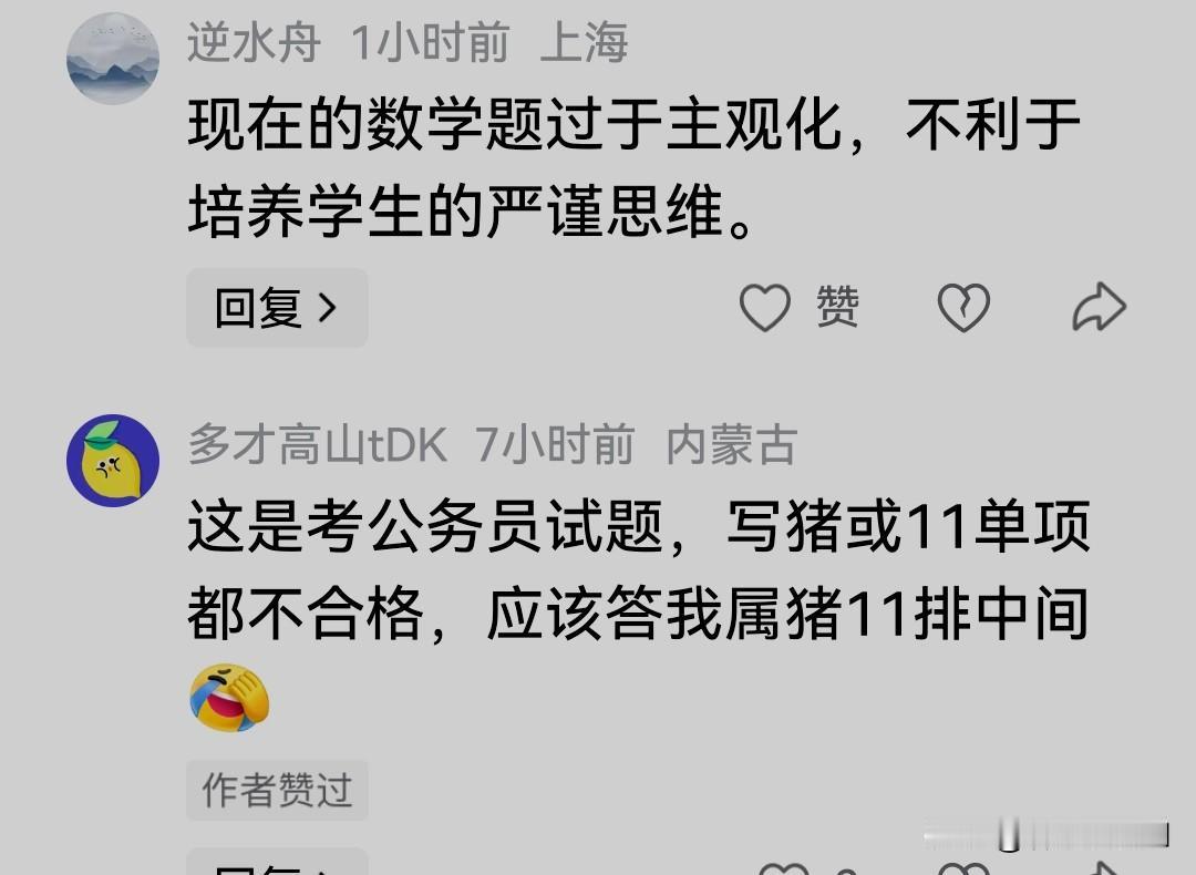 也不知道是哪位高手出的这道逻辑数学题?不管回答的对和错,只要把答案写上去,怎么看似乎都像骂自己! 按说这道题出的也蛮有创意,只是错误的把“它”用成了“我”而已!估计这位出题的数学老师,语文学的还不彻底。 有网友出了一个“馊主意”,他说,参加公务员考试的网友都有超凡的逻辑思维能力,如果把这道题成为国考题,不知道他们是否可以另辟蹊径,不踩坑的回答这道数学题!