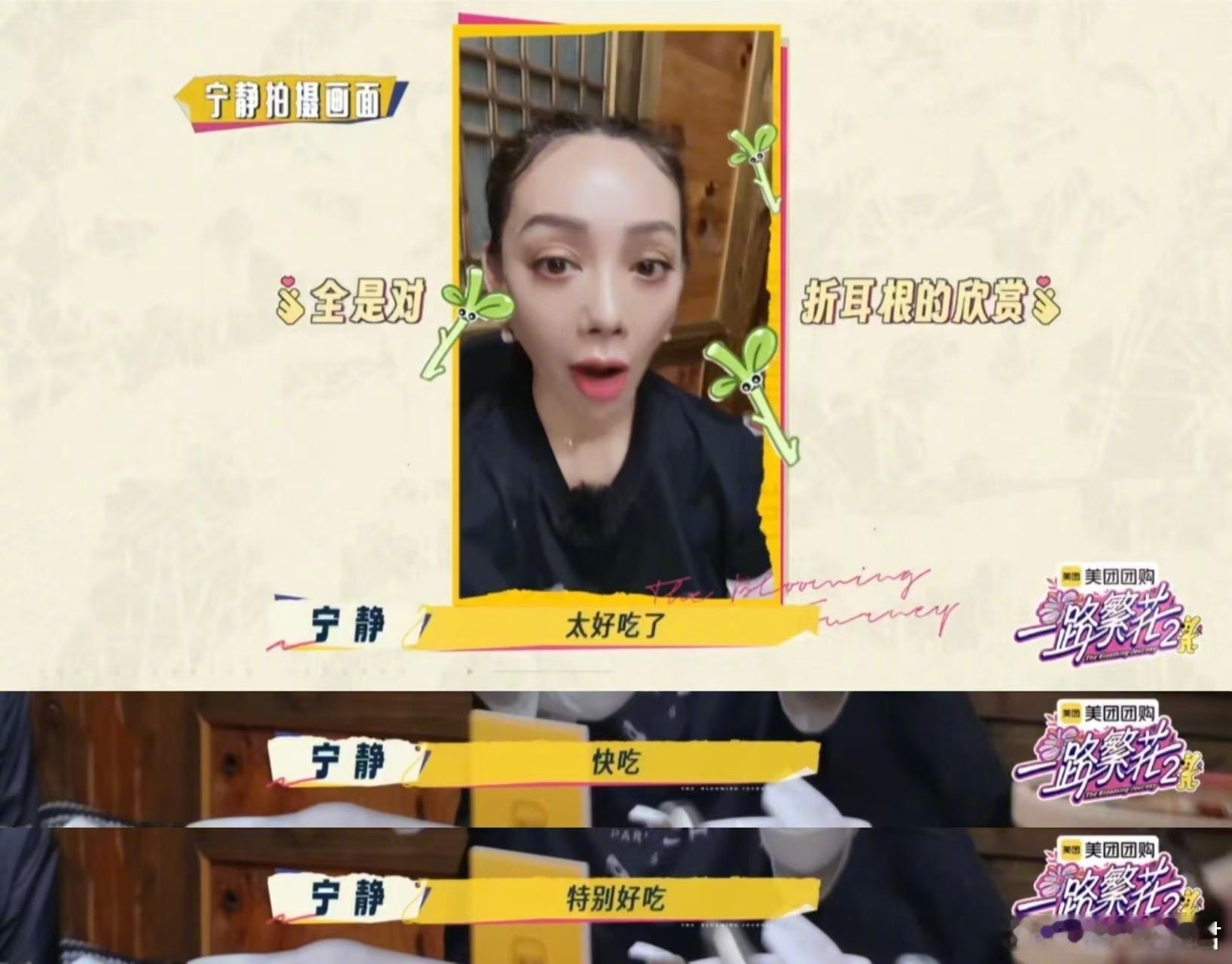 在《一路繁花》综艺中,宁静、何赛飞、刘嘉玲、刘晓庆、赵柯淳、邵子恒六人在贵州当地餐厅用餐,品尝折耳根、苗岭虫烩、酸汤鱼等特色菜,结账时消费总额为1826元,平均每人消费300余元。