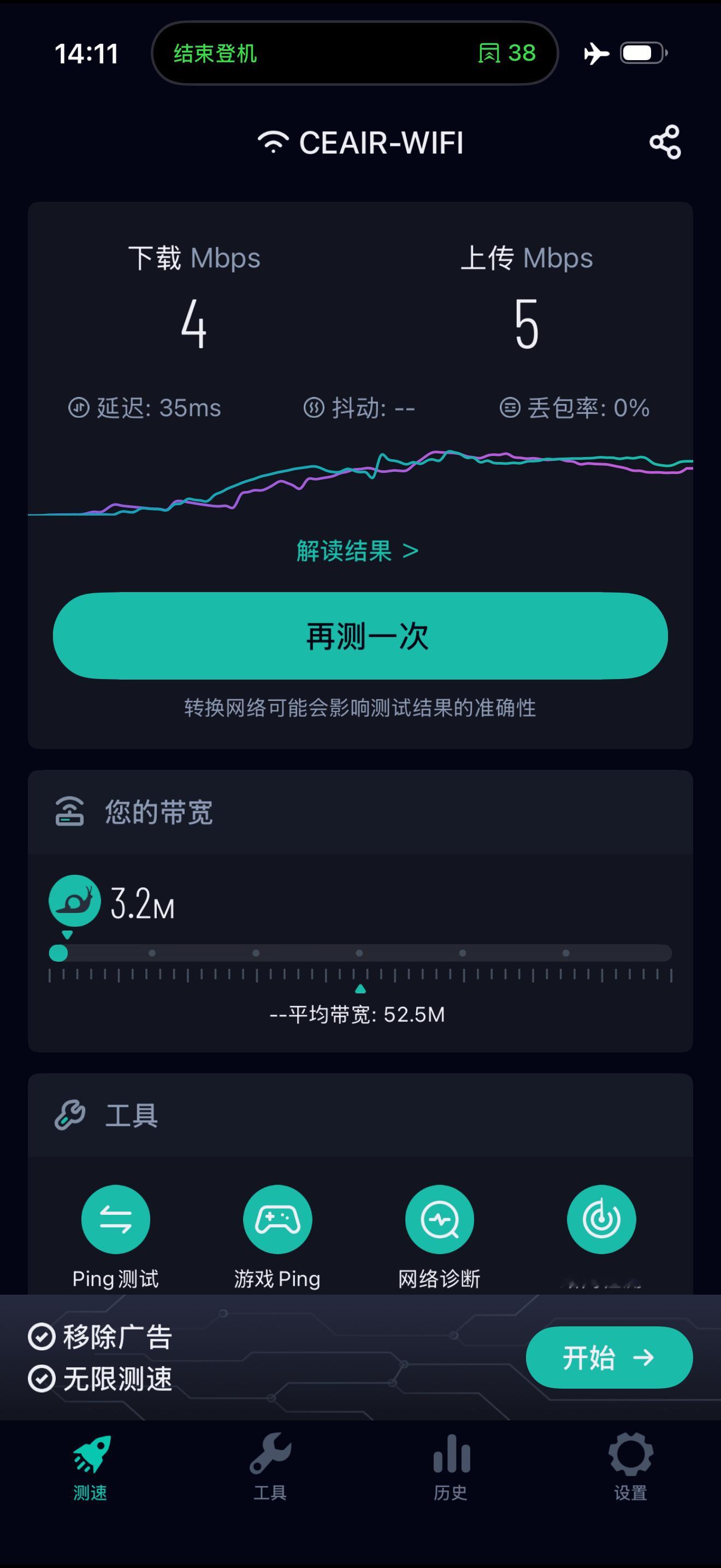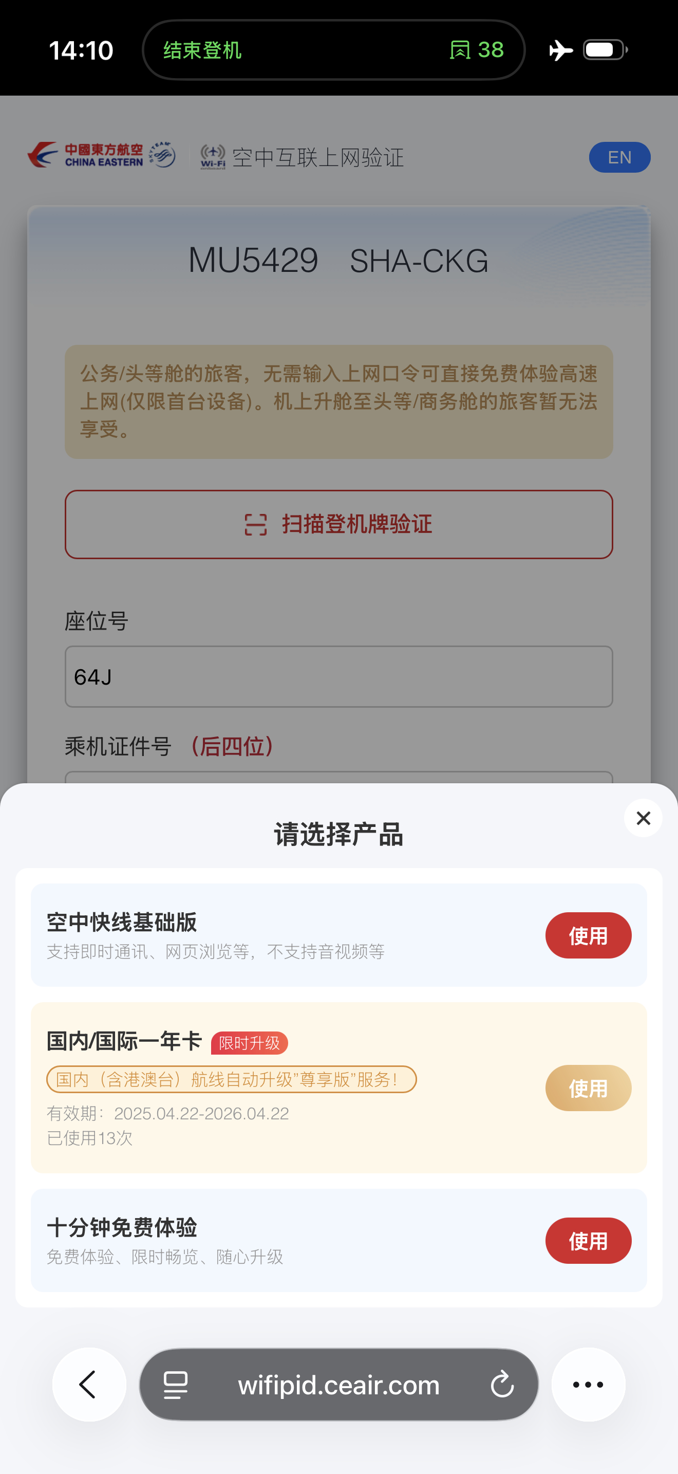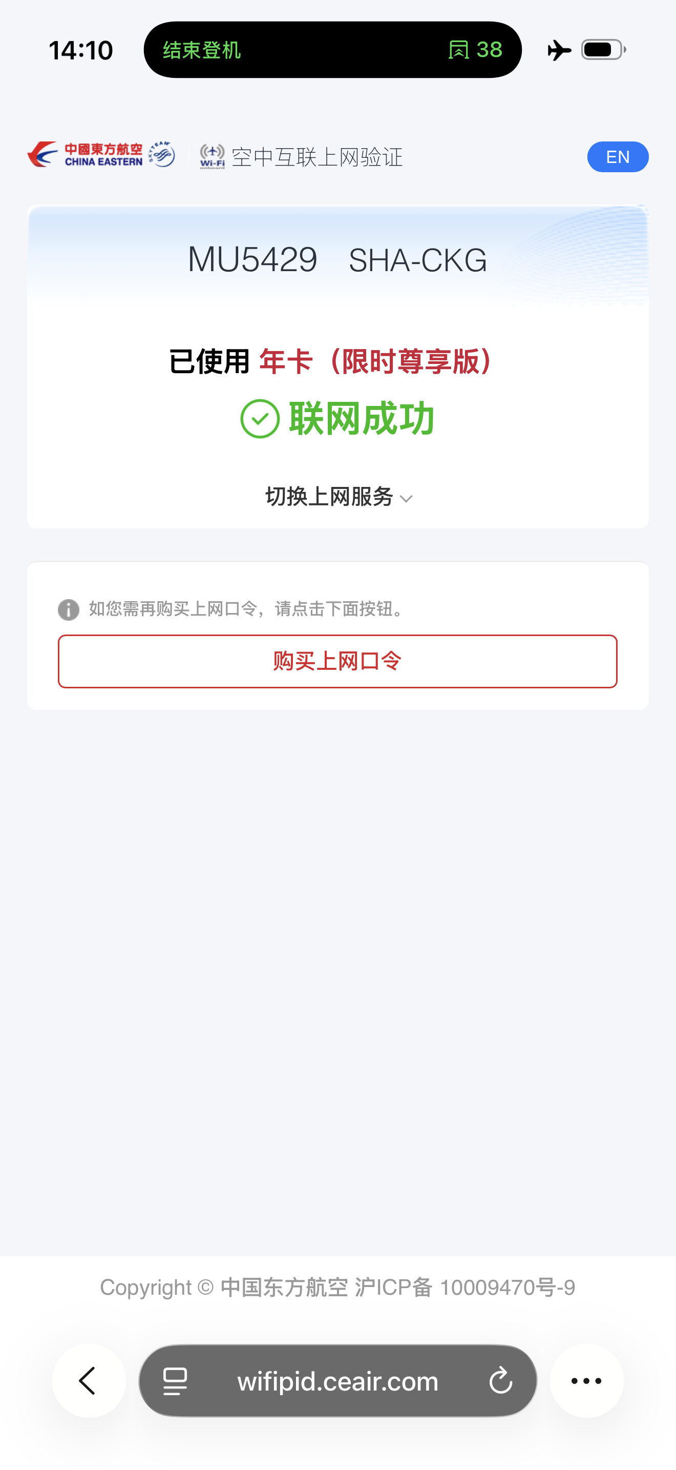 之前收到东航短信通知说Wi-Fi年卡用户都会自动免费升级,这次我们在上海飞重庆的航班上测试了一下——确实已经解锁了“尊享版”服务。实际体验:测试时下行约 4 Mbps、上行约 5 Mbps;网页、社交媒体、图片加载都没问题,延迟也不高,整体够用顺滑。作为经常跑航线的科技媒体人来说,机上 Wi-Fi 的体验确实越来越重要。也期待未来更多飞机能普及高速机联网。