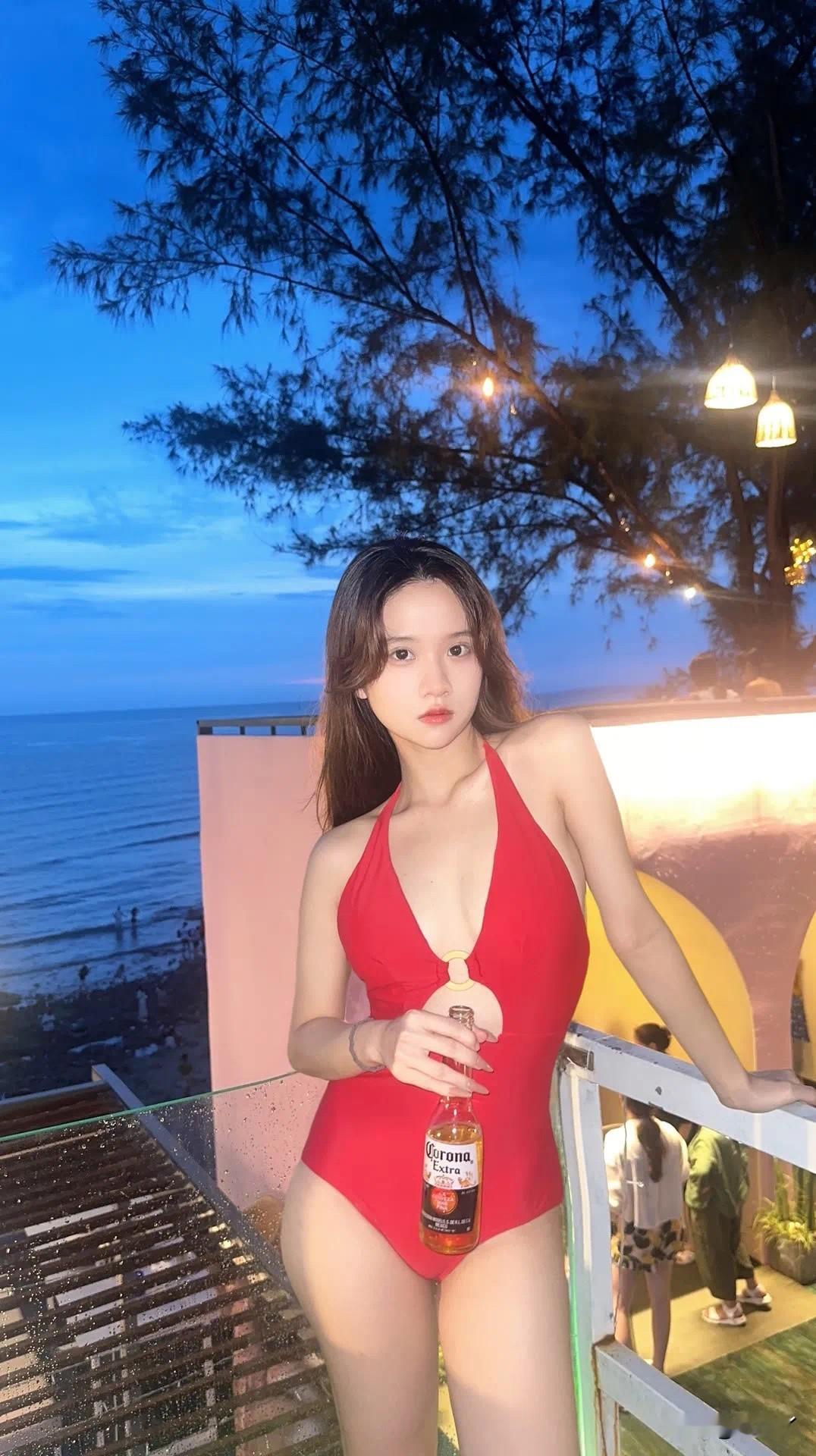 暮色漫上海岸,晚风轻拂,穿红泳衣的小姐姐成了最美风景。她手握科罗娜,站在露台,身影融进海天交界的蓝。