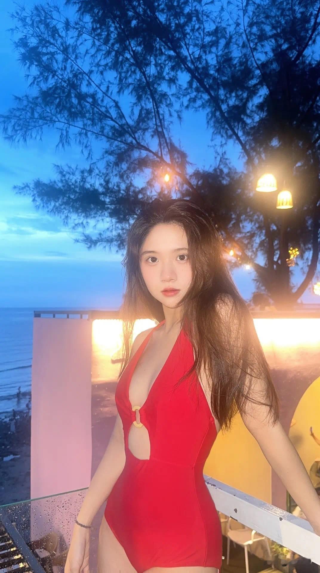 红泳衣明艳,衬得皮肤透亮,镂空设计添了几分俏皮。海浪声里,她微仰着头,发丝随海风飘,这松弛劲儿,是对生活的拥抱。