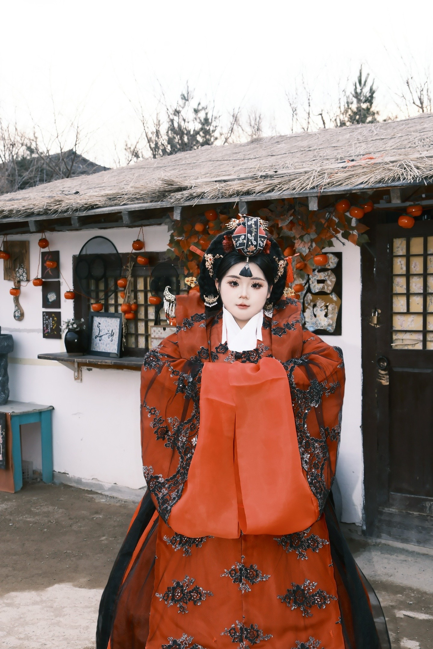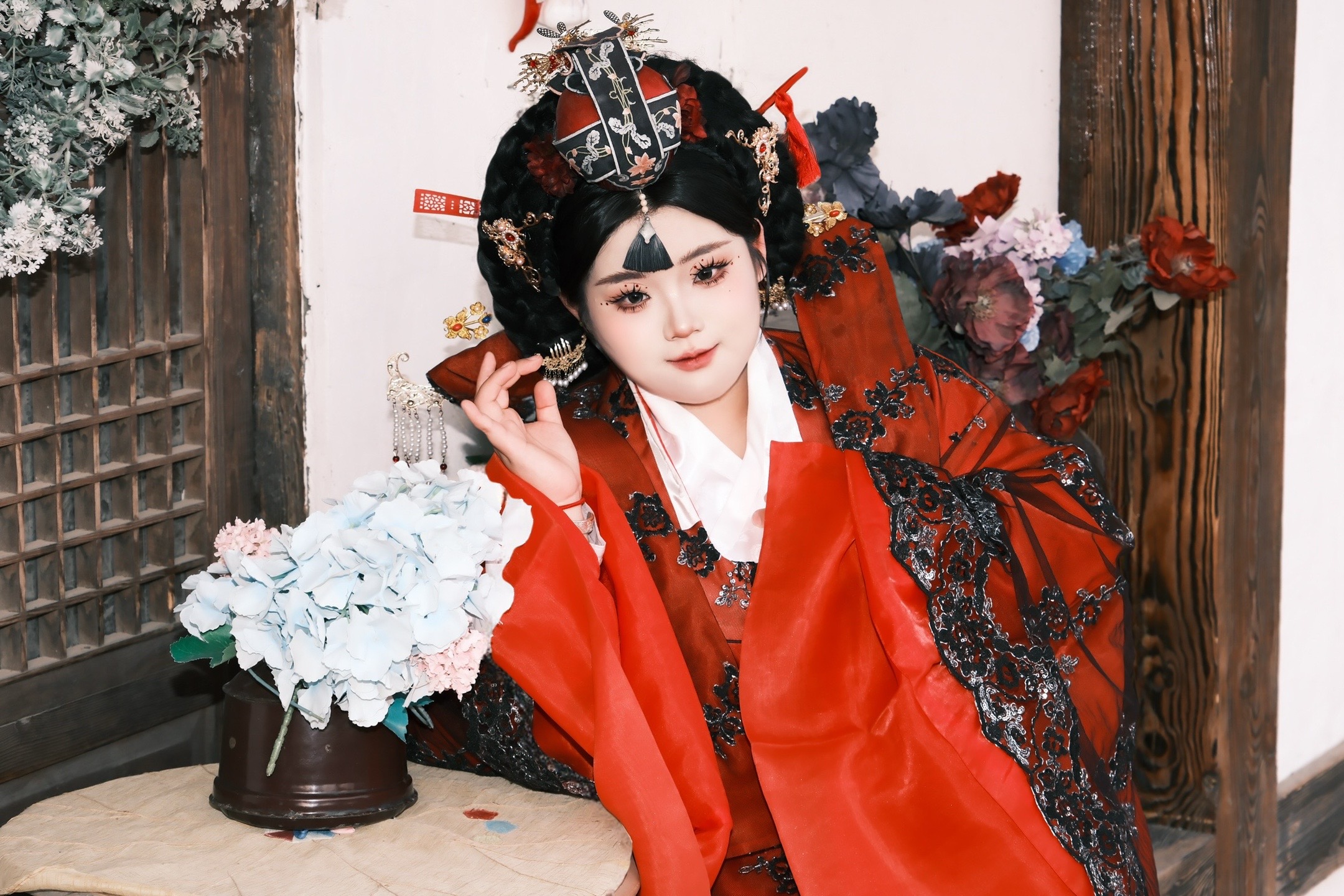 天呐!谁懂啊家人们!这是什么人间富贵花!小姐姐一袭红黑配色的韩服,红色明艳似火,黑色花纹如墨韵流淌,布料质感上乘,每一处剪裁、每一道褶皱都恰到好处,尽显华丽。