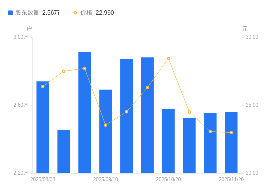 日期A股户数(户)流通A股户均持股数(股)户均持股市值(万元)2025-11-20256055620.9712.922025-11-10255355636.3813.002025-10-31252475700.6813.972025-10-20257905580.6515.872025-09-30288184994.2713.142025-09-19287245010.6212.292025-09-10269195346.5912.592025-08-29291374939.6013.692025-08-20245325866.8316.132025-08-08274015252.5513.86