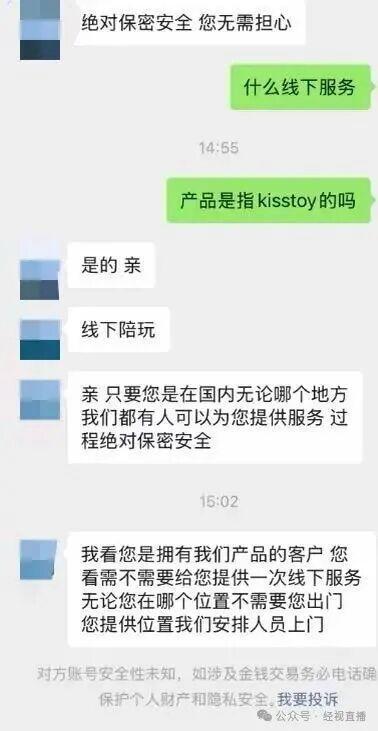 该网友发布的聊天截图显示,对方自称系KISSTOY的前客服,表示可以提供“保密安全的线下服务”,还称通过系统后台可以看到该网友购买的商品定位在福建泉州,并表示,“如果有需要,可以联系我。”该事件随后引发关注。