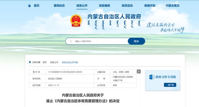 《内蒙古自治区人民政府关于废止〈内蒙古自治区体育竞赛管理办法〉的决定》已经2025年11月8日自治区人民政府第33次常务会议审议通过,现予公布,自公布之日起施行。