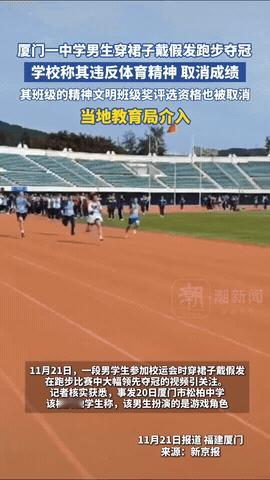 厦门,一男生参加短跑比赛,甩了第二名很远,拿下了冠军。可他还没来得及高兴,学校就把他成绩取消了,因为他穿着裙子和假发跑步,被认为有损体育精神。 从技术的角度来讲,这位男生确实算得上高手。哪怕穿着的衣服并不合身,他也在比赛中遥遥领先,一点压力都没有,这离不开他本身的能力。 但穿着这样的奇装异服跑步,确实还是有点显眼。因此哪怕他跑的再快,学校觉得他没有体育精神,那成绩就不作数。 不仅如此,这个男生所在的班级也因为他的出格行为,被取消了精神文明奖,可以说是因为一个人的不得体,最后影响了整个班级。 事后男生解释,之所以这么穿,是因为他非常喜欢一位动漫女角色,所以就穿上了她的招牌服饰,来给自己加油打气。 不过对于学校的处理,网友们有不同的意见。 有网友说,体育精神就是积极向上健康阳光,这个奇装异服,男扮女装,混淆性别确实不符合体育精神,学校三观正[赞][赞] 也有网友说,体育精神是啥?如果不违反法律法规,不违反公序良俗,年轻人崇尚自由奔放,又有何不可呢? 体育精神是什么?我认为就是不断突破自我,从这个角度来看,不能认为男生穿裙子就有违体育精神。其实与其说是不符合体育精神,倒不如说是违反了学校的规则。 所以学校该罚还是得罚,毕竟校有校规。可假如学校在处罚的时候同时又肯定男生,比如说你的想法很有创意,但我们这里毕竟是学校,穿着打扮也要看环境,是不是就会好一些呢? 男生穿裙戴假发跑步夺冠被取消成绩