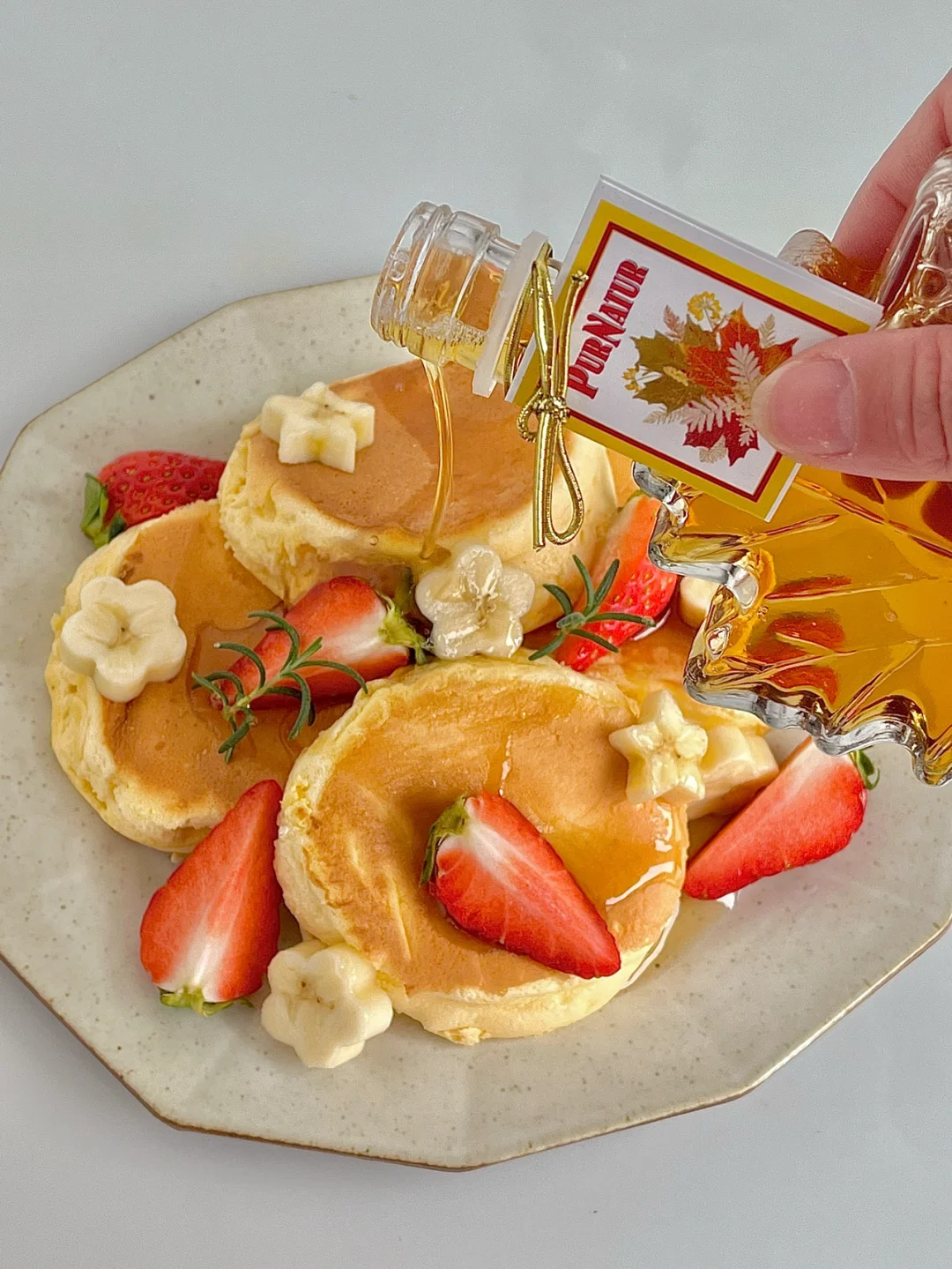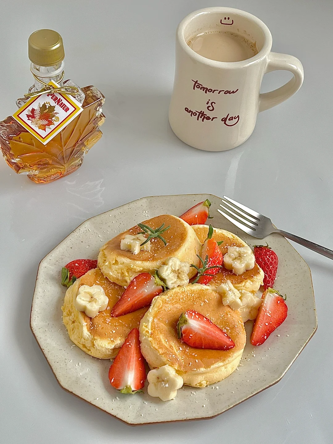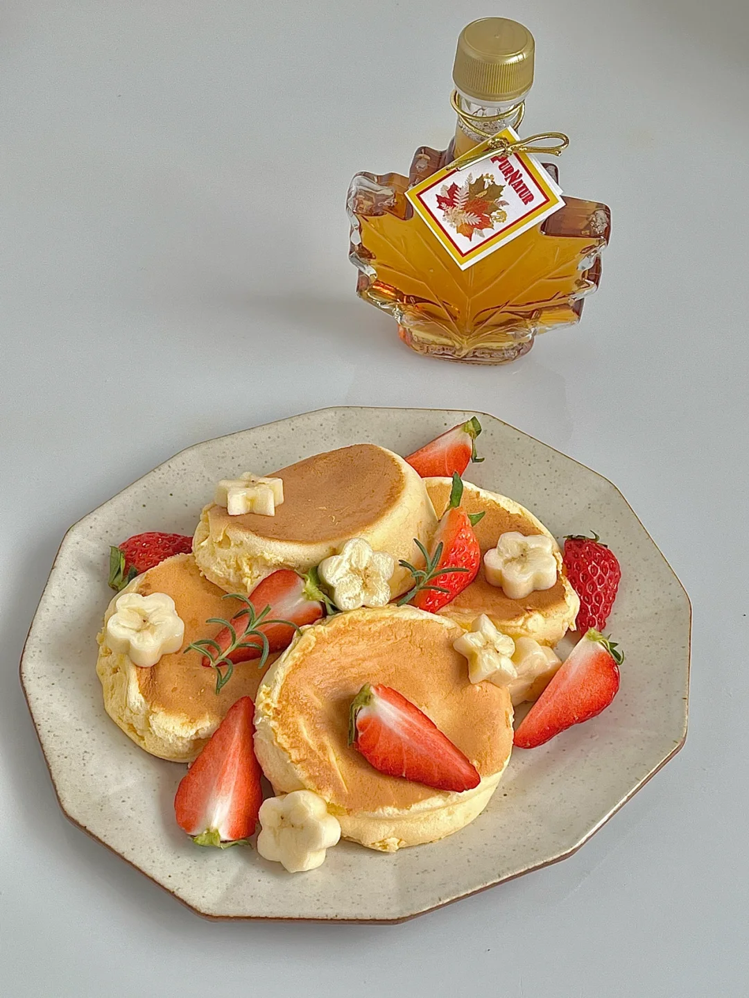 7️⃣把舒芙蕾松饼放入盘中,加上草莓和香蕉,最后撒上枫糖浆,撒点椰蓉即可。