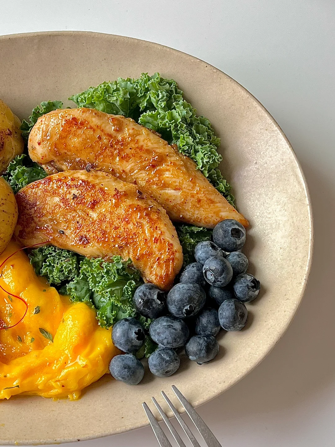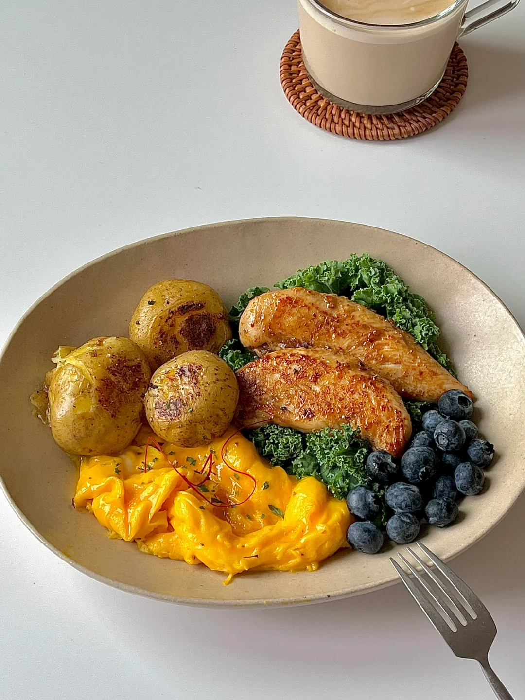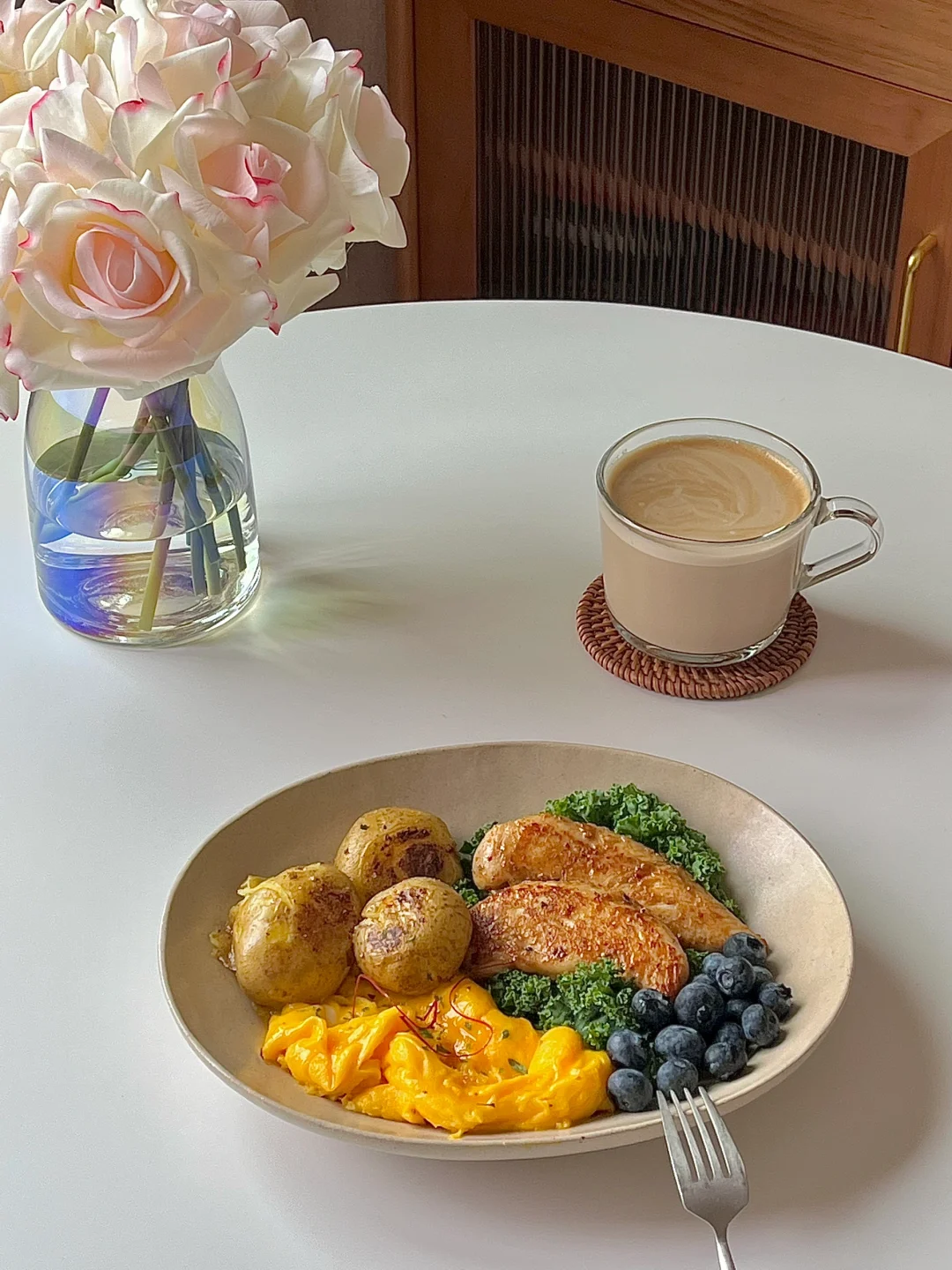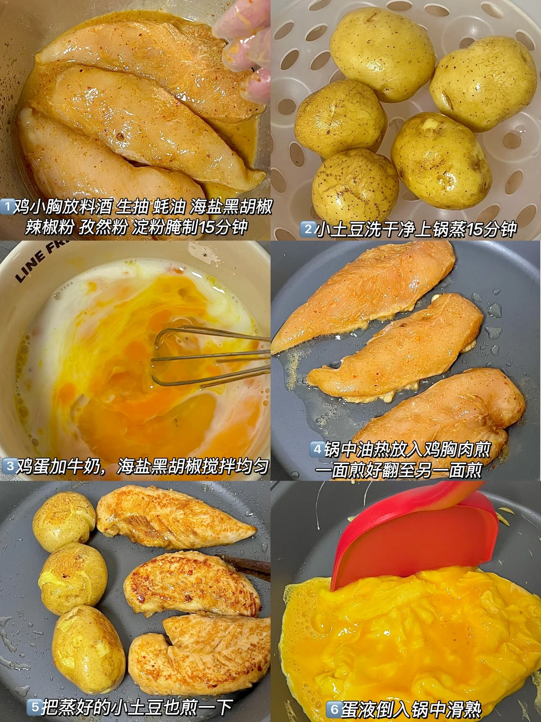 一人食吃什么 今日份早餐分享: 煎土豆 煎鸡胸肉 牛奶滑蛋 蓝莓🫐 一杯拿铁☕️ . 1️⃣鸡小胸放料酒,生抽,蚝油,海盐黑胡椒,孜然粉,辣椒粉,淀粉,腌制15分钟 2️⃣小土豆洗干净上锅蒸15分钟。(不用去皮,蒸好后很容易剥皮) 3️⃣鸡蛋加牛奶海盐黑胡椒搅拌均匀。 4️⃣腌制好的鸡胸肉放入锅中两面煎熟即可 5️⃣蒸好的土豆再煎一下更好吃哦😋 6️⃣再小火来个滑蛋,成型就行。 . 我太爱吃土豆了,真的好好吃😋 大家新周快乐呀