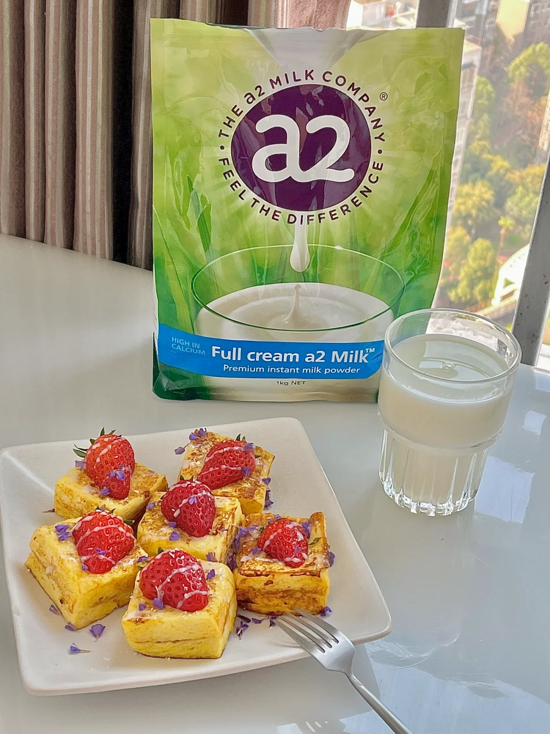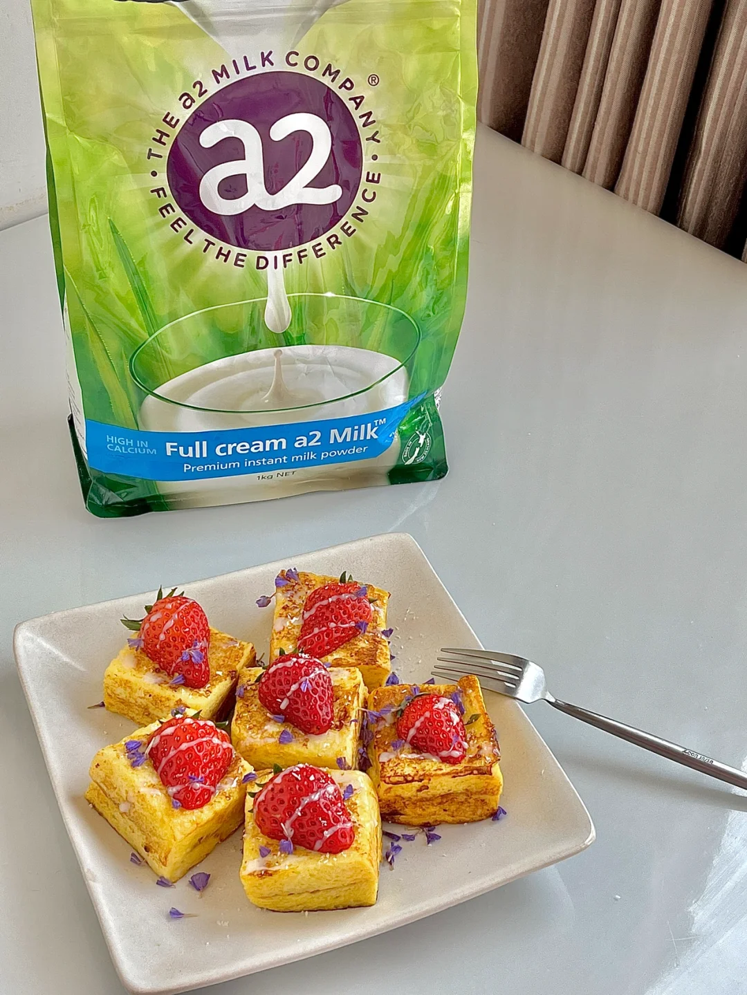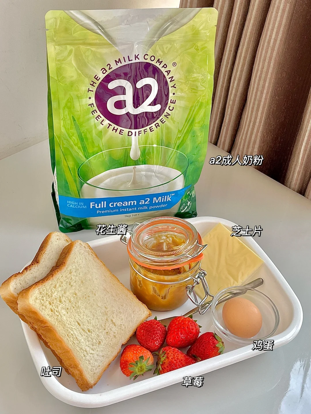 🥛食材:吐司三片,鸡蛋一个,a2成人奶粉,芝士片两片,花生酱适量,草莓