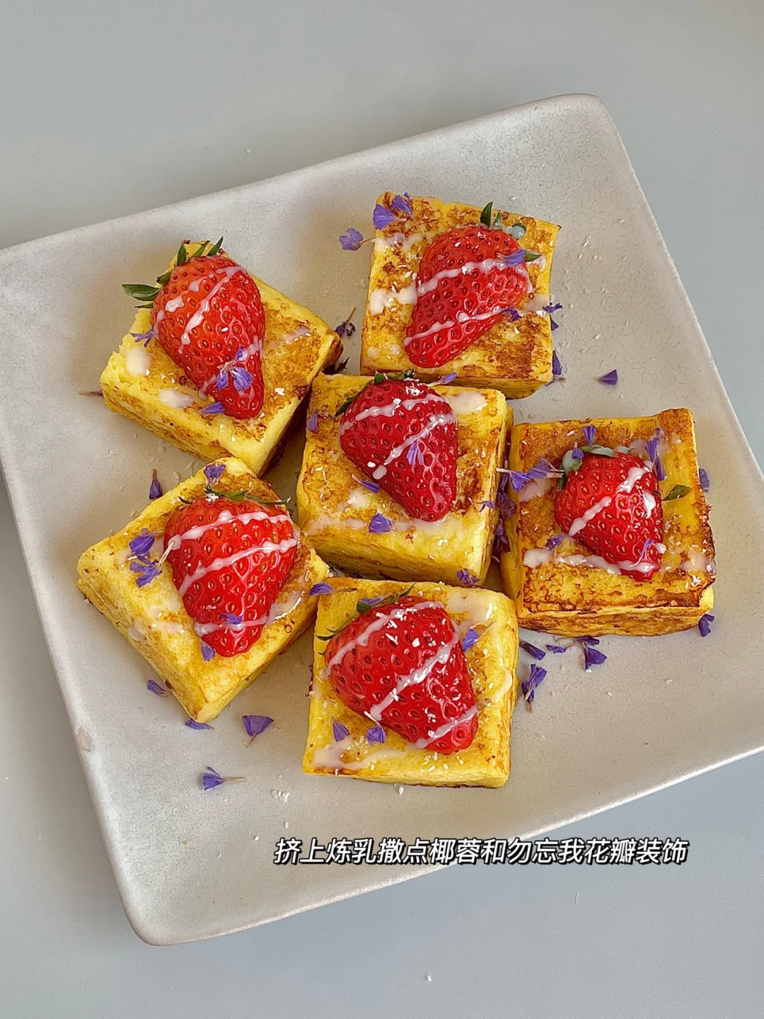 7️⃣放在盘中装饰。每一块都放上草莓,挤上炼乳,撒点椰蓉和勿忘我花瓣