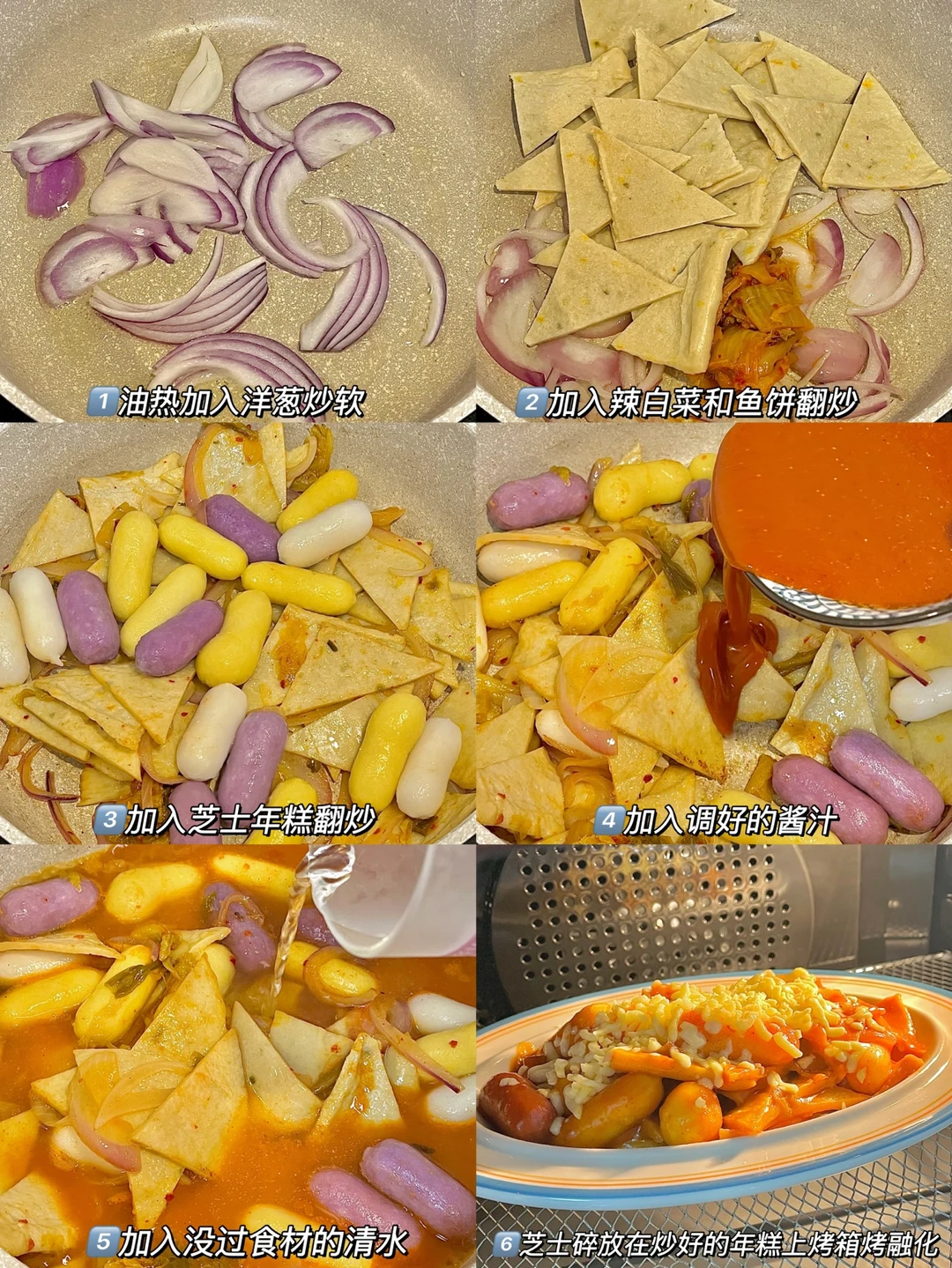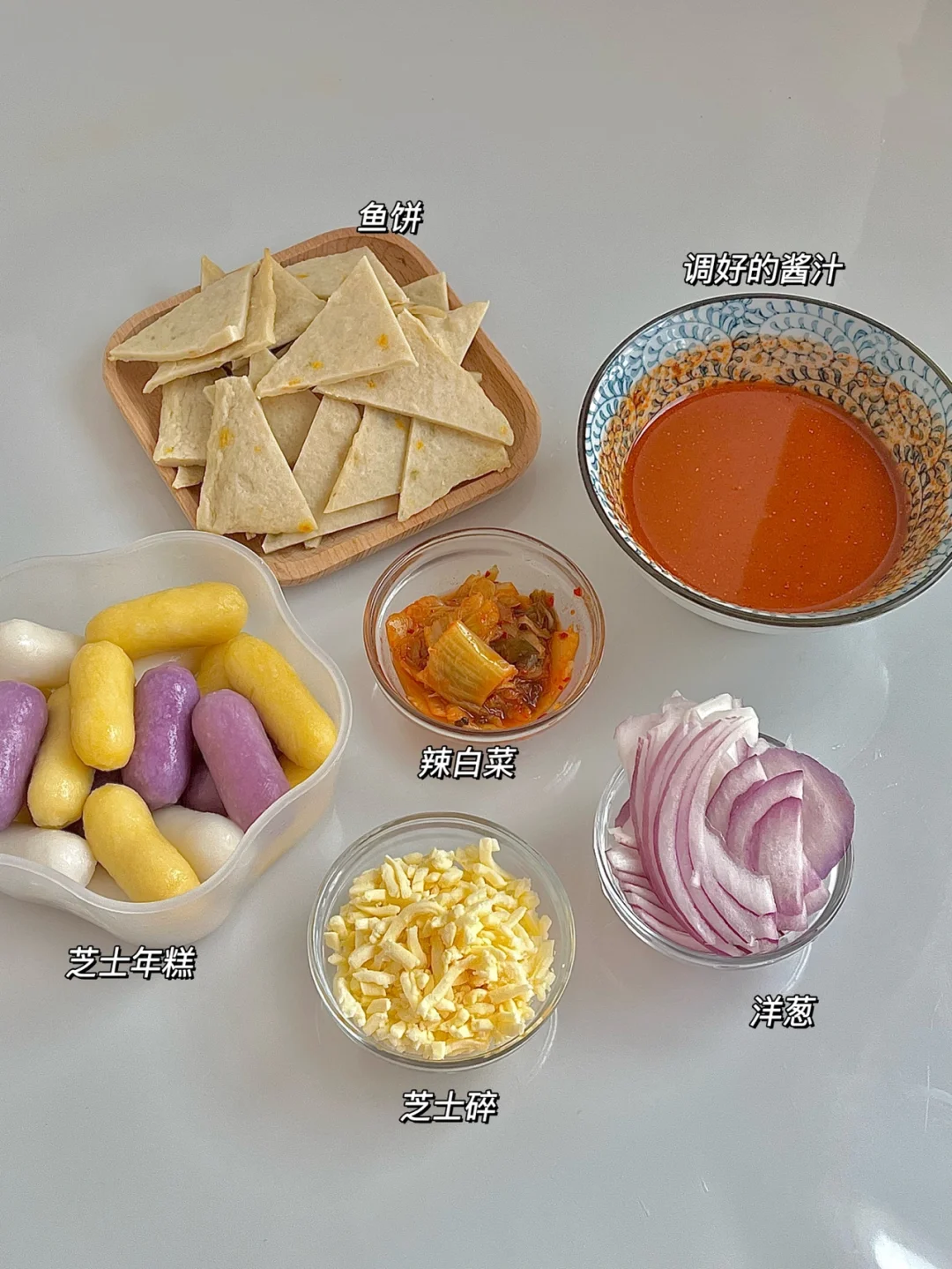 🌶准备食材:鱼饼两张切成块,芝士年糕,洋葱,调好的酱汁(图片中有做法)辣白菜,芝士碎。