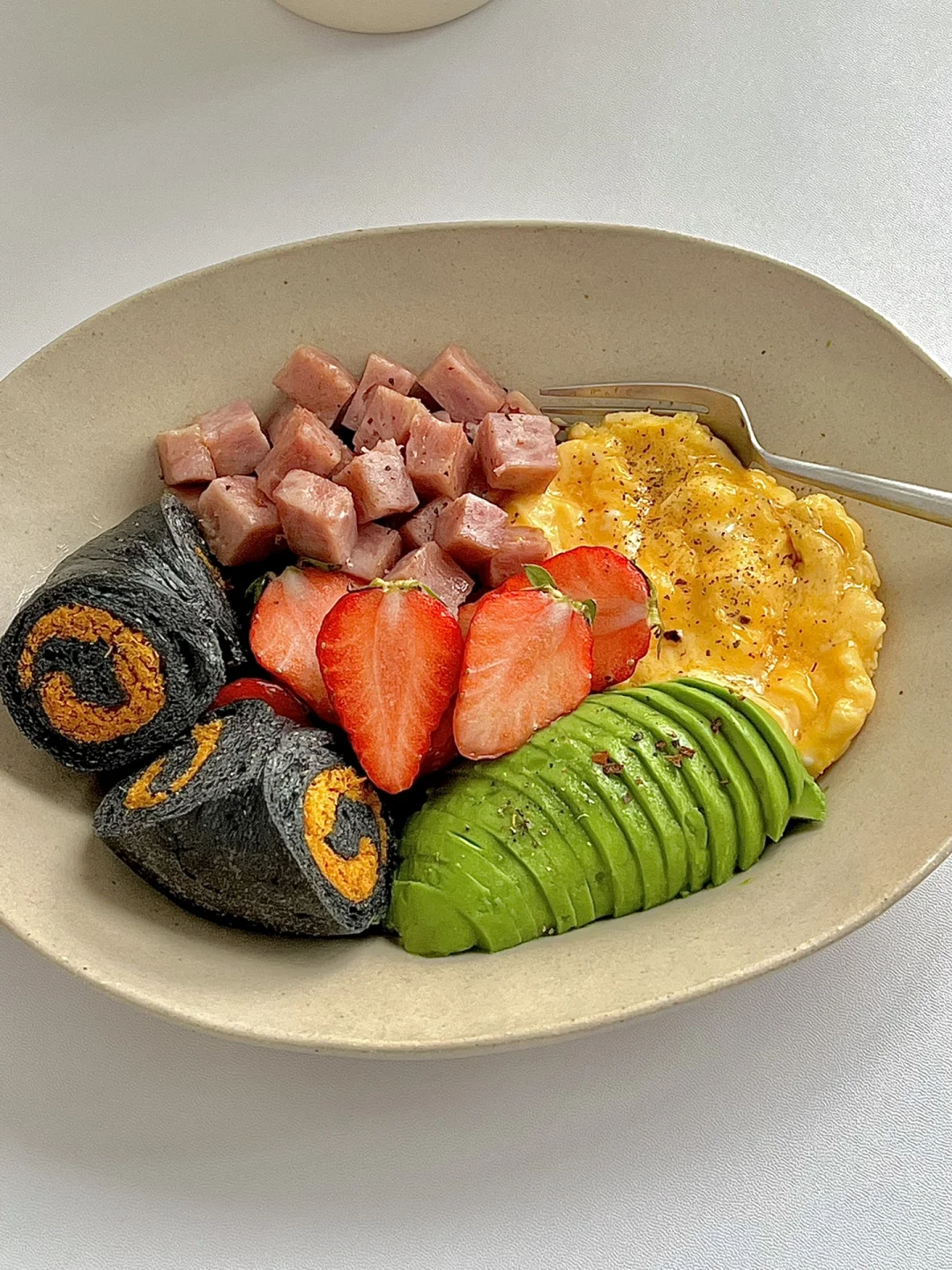 6️⃣贝果牛油果滑蛋午餐肉沙拉