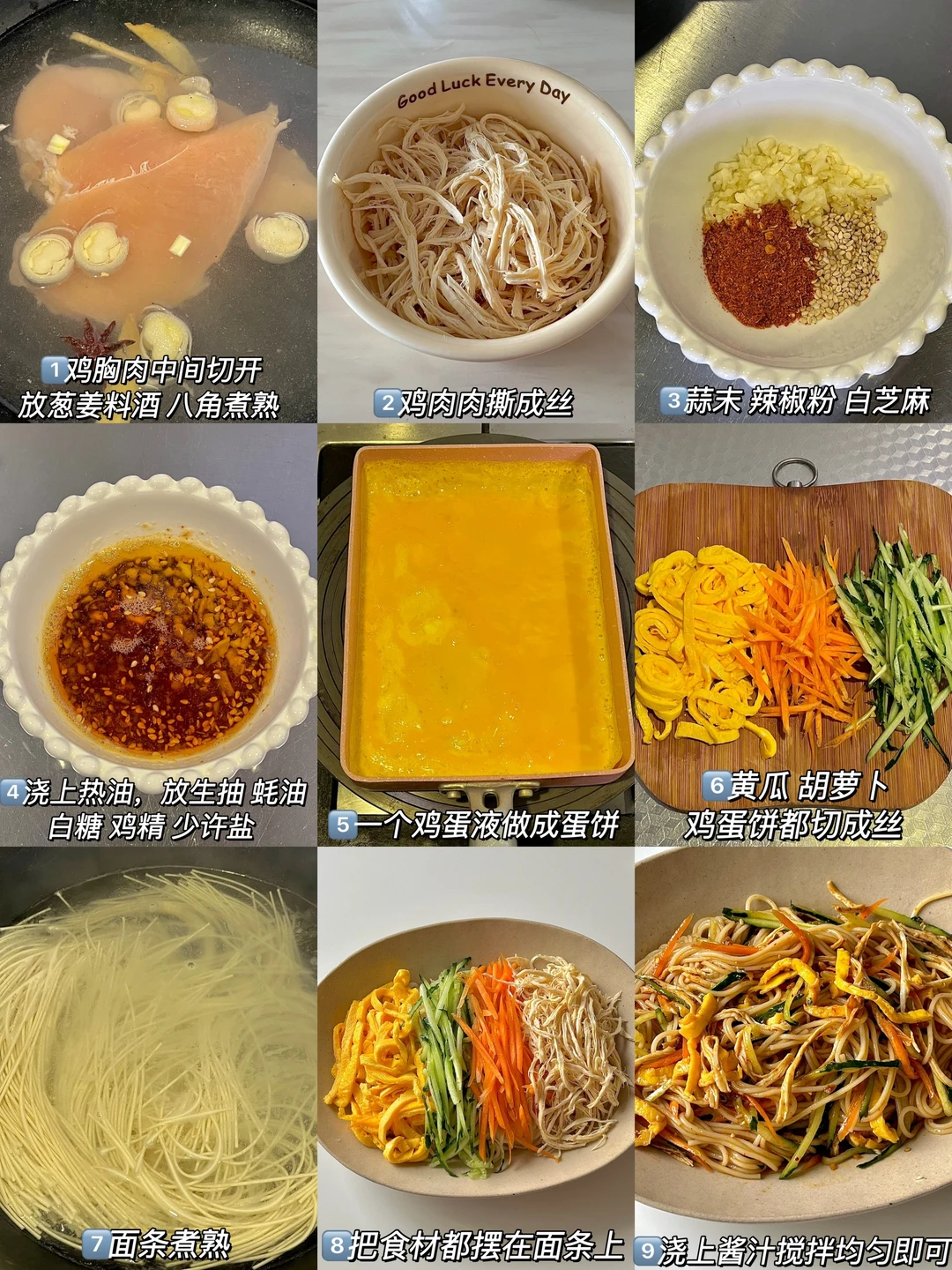一人食吃什么 今日份早餐分享: 鸡丝凉拌面 一杯冰拿铁☕️ . 1️⃣一块鸡胸肉从中间切开,冷水下锅,放葱姜,料酒,白胡椒,一块八角煮熟(大概十分钟左右) 2️⃣煮好的鸡胸肉放冷后,撕成鸡肉丝。 3️⃣碗中放蒜末,辣椒粉,白芝麻,浇上热油,放生抽,蚝油,白糖鸡精,少许盐搅拌均匀。 4️⃣一个鸡蛋液摊成蛋饼,切成蛋丝。 5️⃣黄瓜和胡萝卜也切成丝。 6️⃣面条煮熟过冷水,盛到碗中,把食材摆在面条上 7️⃣浇上酱汁搅拌均匀就可以吃了。 . 炎热的夏天吃点清爽开胃的凉拌面真的好满足了😋