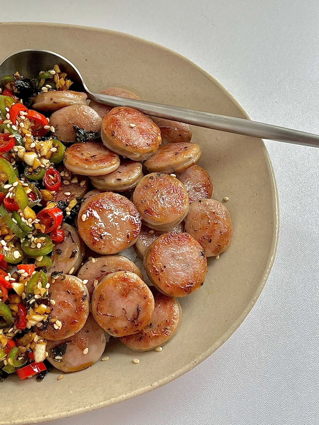 热气腾腾的三餐 今日份早午餐分享: 香肠煎蛋拌饭 一杯美式☕️ . 炒了好久香肠煎蛋老式拌饭,周末必须安排上😋 1️⃣先调个酱汁(青红辣椒圈 蒜末 白芝麻)浇上热油,放一勺生抽 一勺蚝油 一勺醋 半勺糖 适量盐和鸡精搅拌均匀备用。 2️⃣香肠切片,放锅中煎至两面焦焦 3️⃣煎两个灵魂煎蛋🍳 4️⃣把煎好的鸡蛋,香肠放在米饭上,浇上酱汁拌均匀就可以吃了! . 真的真的巨好吃,我整整吃了一大碗😋 大家周末愉快呀[派对R]