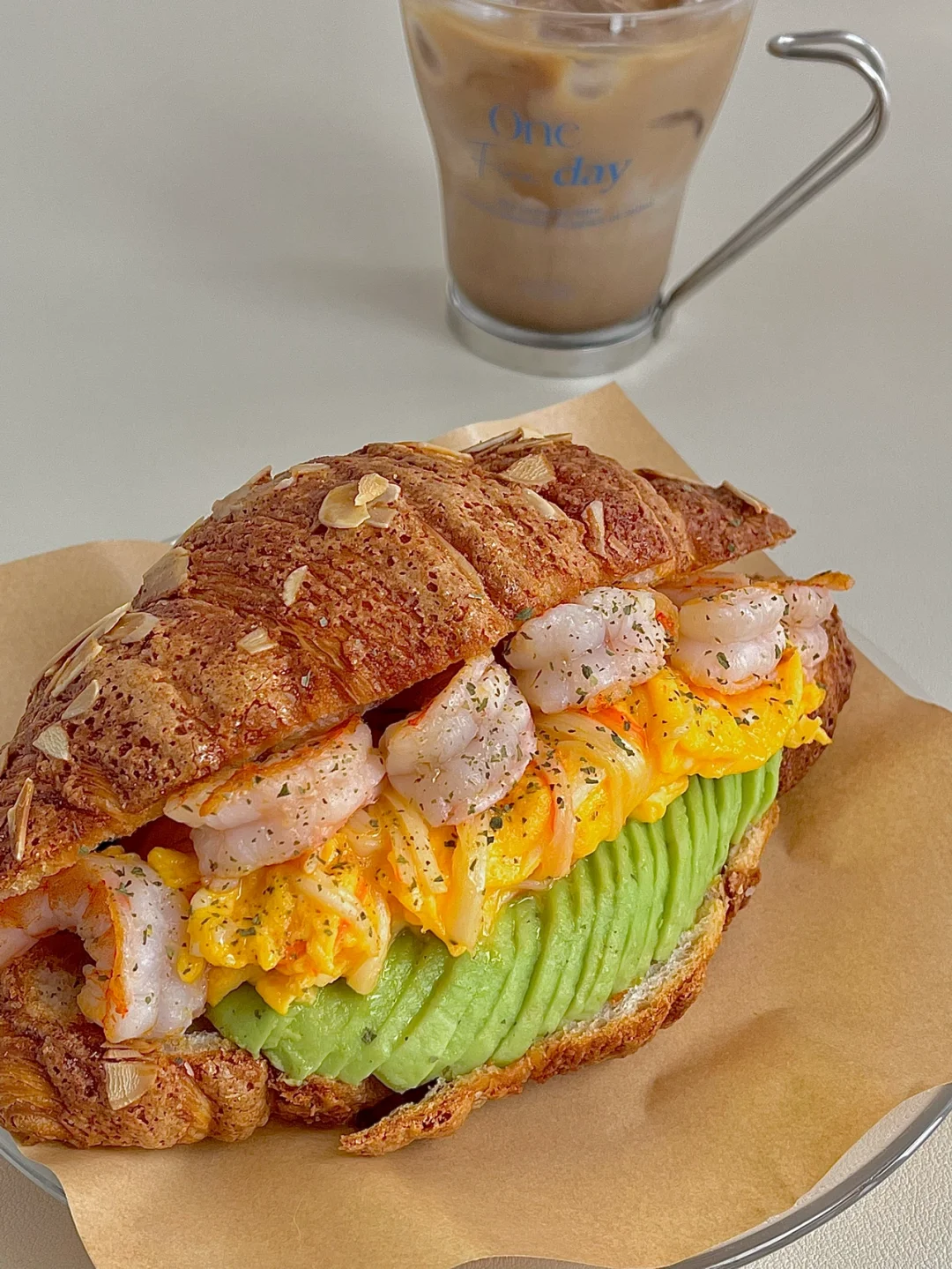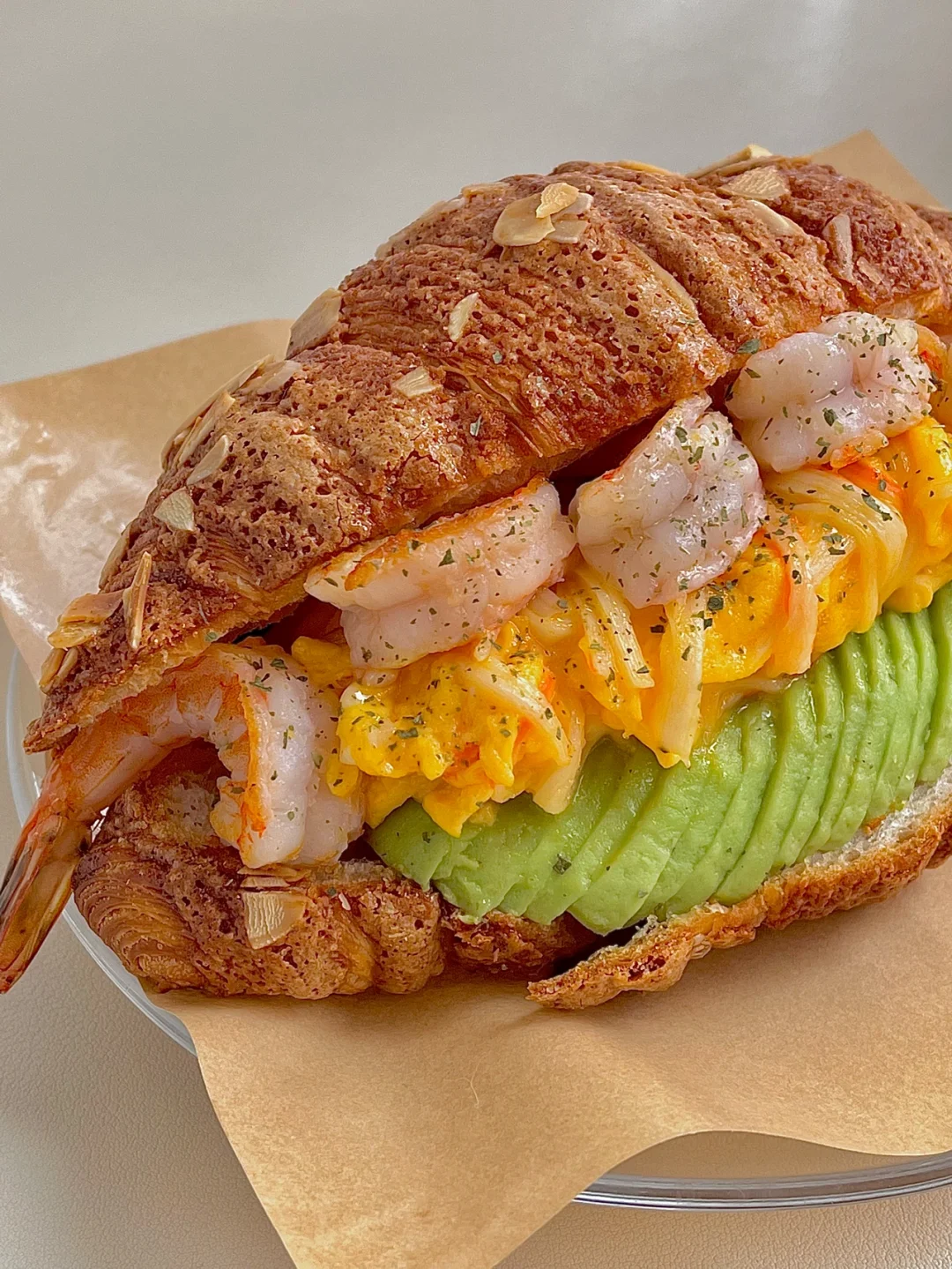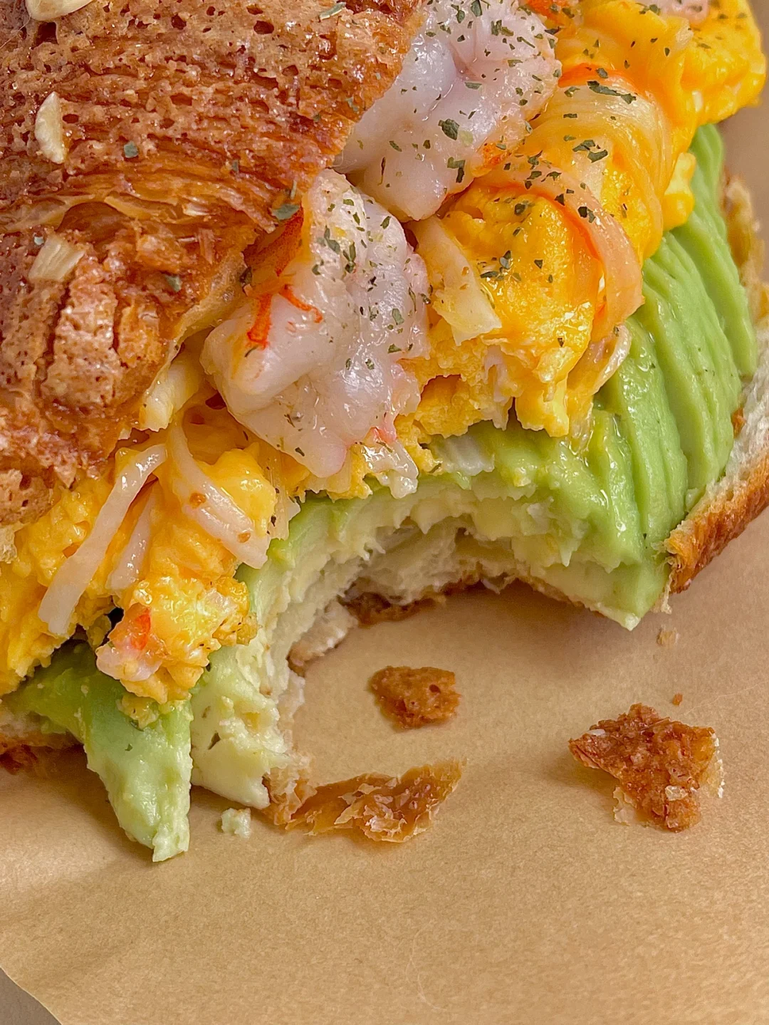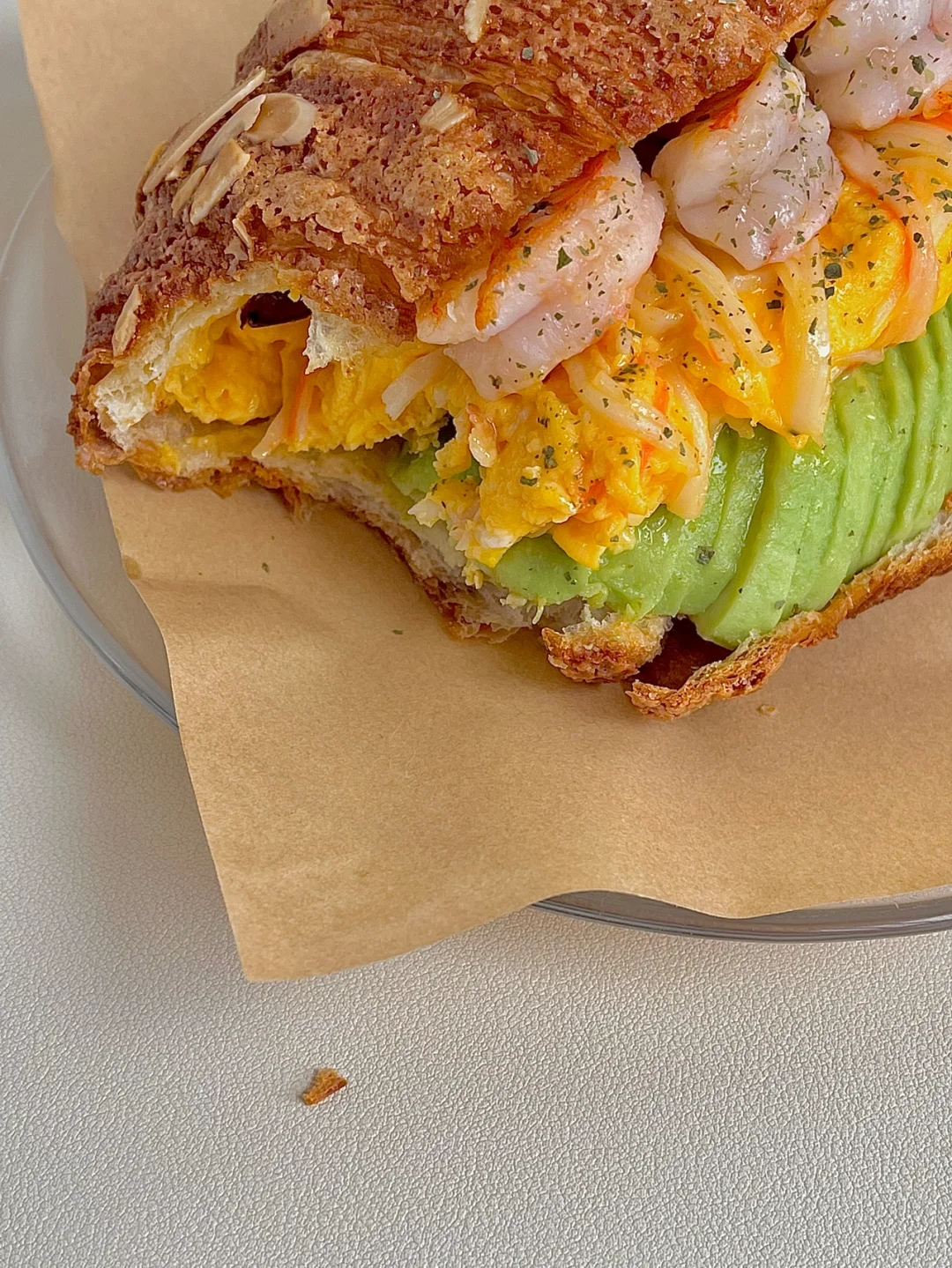 ☀️早餐|牛油果蟹柳滑蛋虾仁可颂三明治😋