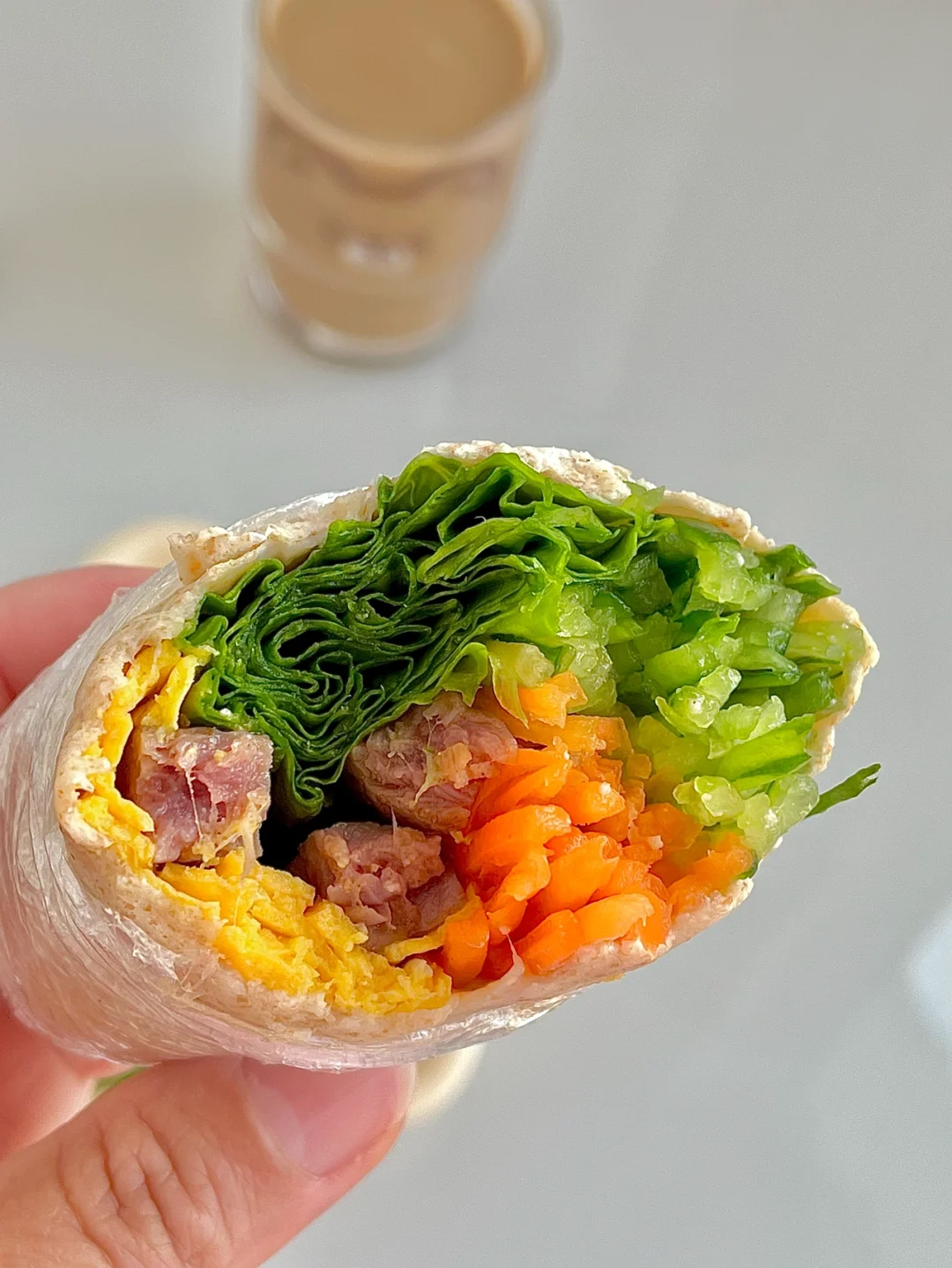 今日份早餐:全麦牛肉蔬菜鸡蛋卷饼,一杯热拿铁☕️