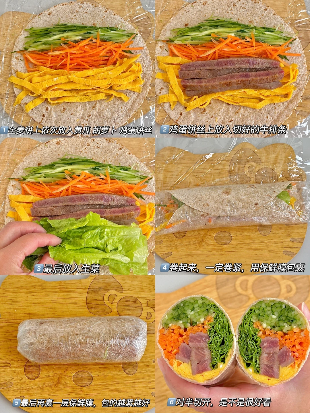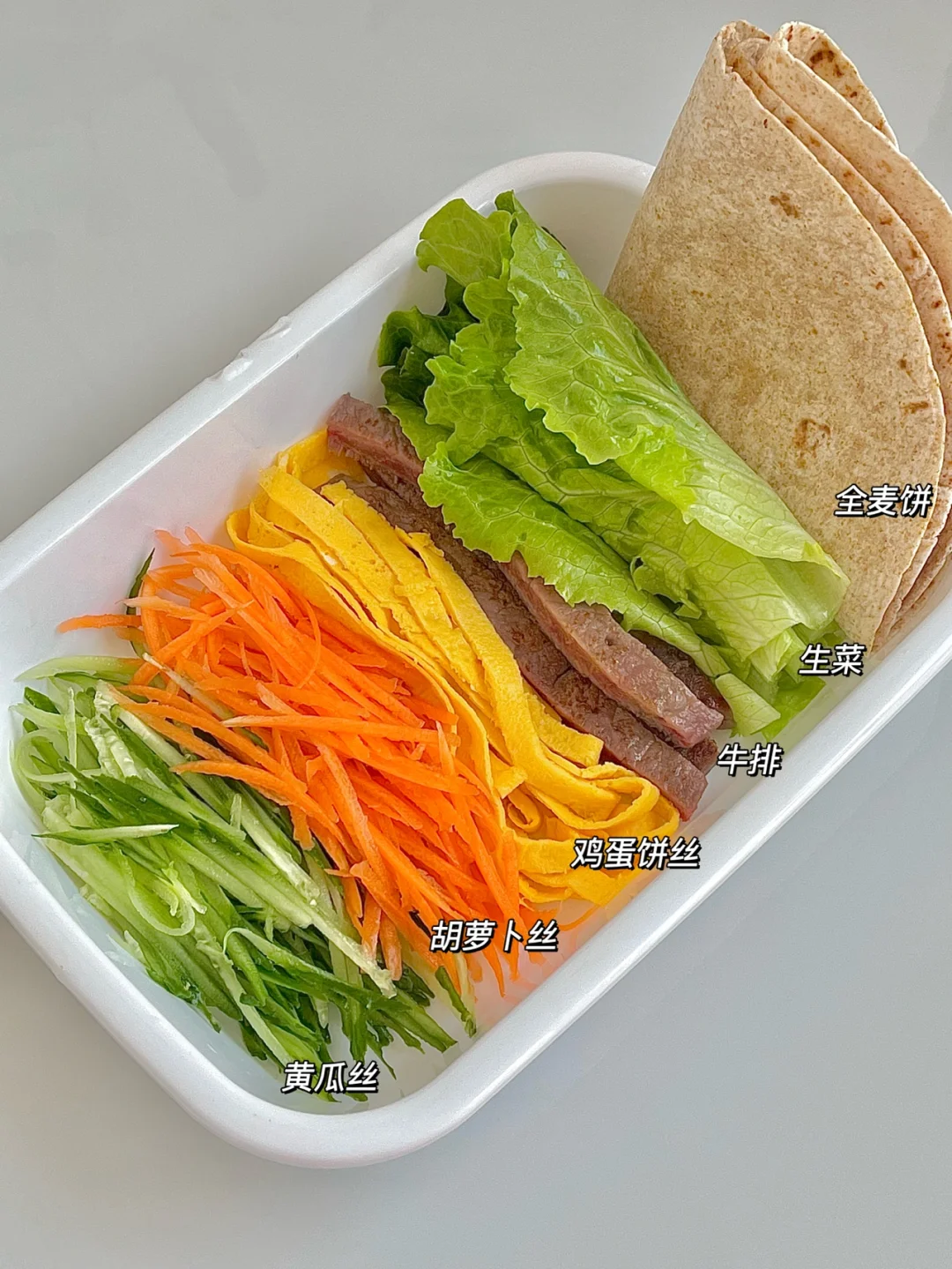 🌯配料:一张全麦饼皮,黄瓜丝,胡萝卜丝,鸡蛋饼皮,牛排,生菜🥬