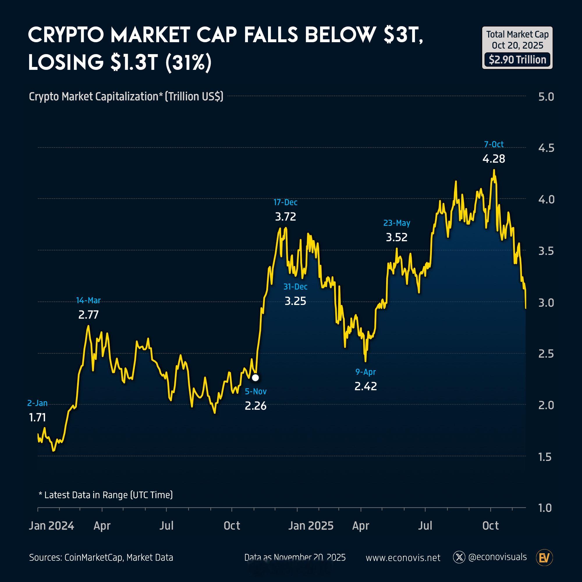 加密货币市值跌破 3 万亿美元,蒸发 1.3 万亿美元(31 %)。 从 2025 年 10 月 7 日至 11 月 20 日,全球加密货币市场下跌了 1.34 万亿美元(31 %),这是该行业历史上最严重的短期下跌之一。