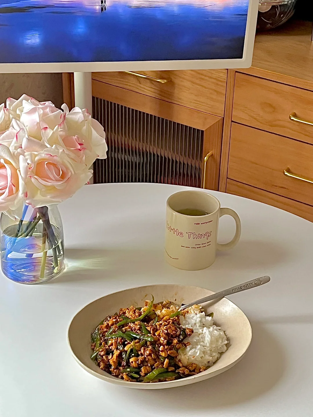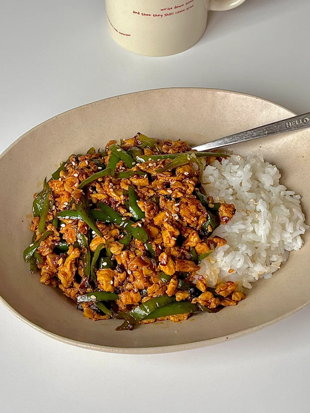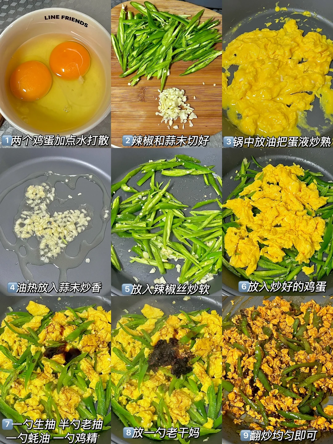 一人食吃什么 今日份早午餐分享: 老干妈青椒炒蛋盖饭 一杯玉米须茶🍵 . 🌶️做法: 1️⃣两个鸡蛋加少许水搅拌均匀。 2️⃣青椒切成丝,再切点蒜末。 3️⃣锅中油热放入鸡蛋炒熟后盛出。 4️⃣锅中油热放入蒜末炒香,放入辣椒丝炒软。 5️⃣再放入炒好的鸡蛋,放一勺生抽,半勺老抽,一勺蚝油,一勺鸡精,一小勺盐翻炒均匀。 6️⃣在放一勺老干妈翻炒均匀出锅。 . 今天放的辣椒有点辣,真的巨下饭好吃😋 大家周末愉快呀