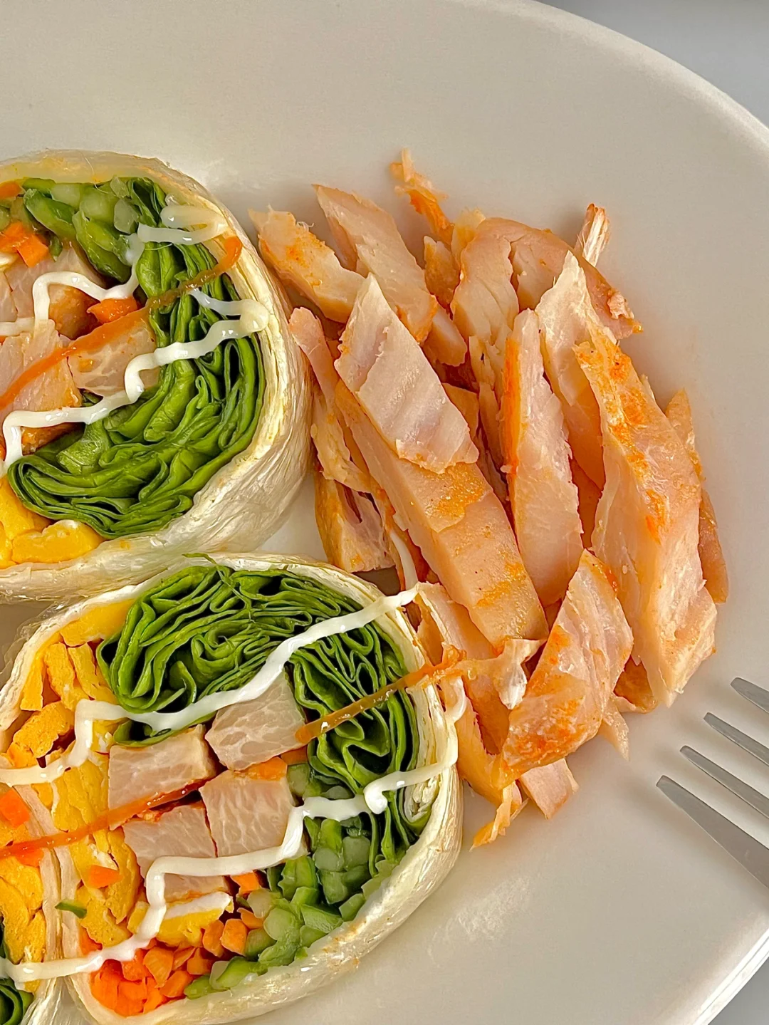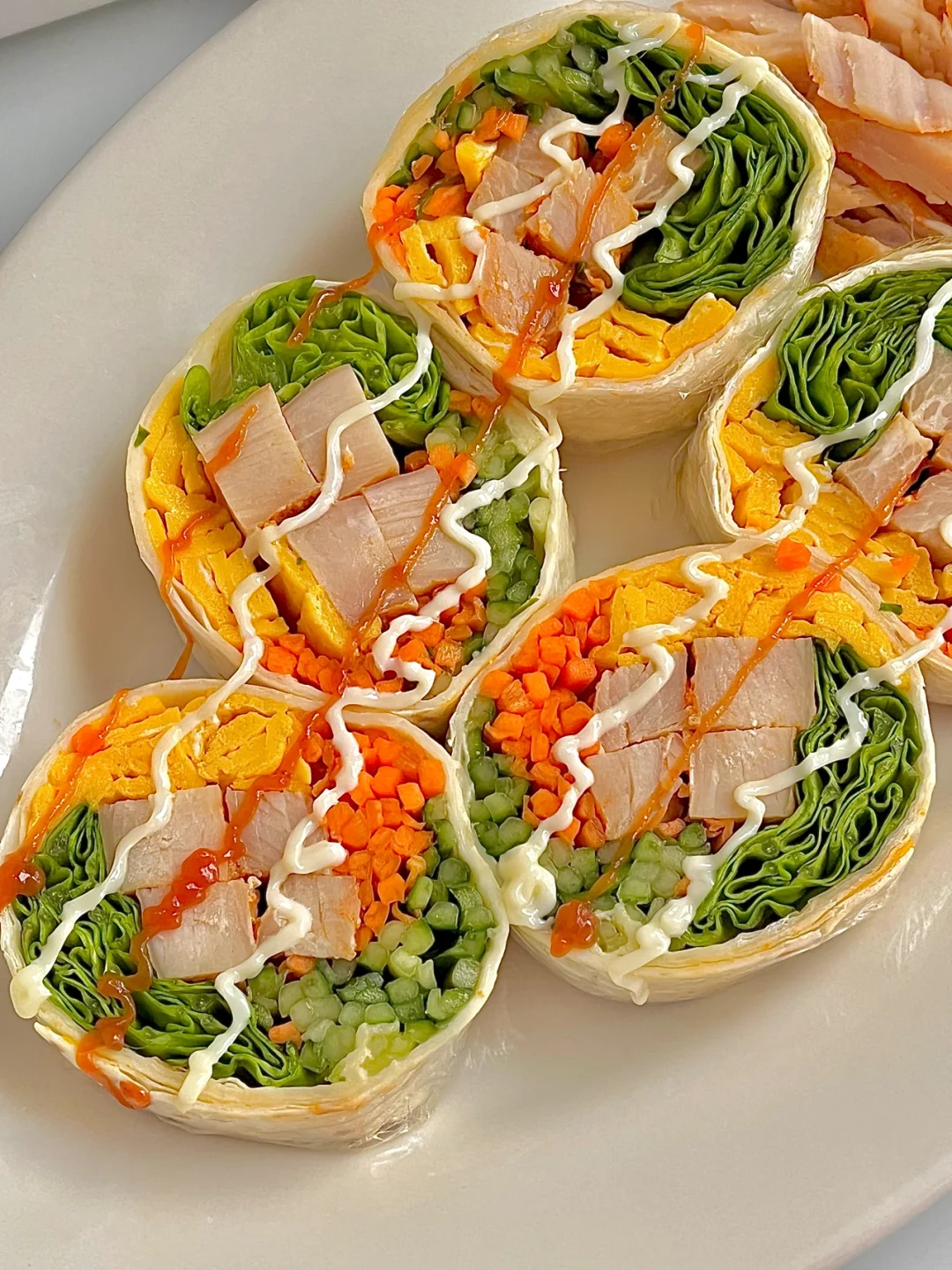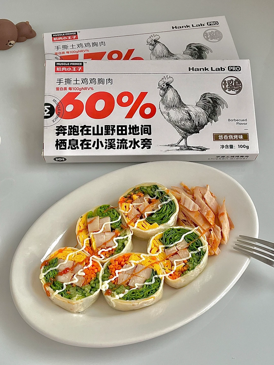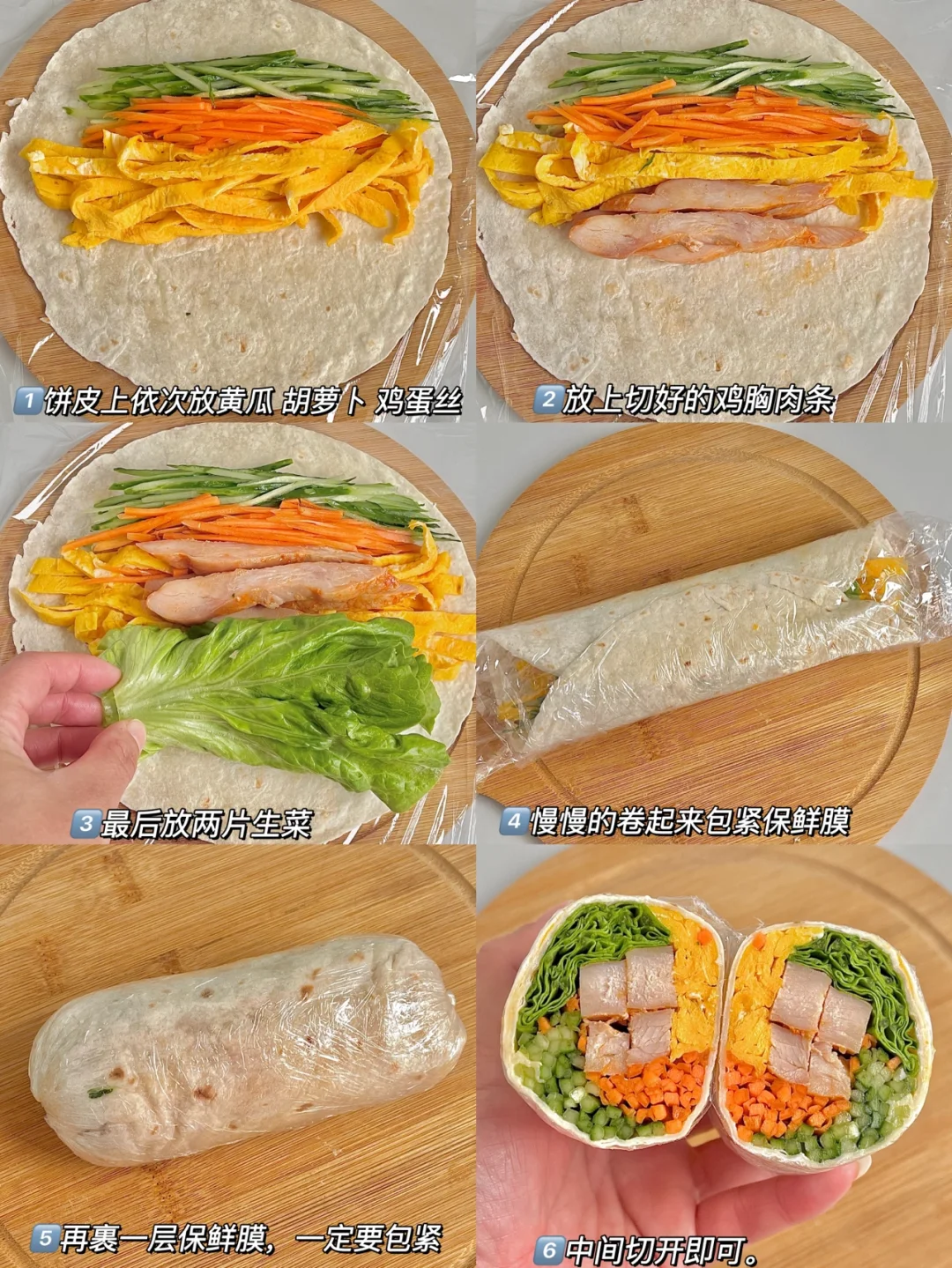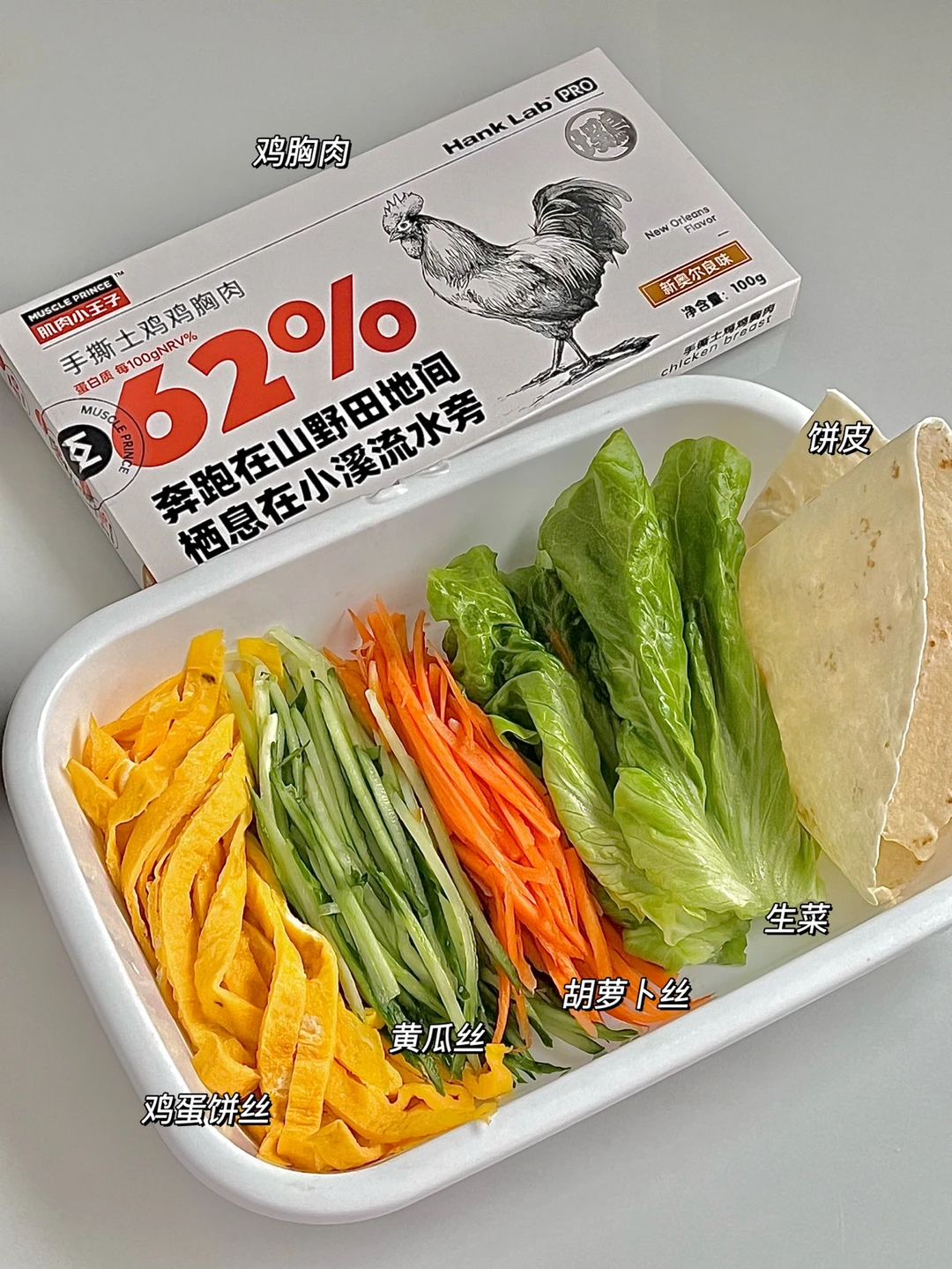🌯配料:黄瓜丝,胡萝卜丝,鸡蛋饼丝,即食鸡胸肉,生菜,全麦饼皮。