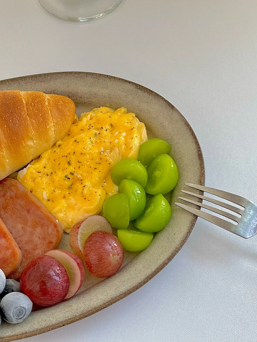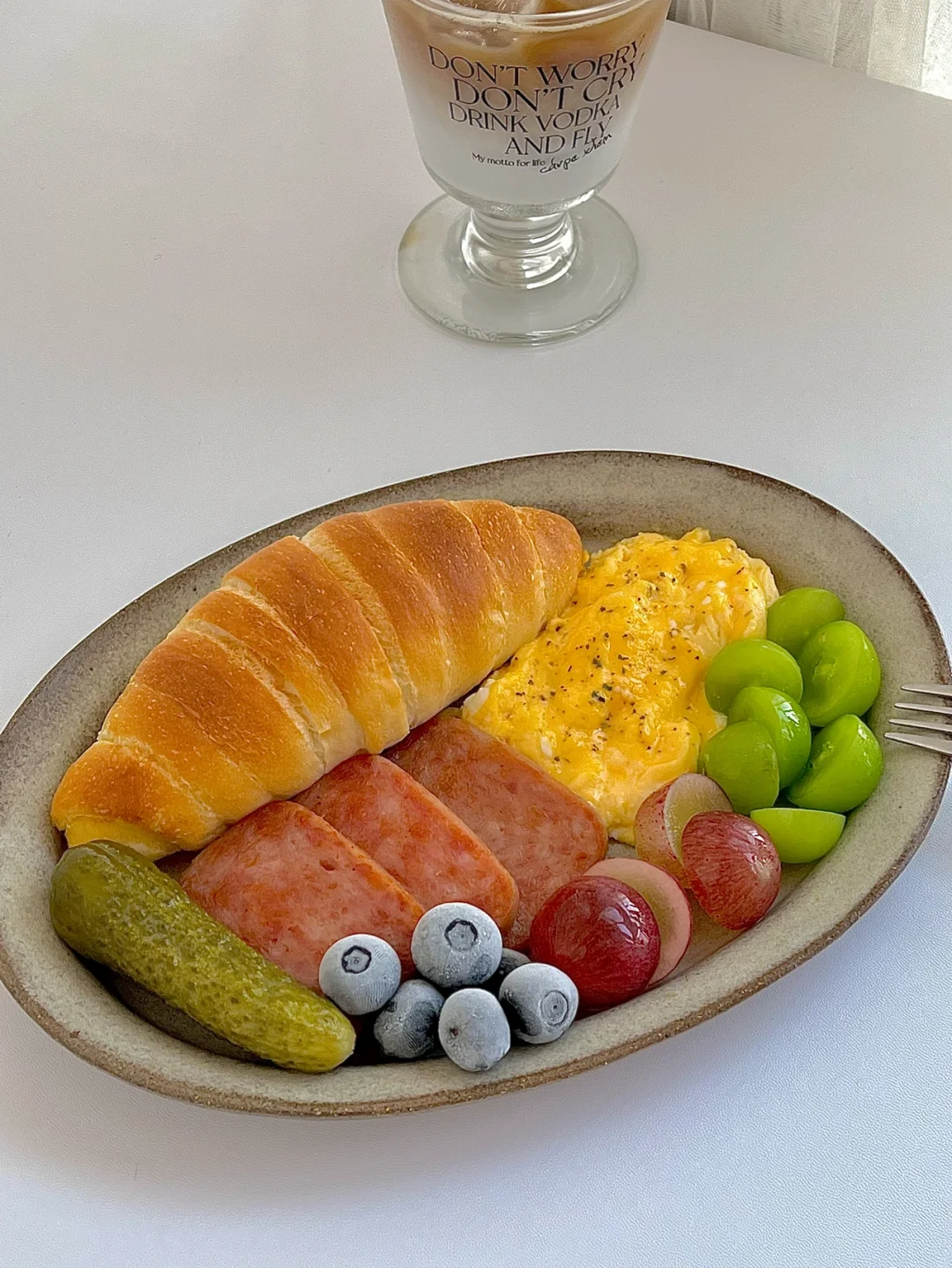 今日份早餐: 盐面包 煎午餐肉 牛奶滑蛋 酸黄瓜 青提 红提 蓝莓 一杯冰拿铁☕️ . 周五喽!满满当当的早餐盘😋 盐面包配着酸黄瓜吃,好好吃