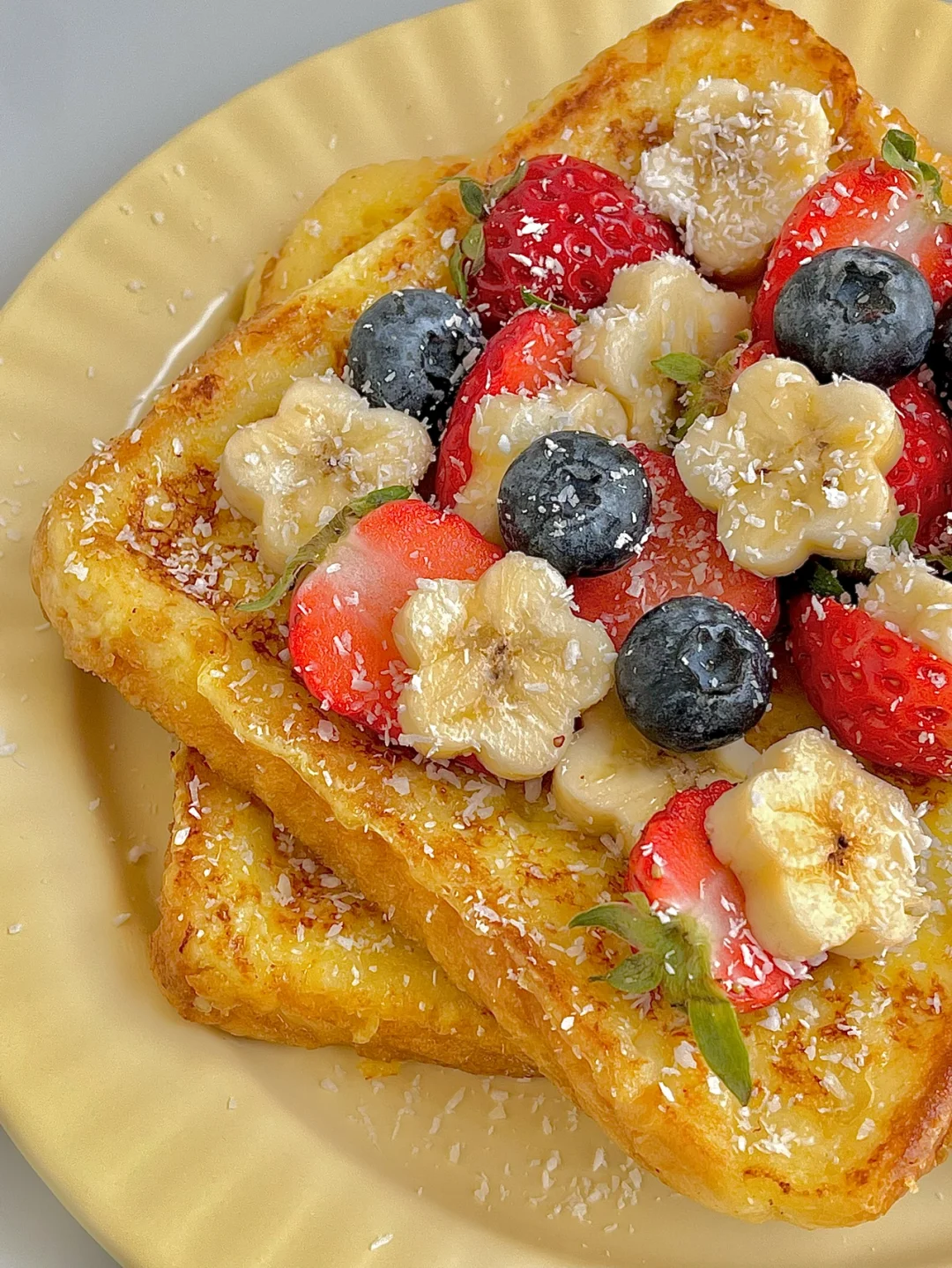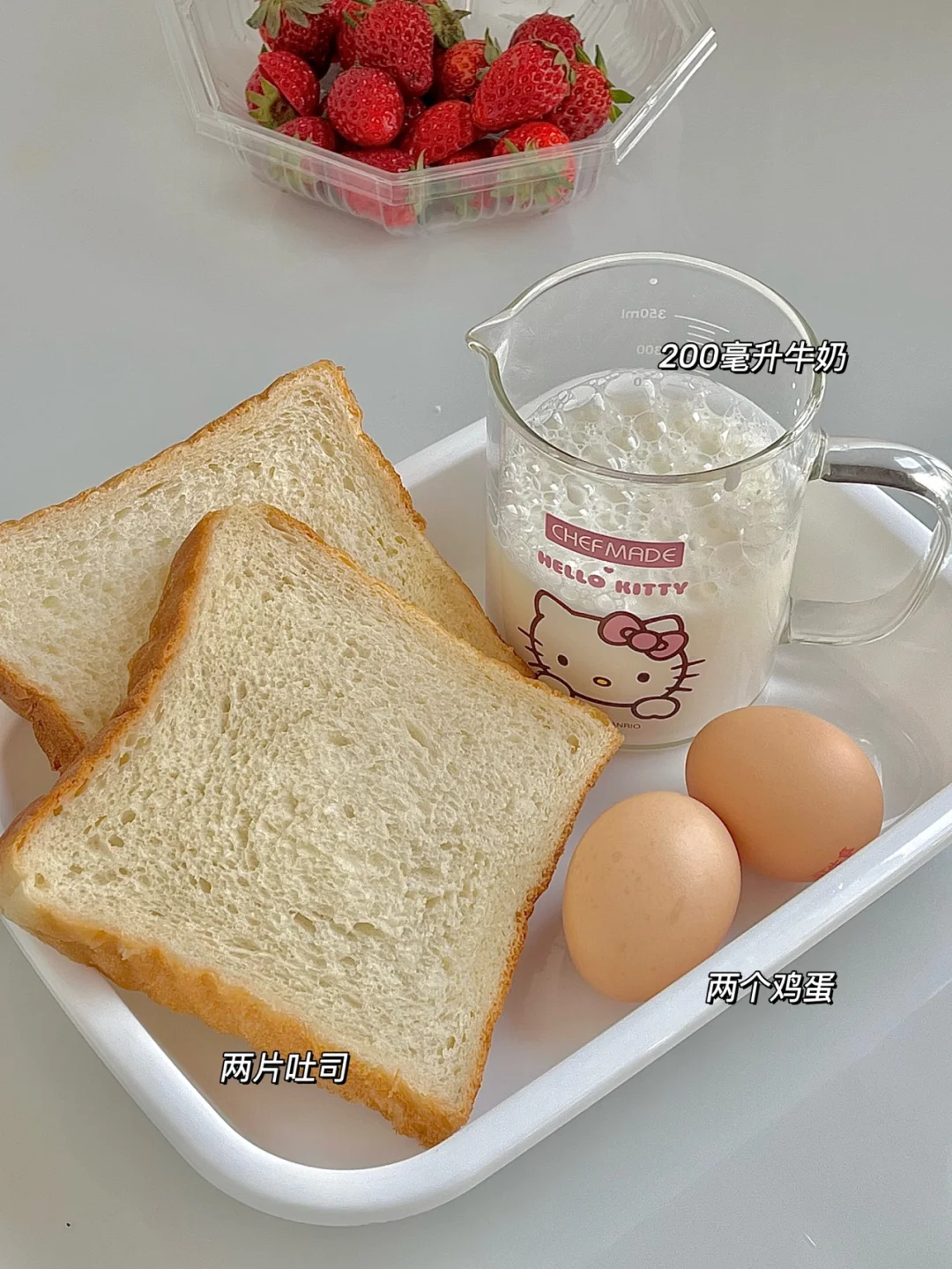 🍞食材:两片吐司,两个鸡蛋,牛奶200毫升,喜欢的水果装饰。