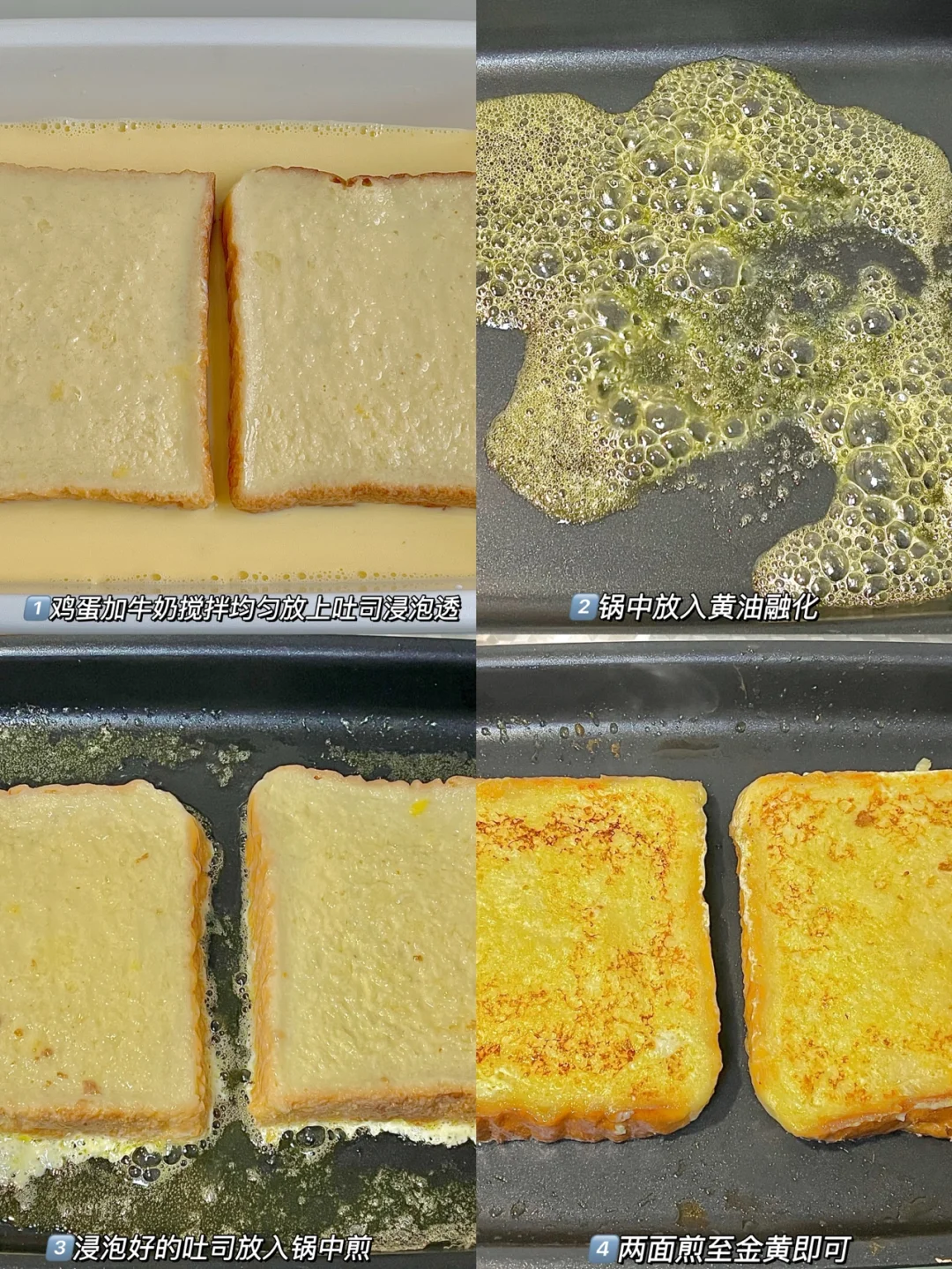 3️⃣浸泡好的吐司放入到融化好的黄油锅中煎至两边金黄即可。不要太大的火哦!