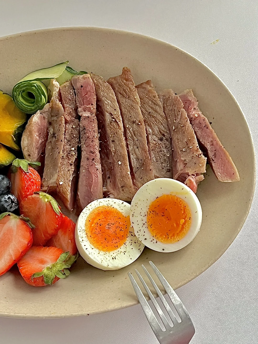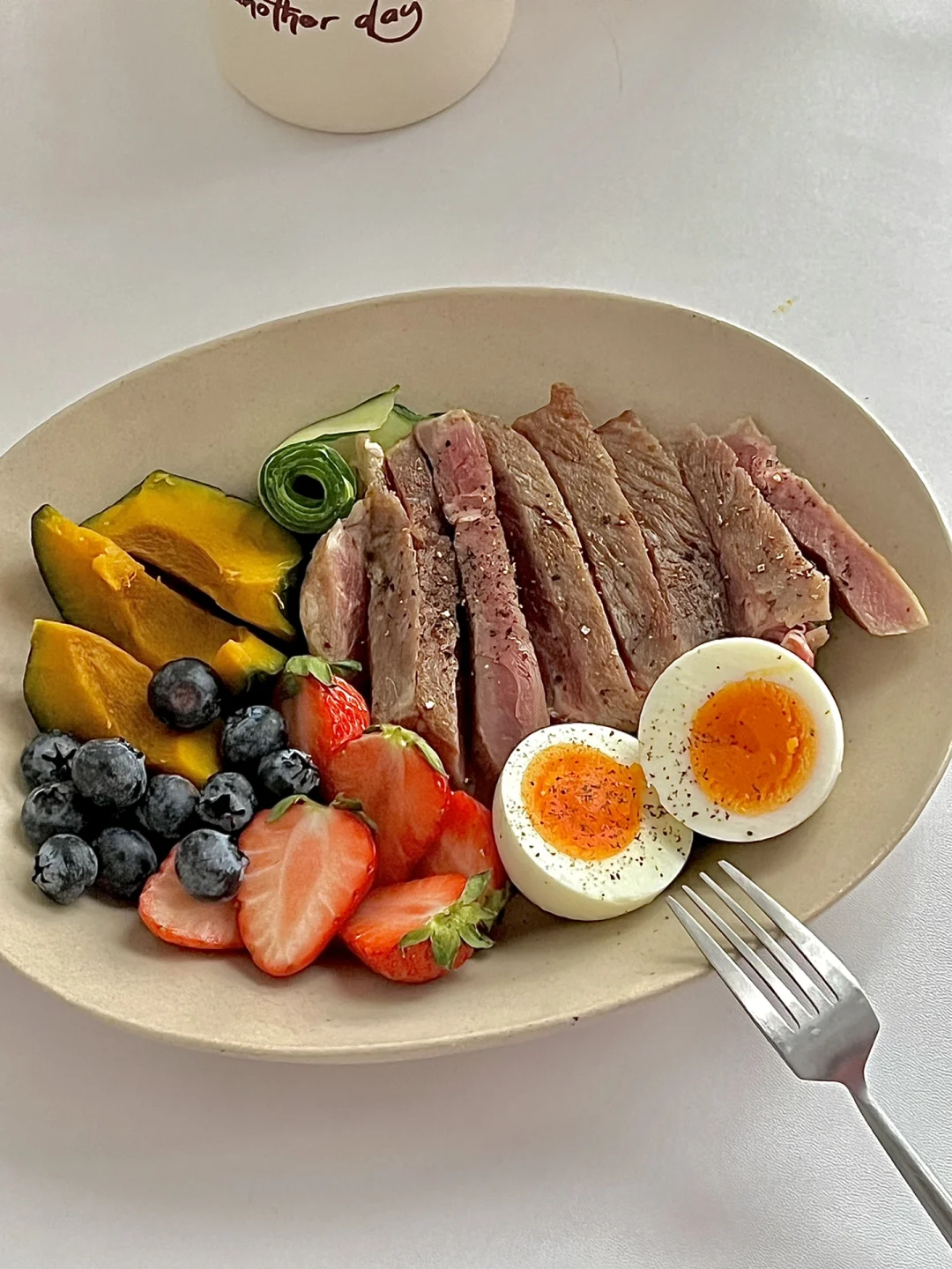 热气腾腾的三餐 今日份早餐分享: 南瓜牛排鸡蛋水果沙拉🥗 一杯美式☕️ . 今天是起晚的早上,做个早餐也是急急忙忙 牛排🥩第一次煎完拍照时才发现煎的太嫩,我不太喜欢这种熟度,然后又重新煎了一下😂 . 昨天没吃够的南瓜,又蒸了两块,真好吃😋 所以今天的早餐很简单,煎个牛排,蒸个南瓜,煮个鸡蛋,(我同时在用三个锅)最后摆上水果ok了。 . 周五了,祝大家都有个好心情呀!