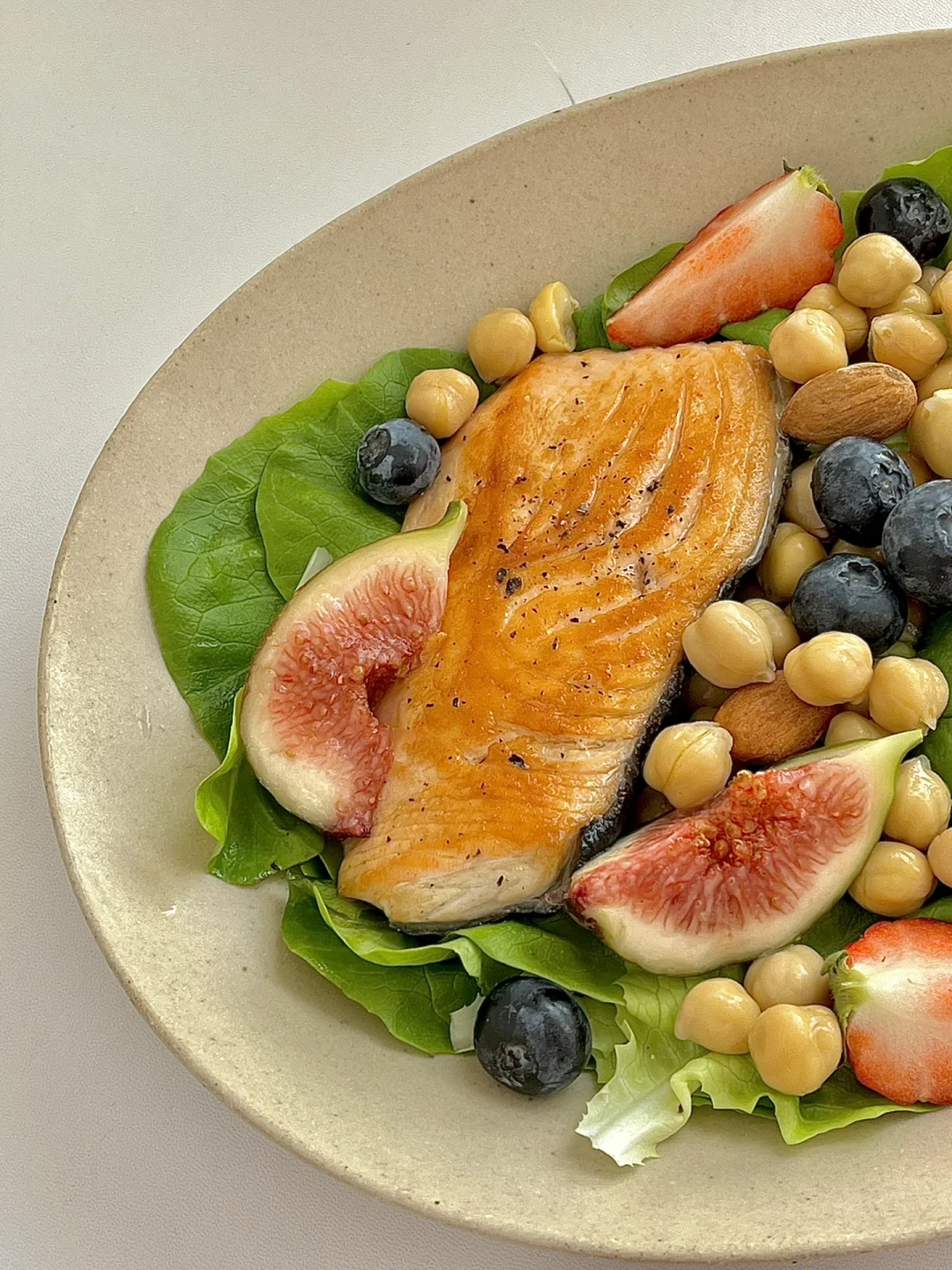热气腾腾的三餐 今日份早餐: 三文鱼牛油果鹰嘴豆水果蔬菜沙拉🥗 一杯美式☕️ . 早上来一碗清爽的沙拉真的很爽口 慢慢的恢复饮食了。对我而言健康的饮食不是什么都不能吃,什么都怕吃,只是吃的多少怎么搭配的问题 . 今天的沙拉🥗好清爽,绿油油春天的颜色 煎个三文鱼,切个牛油果,放上水果蔬菜和鹰嘴豆就完成了,饱腹又好吃😋