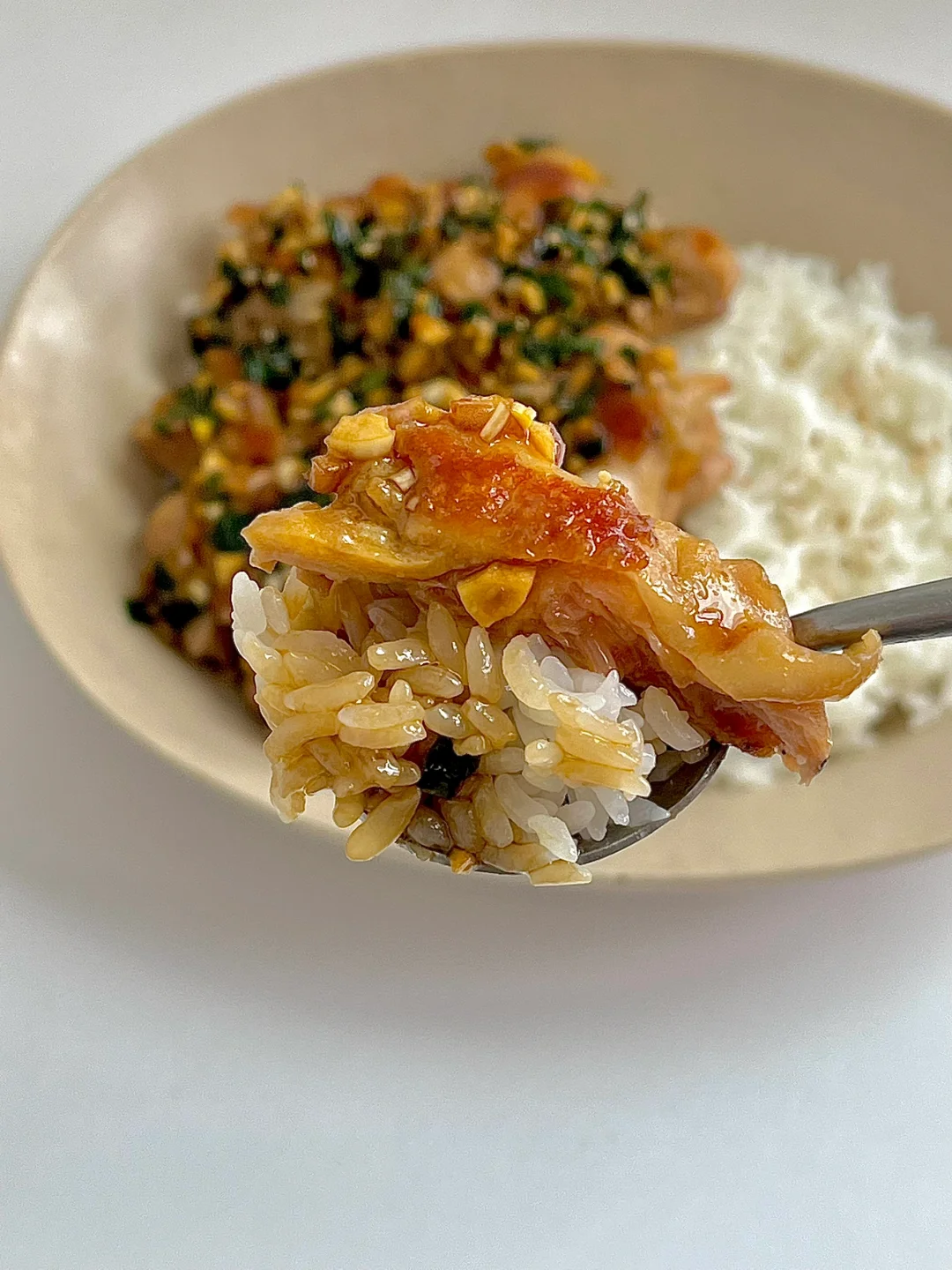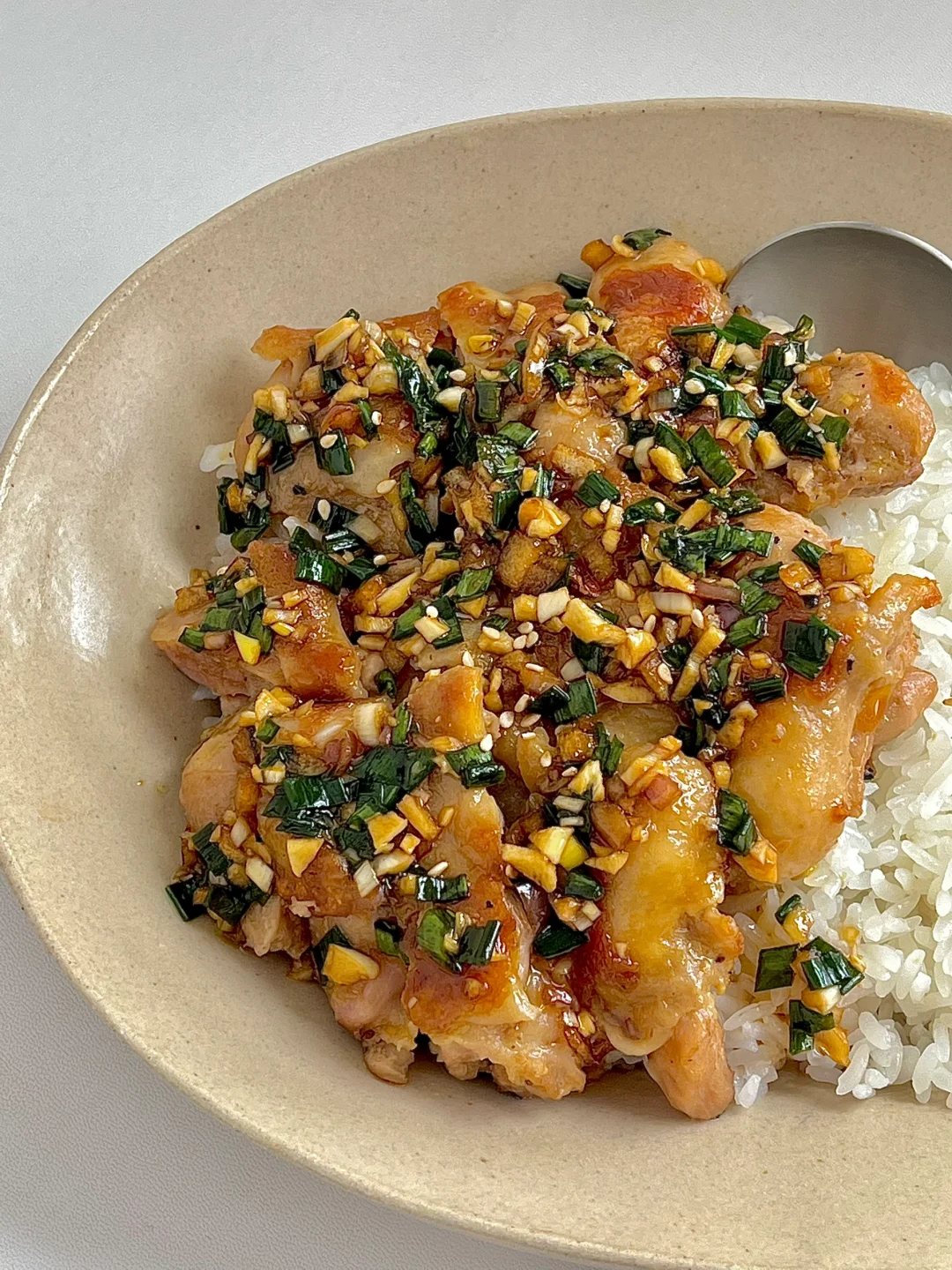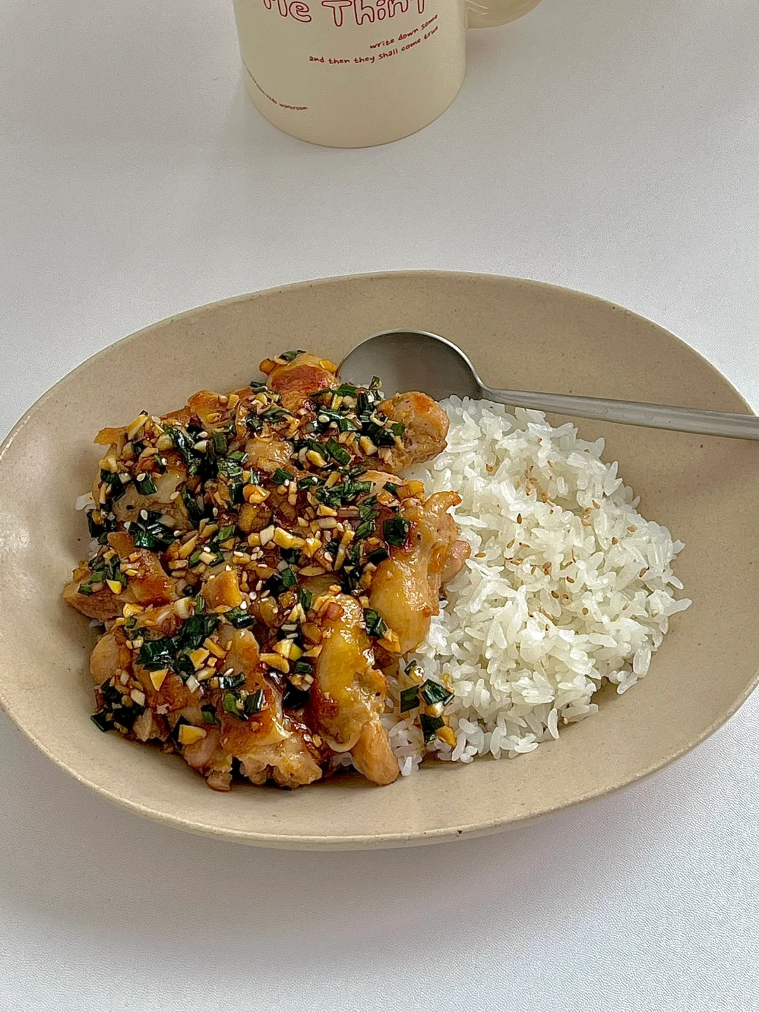 5️⃣鸡腿肉切小块,摆在米饭上,淋上酱汁就可以开吃了😋