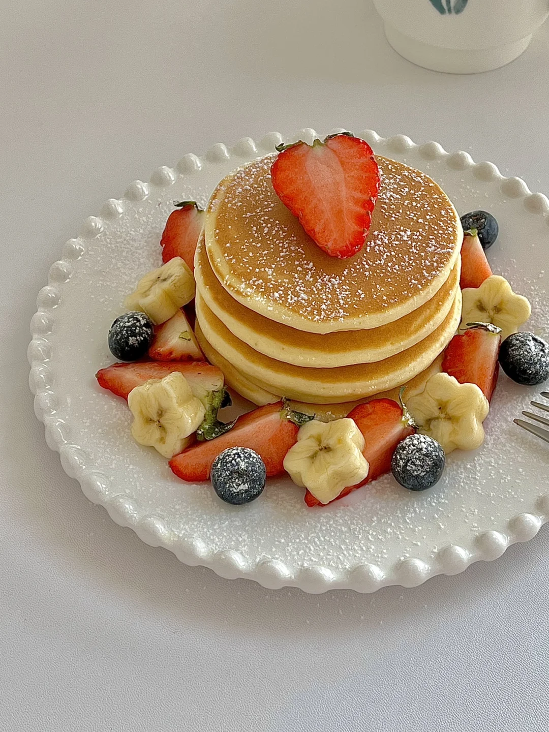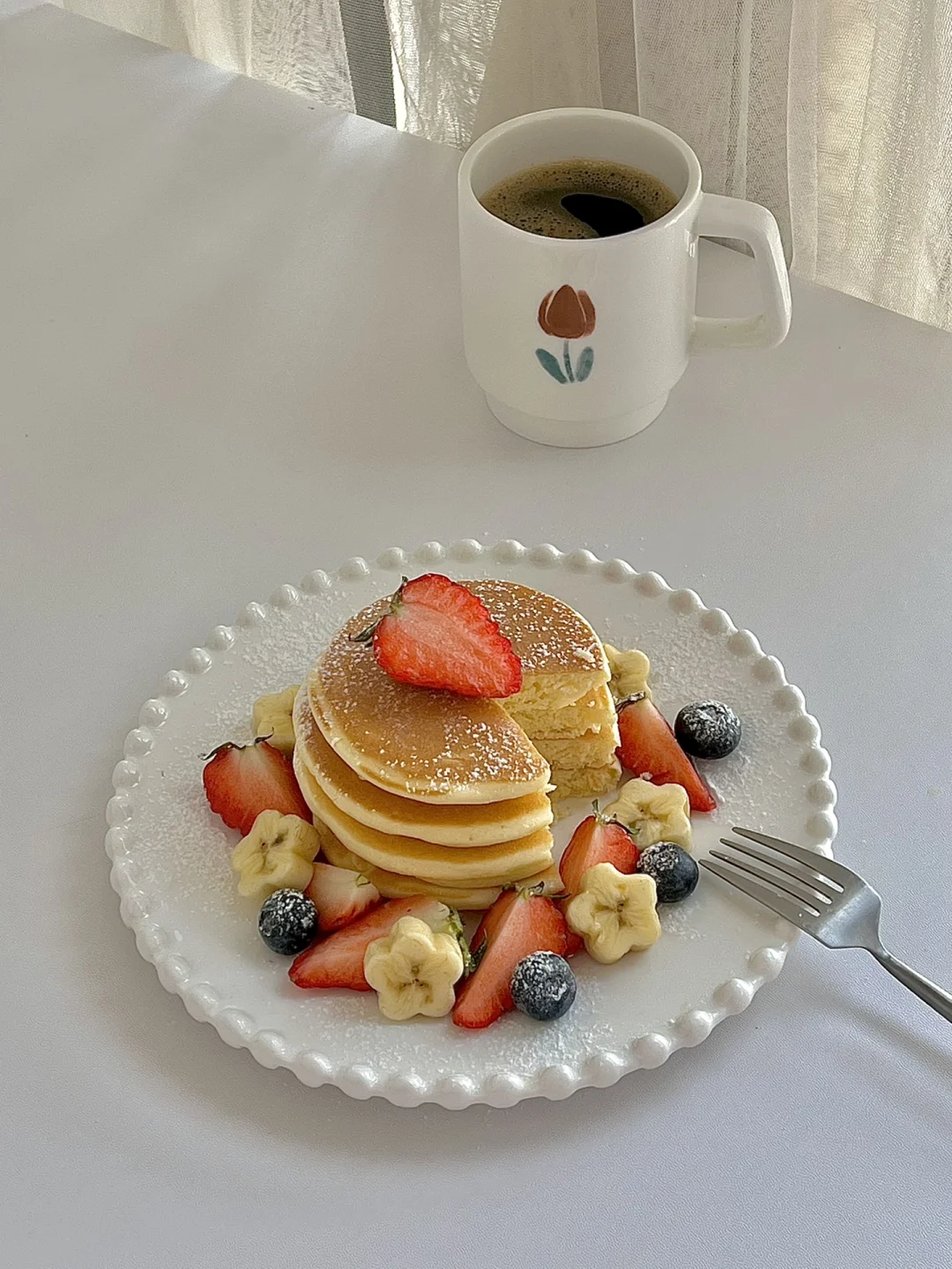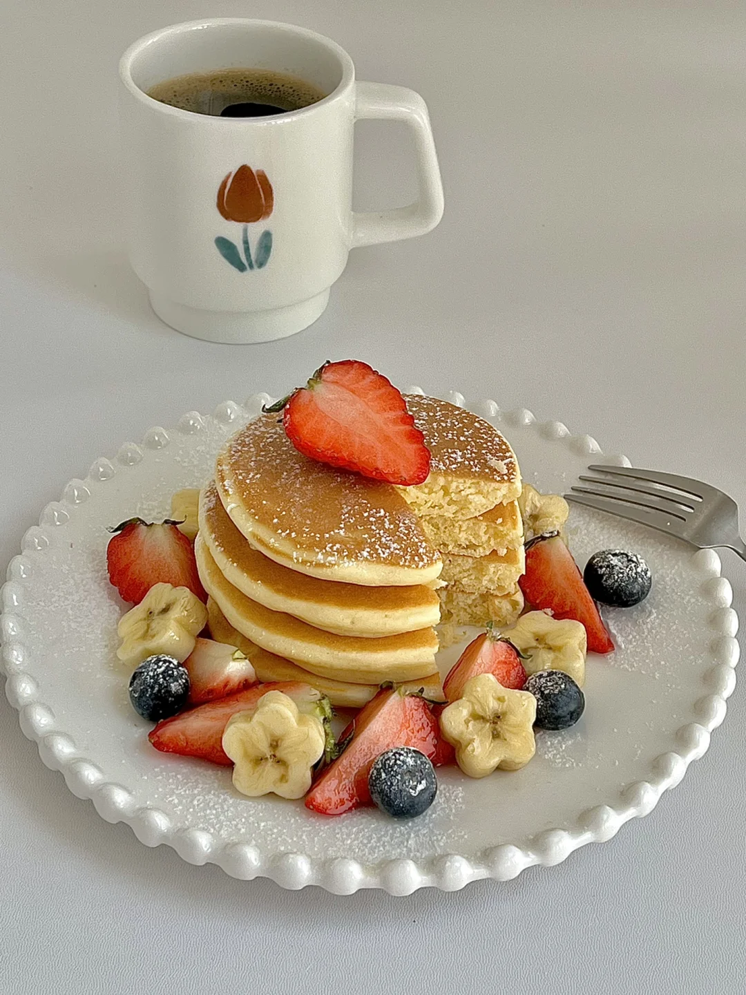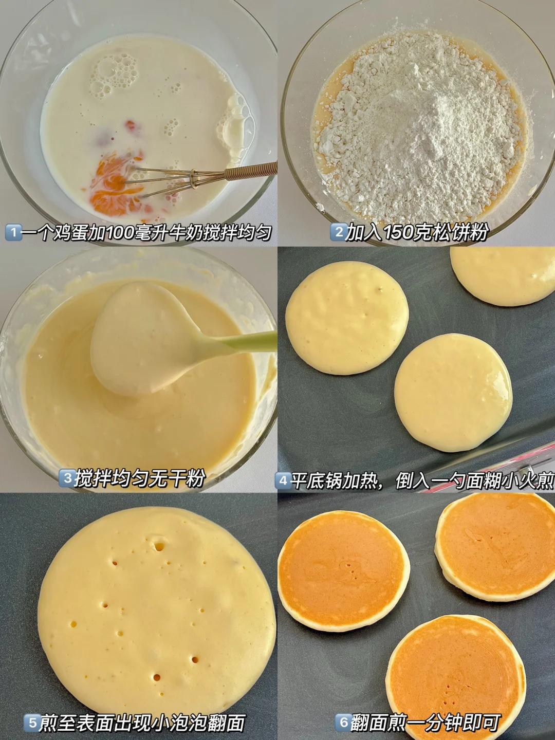今日份早餐分享: 水果松饼🥞 一杯美式☕️ . 祝大家开工大吉🧧 家里的松饼粉都快过期了,赶紧做个好吃好看又简单的的水果松饼吧😋 1️⃣一个鸡蛋加100毫升牛奶搅拌均匀。 2️⃣加150克松饼粉搅拌至无干粉。有颗粒感很好吃 3️⃣锅中不用放油,中火加热后换成小火,用勺子舀一勺面糊,从高处低落面糊,这样松饼比较圆。 4️⃣煎至出现小气孔后大概3分钟,翻面再煎1分钟。 5️⃣出锅摆上水果撒点糖粉,还可以来点蜂蜜。 . 松饼粉做出来的松饼比较蓬松,也很好吃😋 年后第一天上班,有点不适应了!