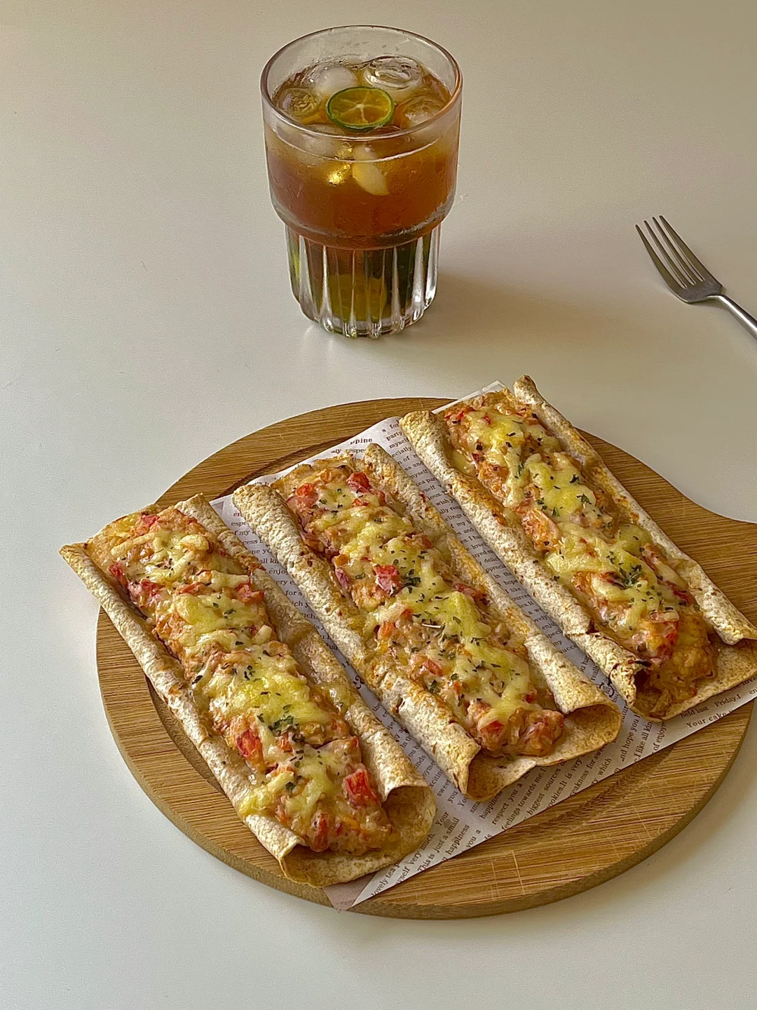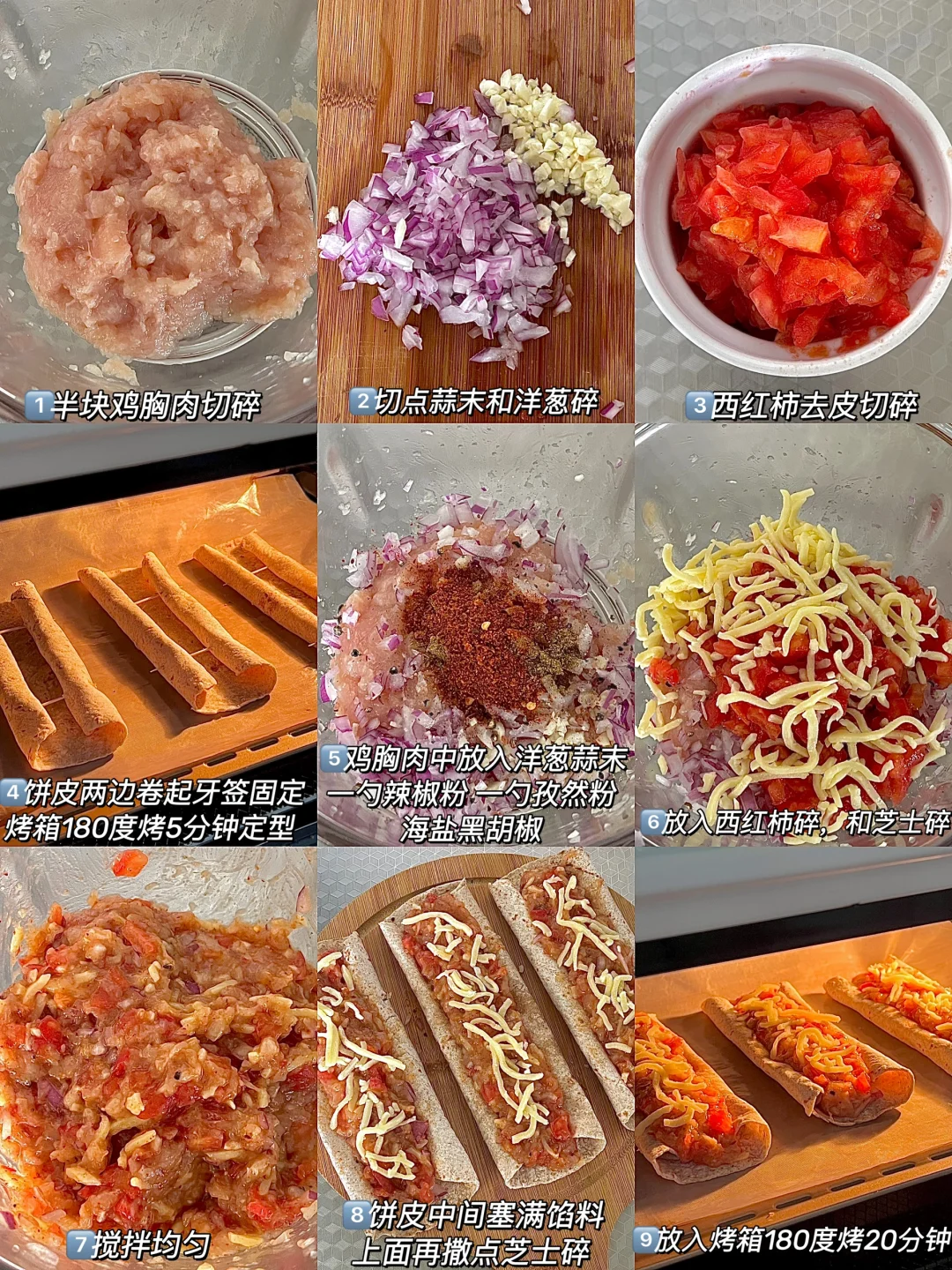 热气腾腾的三餐 今日份早餐分享: 鸡胸肉番茄芝士卷饼 一杯柠檬红茶🍵 . 1️⃣半块鸡胸肉切碎,洋葱和蒜末切碎。 2️⃣西红柿去皮切碎。 3️⃣全麦饼皮两边卷起,用牙签固定,放入烤箱180度烤5分钟定型后拿出。 4️⃣鸡胸肉中放入洋葱和蒜末,放海盐黑胡椒,一片辣椒粉,一勺孜然粉,再放入西红柿丁和芝士碎。 5️⃣搅拌均匀后,把馅料塞入饼皮中间,撒上芝士碎。 6️⃣放入烤箱中180度烤20分钟。 . 家里的饼皮吃不完,又新学了吃法,低卡简单又好吃,就是吃了一个有点吃不够,哈哈