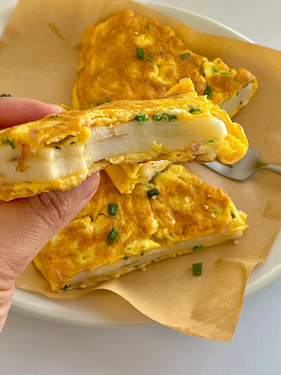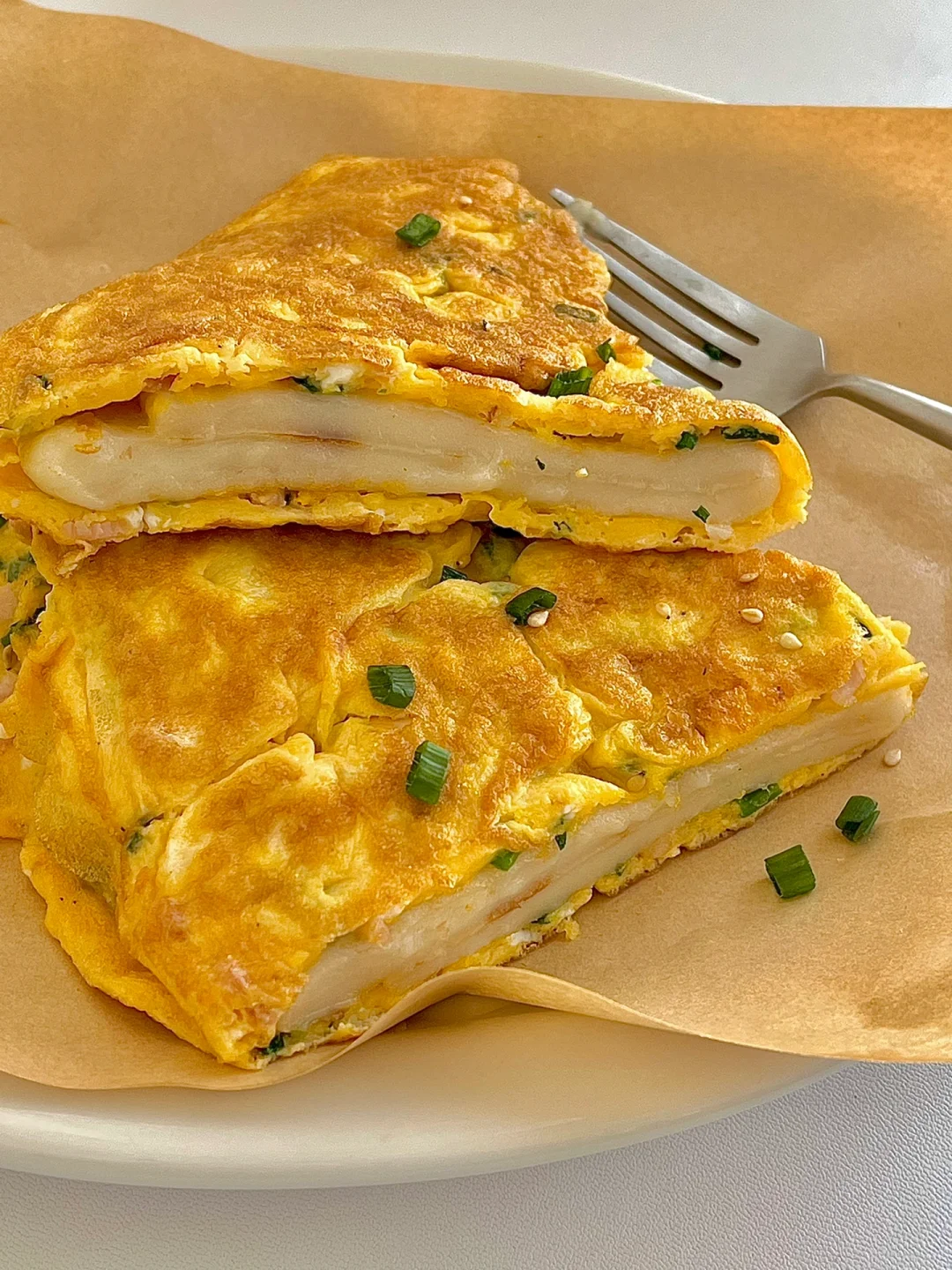 5️⃣中间对折把鸡蛋煎熟即可。出锅切开就可以吃了。