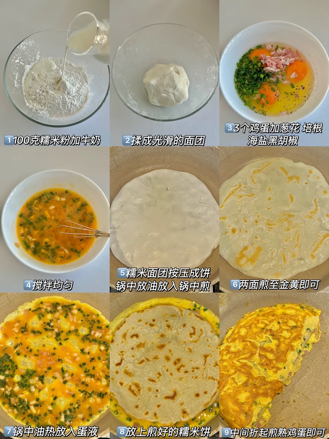 食材:糯米粉100克,牛奶90克左右,鸡蛋三个,葱花适量,培根一块