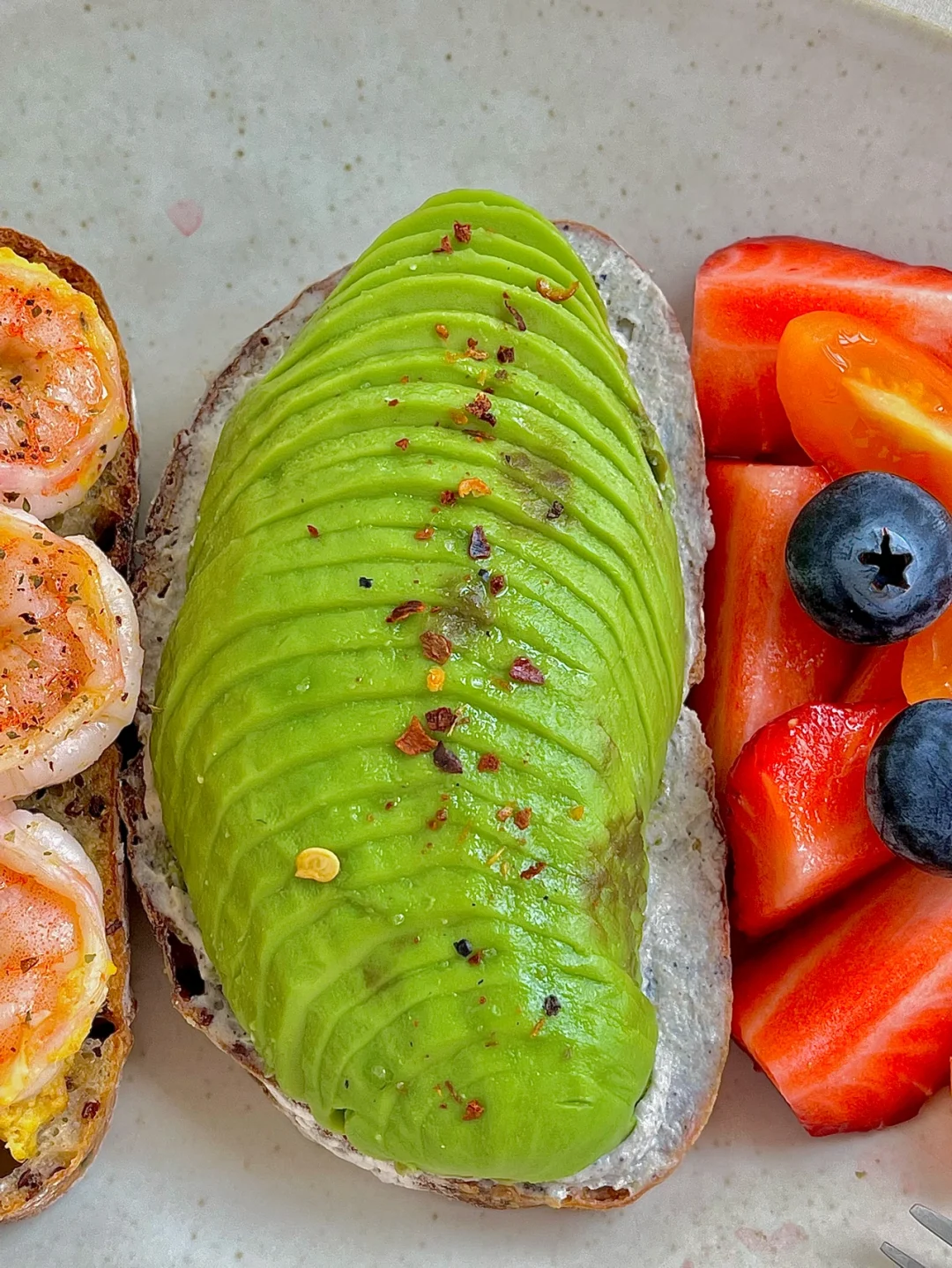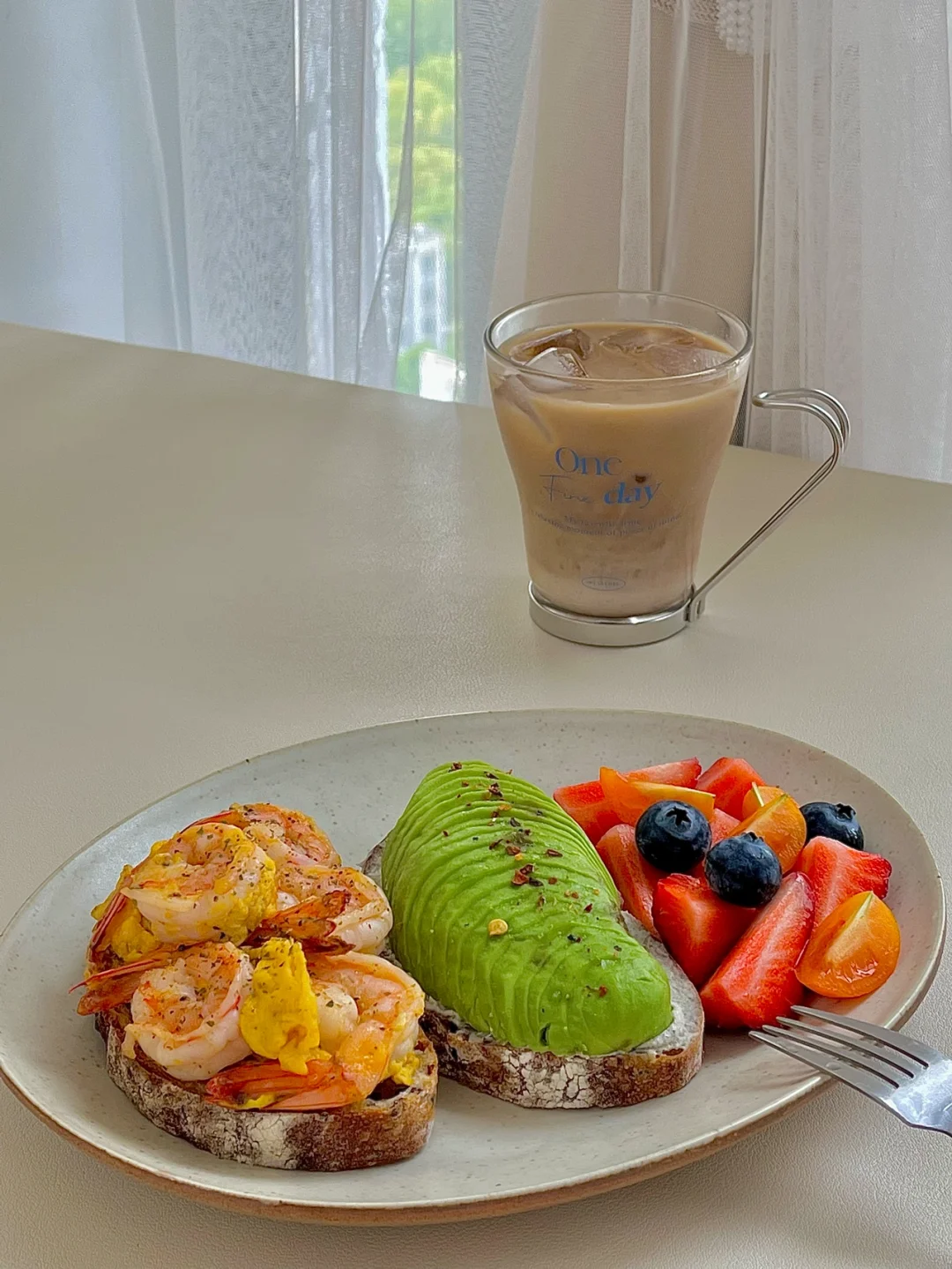 本来要做双拼的,摆盘的时候发现还有空间不能浪费了,就出现了一个没有面包开放式😂 . 虾仁滑蛋的真的好好吃,都没吃够呢 今天的牛油果又不是很好,不过吃着还不错的 今天是补班的一天,其实真的不想这样上班,我宁愿五一的时候就放一天假😂