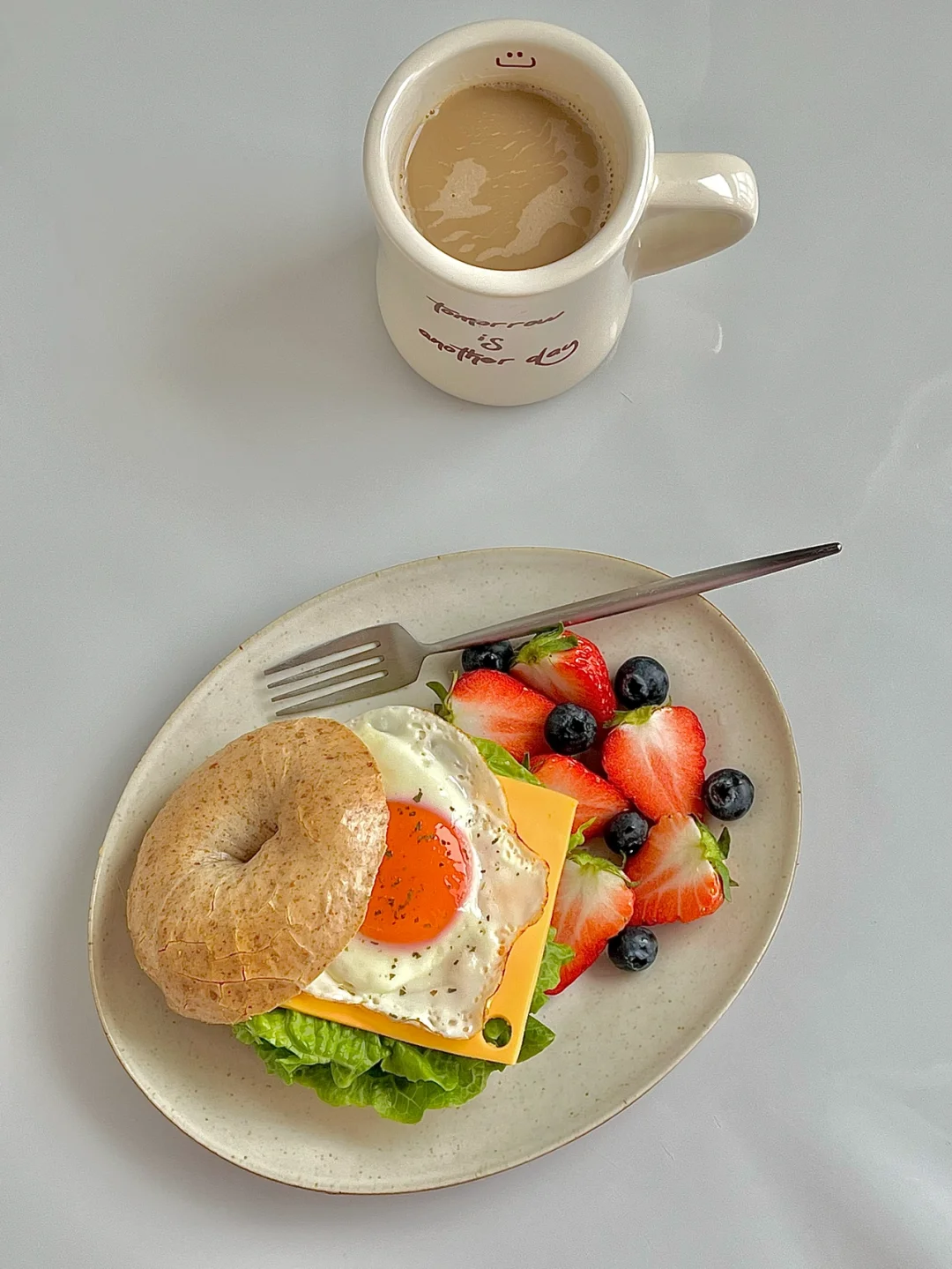 今日份工作日早餐:全麦贝果鸡蛋芝士三明治,草莓,蓝莓,一杯热拿铁☕️ . 今天是情人节,希望大家都能有情人终成眷属,下班了好好去过二人世界吧[偷笑R],就跟我这个老阿姨没什么关系了,对我来说就是个普通的一天。继续努力搬砖吧[偷笑R]