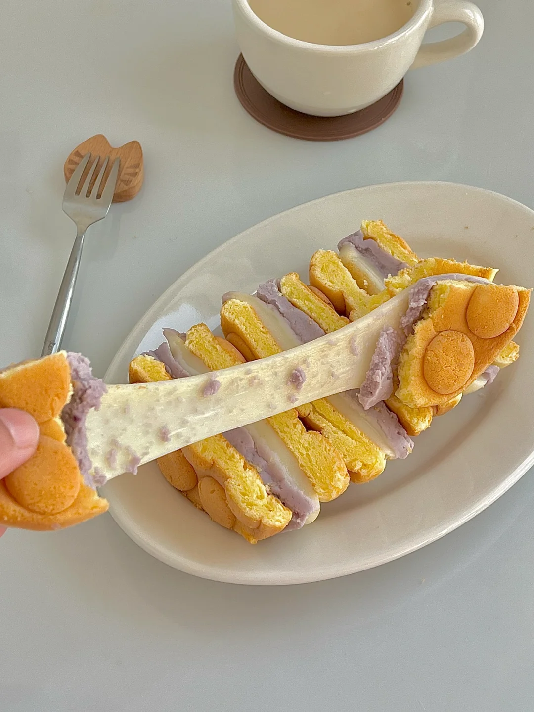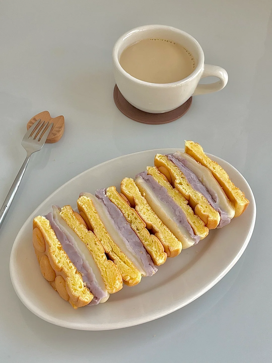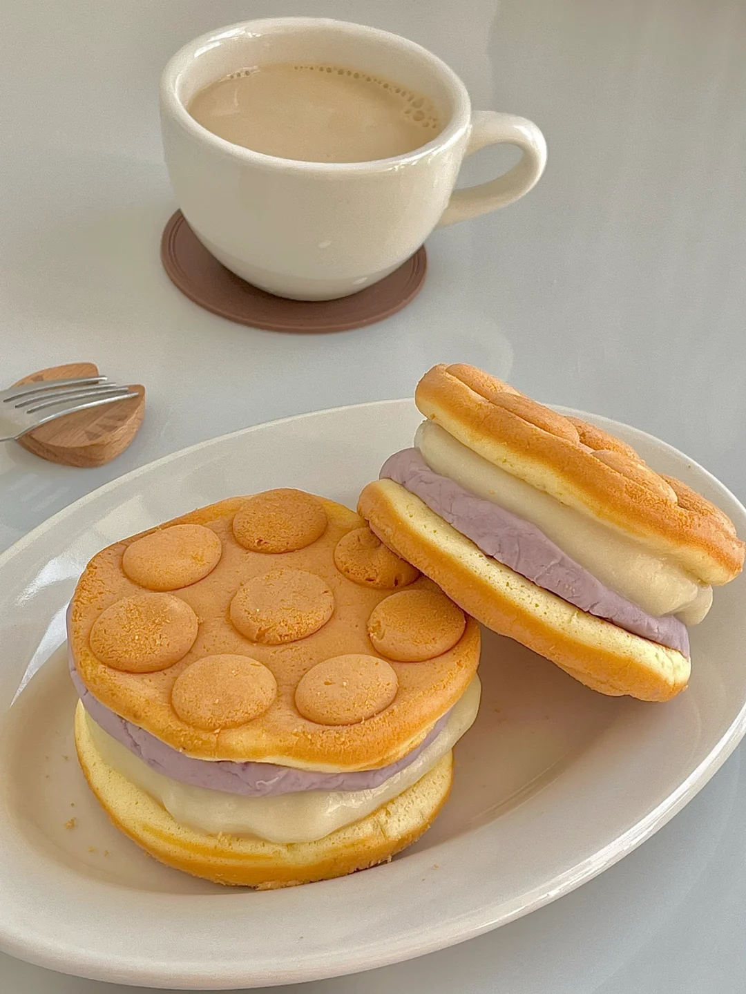今日份早餐:糯唧唧鸡蛋仔芋泥麻薯,一杯热燕麦拿铁☕️