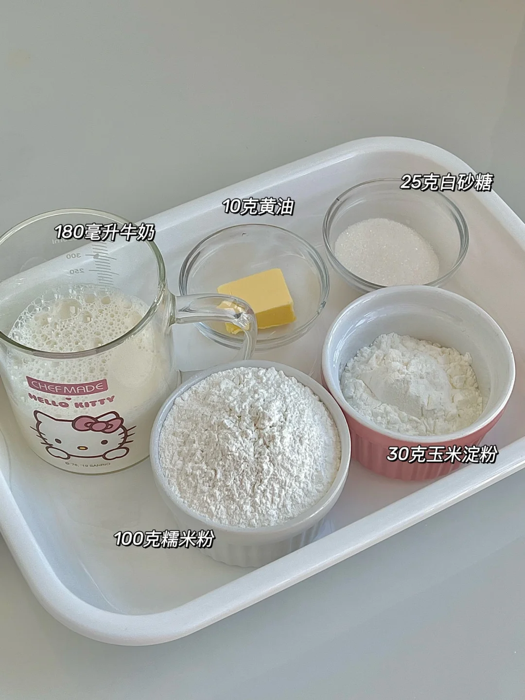 100克糯米粉,30克玉米淀粉,白砂糖25克,牛奶180毫升,黄油10克