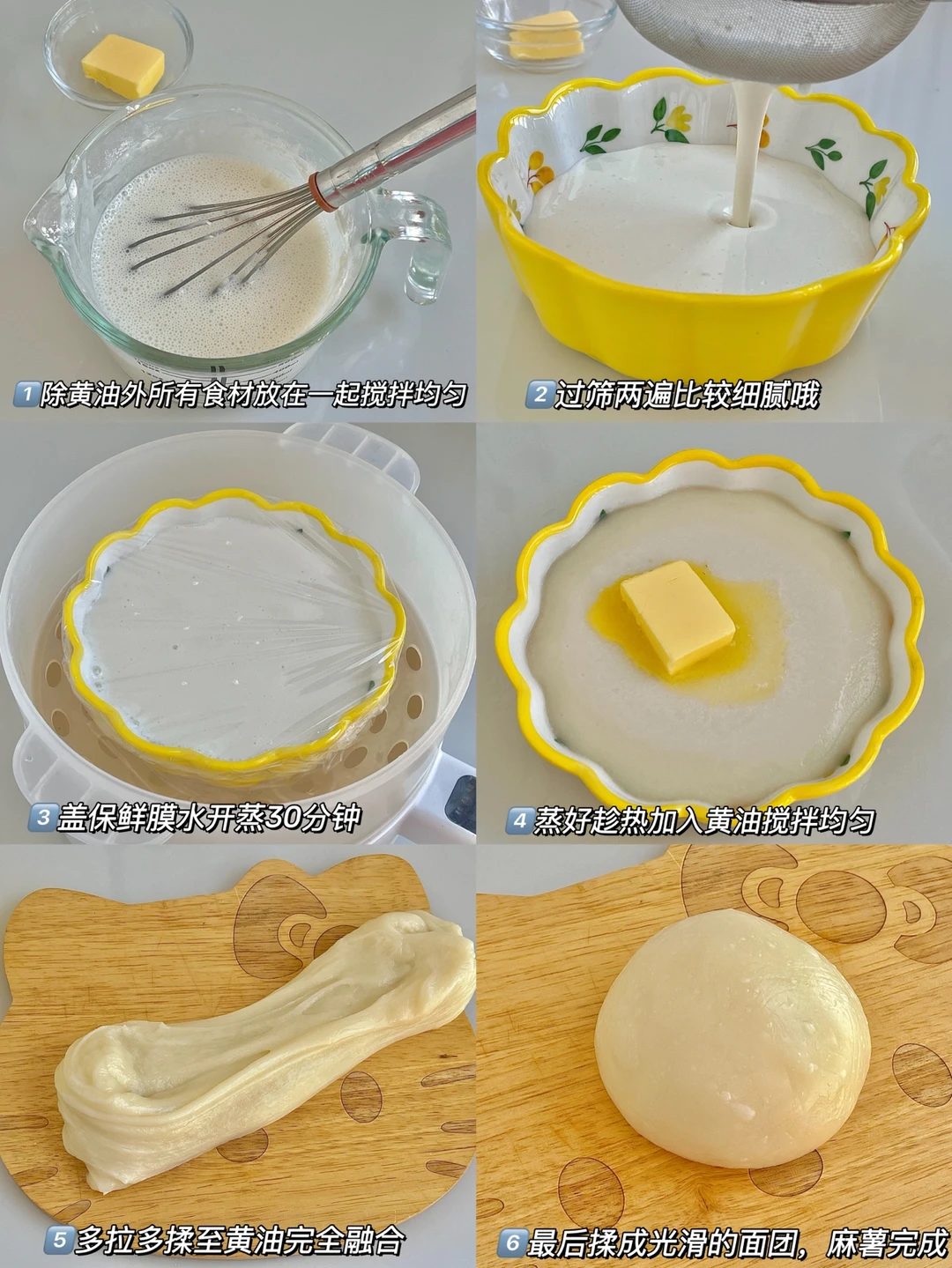 6️⃣揉成光滑面团,保鲜膜包好防止变硬。用的时候分成小份即可。