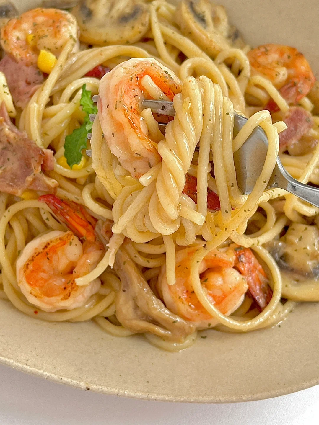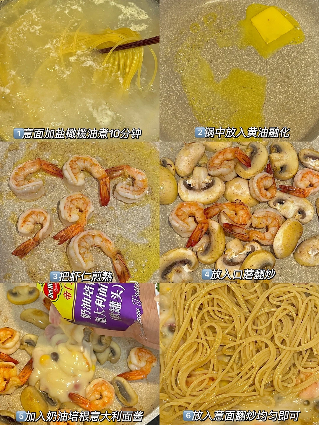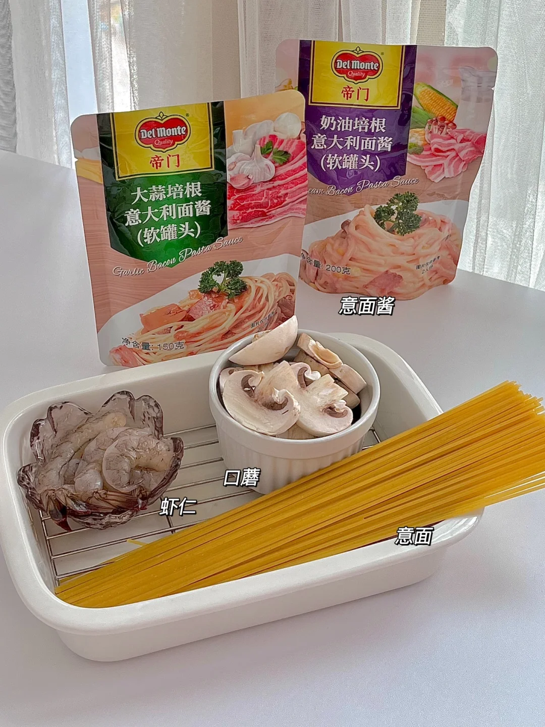 食材:意面 奶油培根意大利面酱 虾仁 口蘑