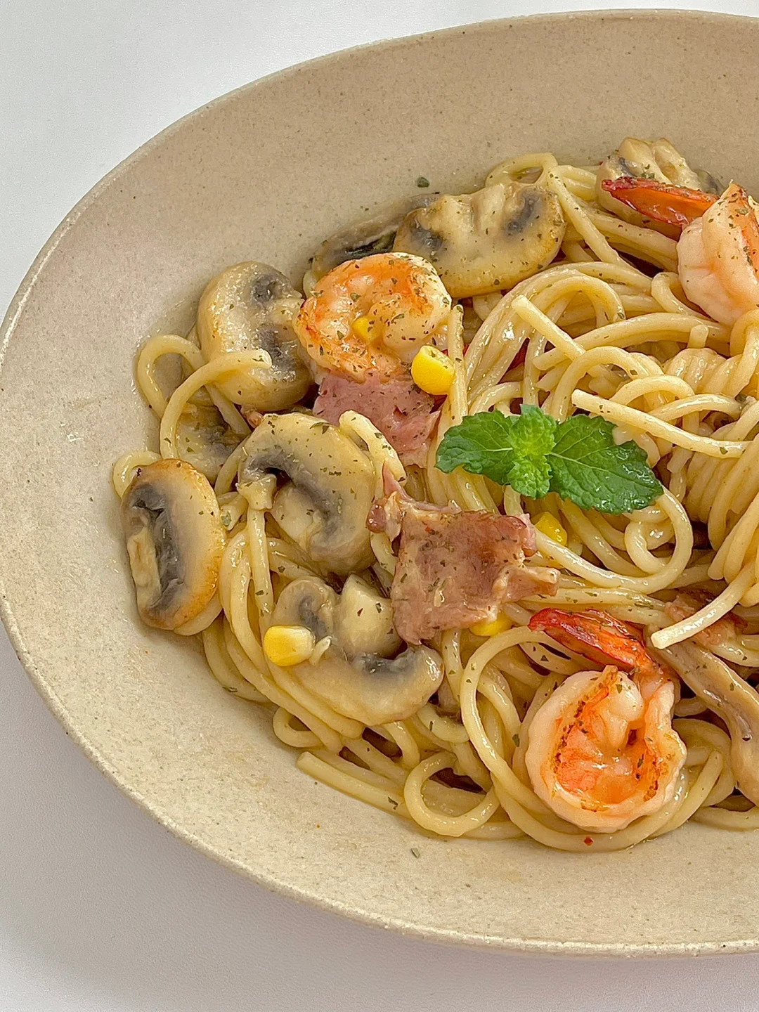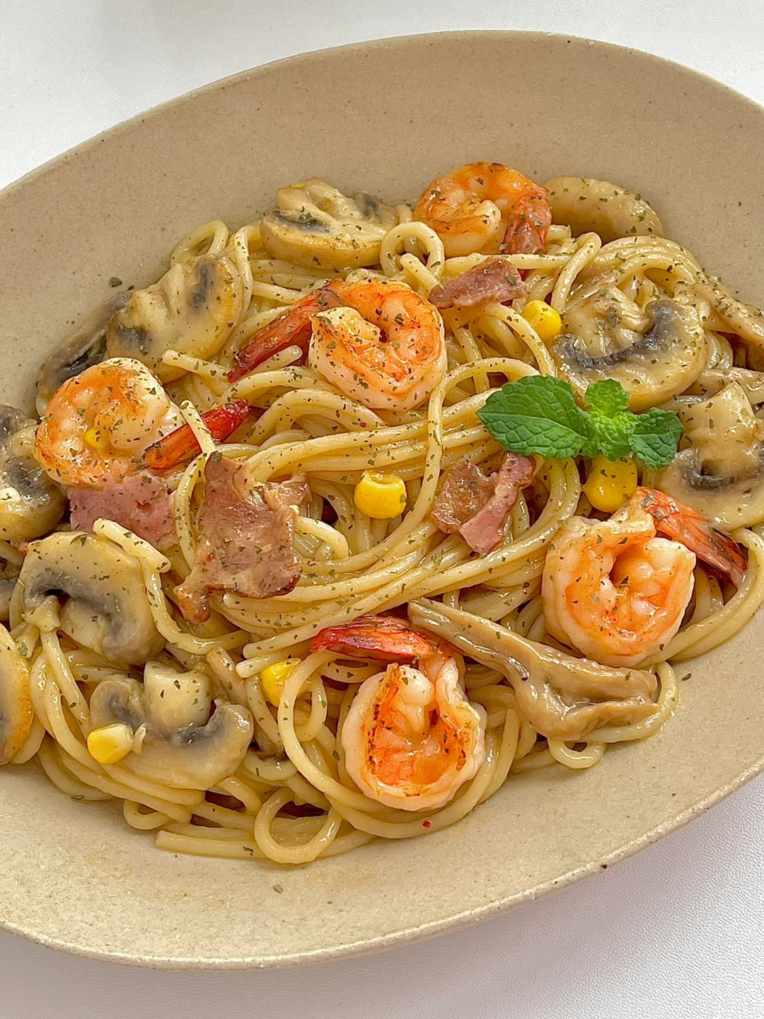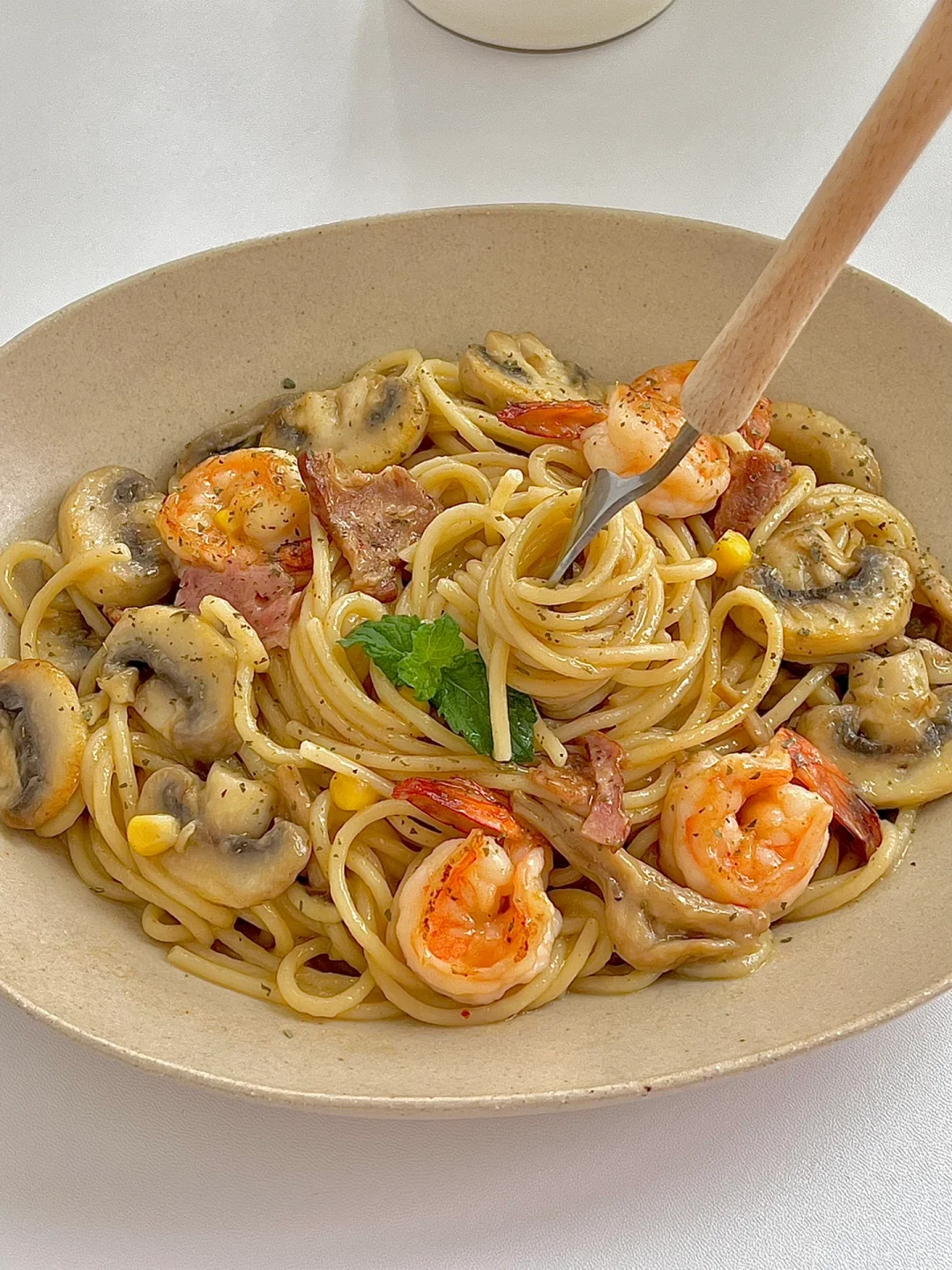 食材:意面 奶油培根意大利面酱 虾仁 口蘑