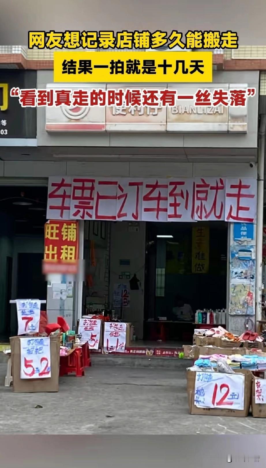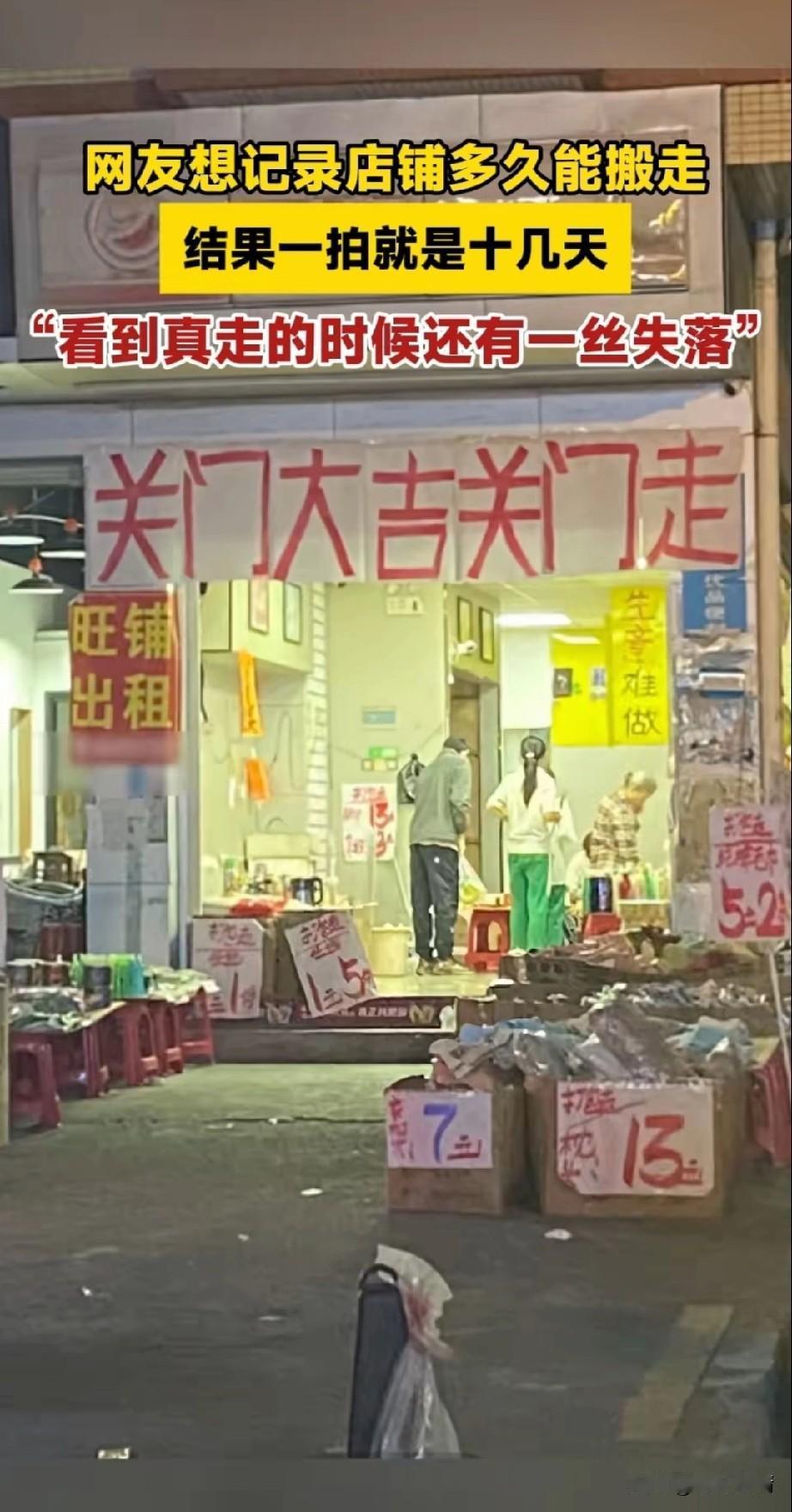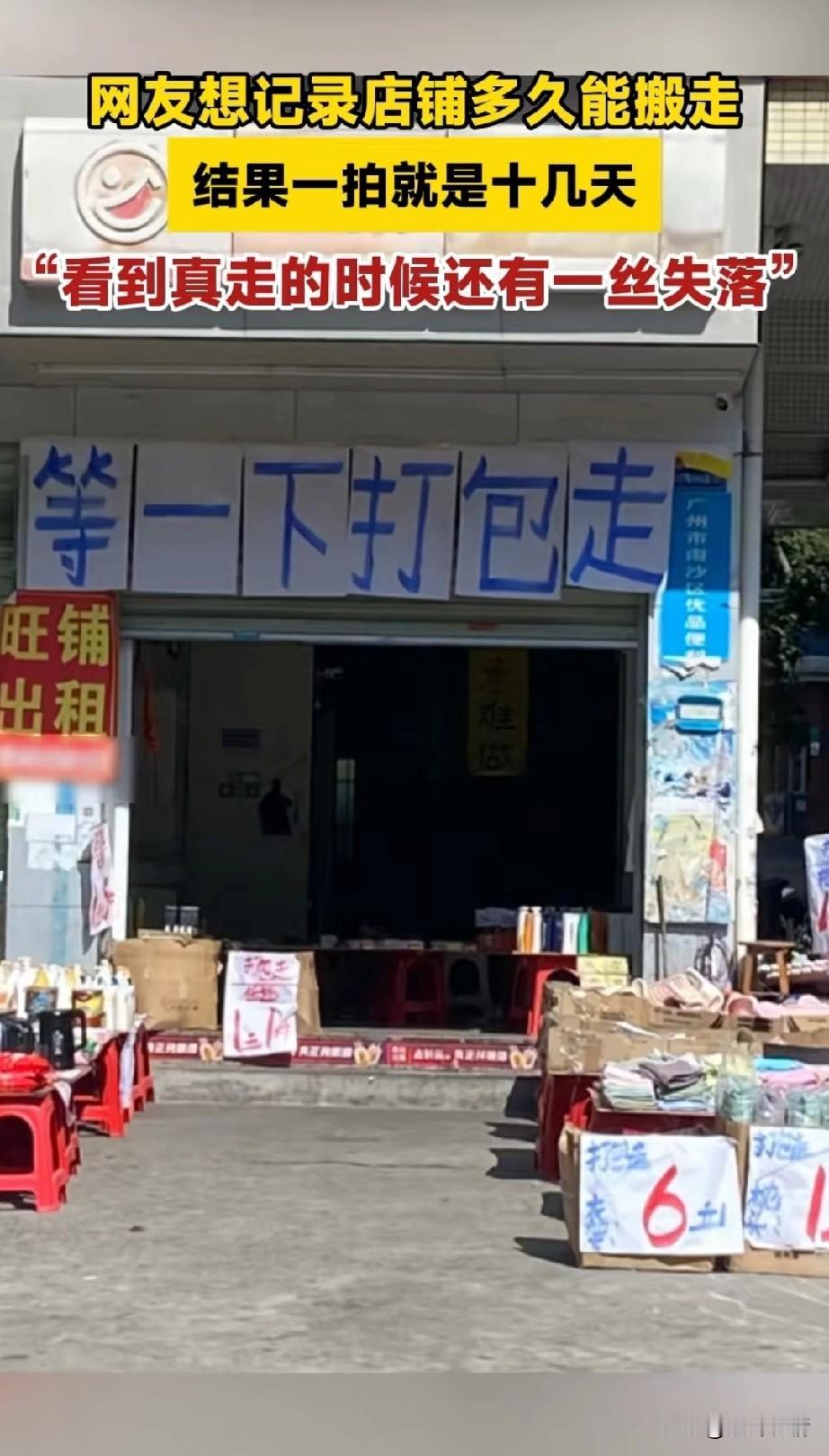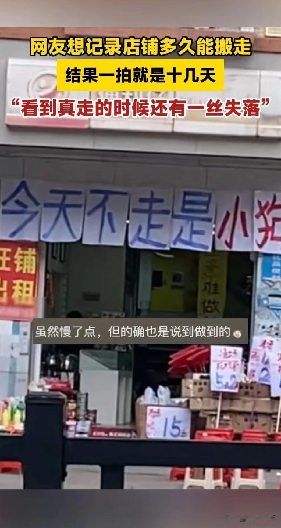 网友看见了一家要搬走的杂货店, 想记录一下他什么时候能够搬走, 看到他的横幅写着今晚交铺退场搬走, 结果第二天去看的时候, 横幅换成了今晚10点全场搬走, 第三天去看的时候, 横幅变成了最后3小时关门, 第四天横幅又变成了, 车到打包,车到就走! 第五天横幅又换成了今天不走是小狗, 第六天横幅是拜拜打包回家, 第七天横幅是关门大吉,关门走, 第八天横幅是车票已定,车到就走, 第九天横幅是等一下打包就走, 第十天横幅是告别南沙,再见! 第十一天朋友再去看的时候已经真走了,今年生意不是很好干, 很多小店铺都关门了, 这老板估计也是商品卖不出去, 于是就关门回老家了, 可以看得出来后续都是在清理库存, 大家对于这样清理库存的套路怎么看? 甩货撤店 商铺撤柜 店面喜迁 店铺打包拆除 店铺结业拆除 店铺整体搬迁
