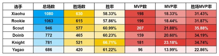 Xiaohu拥有最高场数和胜场数、Scout拥有最高MVP数和胜场MVP率、Knight拥有最高胜率和最高MVP率。Yagao是六人中最“绿叶”的中单。