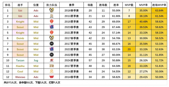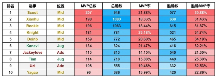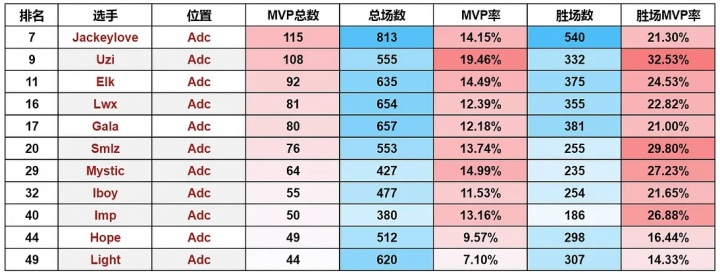 Jackeylove拥有最高MVP数、最多总场数和最多总胜场数,Uzi拥有最高MVP率和最高胜场MVP率。