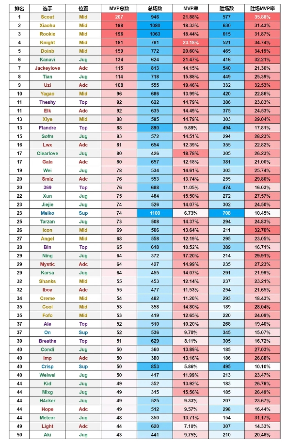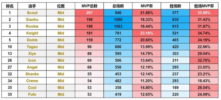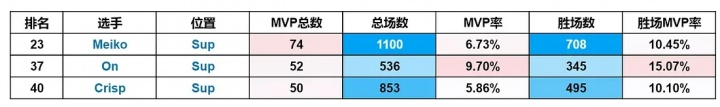 Meiko拥有全位置最高场数和胜场数,On拥有最高MVP率和胜场MVP率。