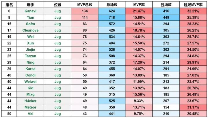 Kanavi拥有最高MVP数、最高MVP率和最高胜场MVP率,Tian拥有最多总场数和最多胜场数。